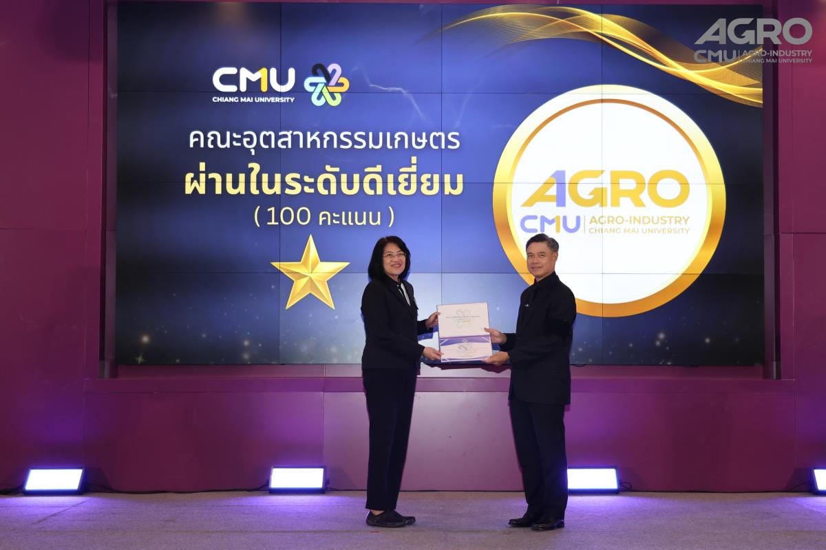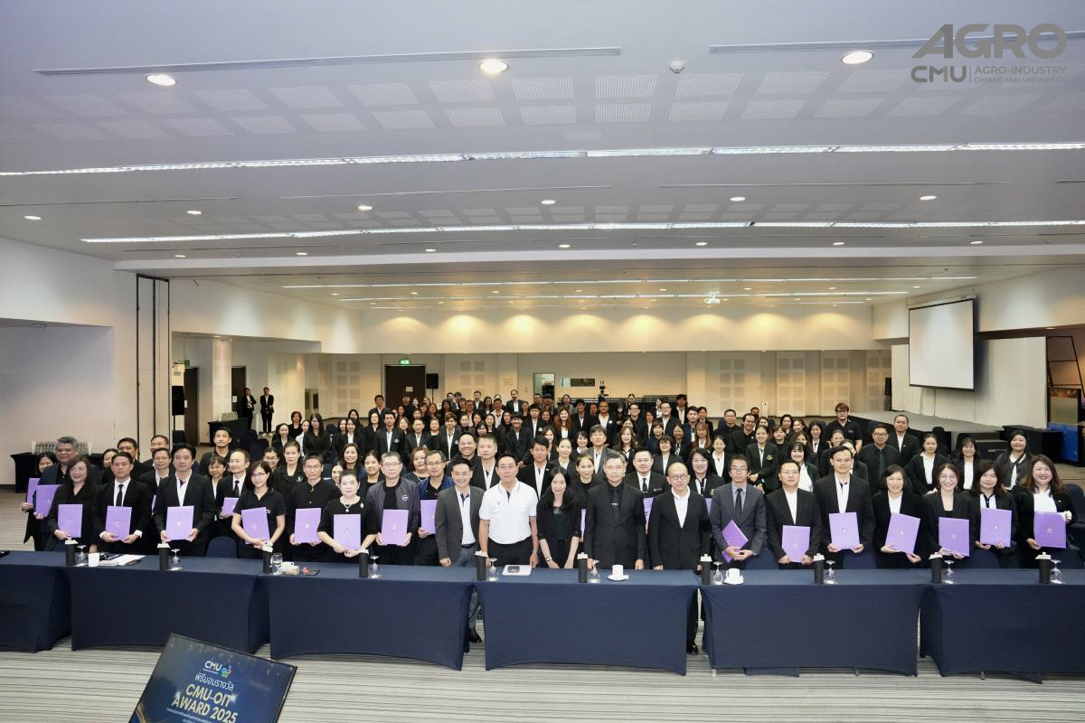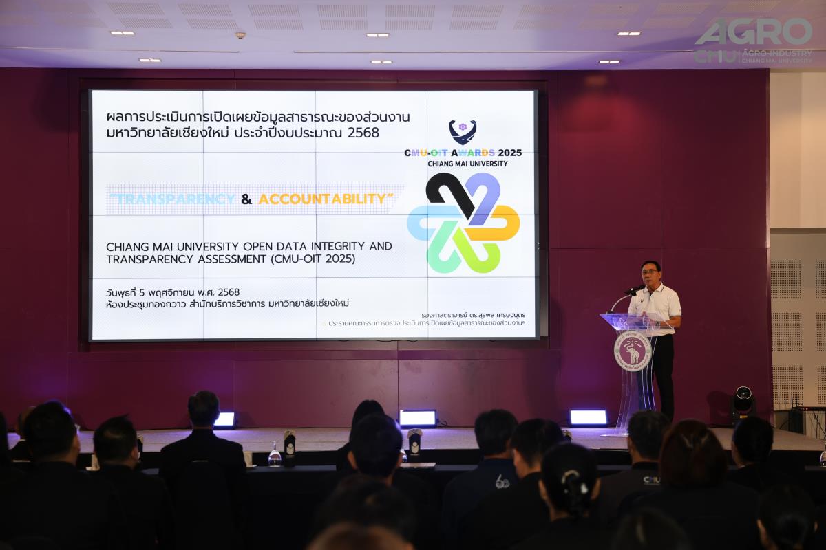 November 5, 2025 – Asst. Prof. Srisuwan Naruenartwongsakul, Ph.D., Associate Dean, representing the Dean of the Faculty of Agro-Industry, received the “CMU-OIT AWARD 2025” for units that achieved an “Excellent Level Pass” in the Chiang Mai University – Open Data Integrity and Transparency Assessment (CMU-OIT) Project for the academic year 2025. The Faculty achieved a perfect score of 100 out of 100 points. Prof. Pongruk Sribanditmongkol, M.D., Ph.D., President of Chiang Mai University, graciously presided over the award ceremony held at the Thong Kwaw Meeting Room, 2nd Floor, Academic Service Center, Chiang Mai University.
