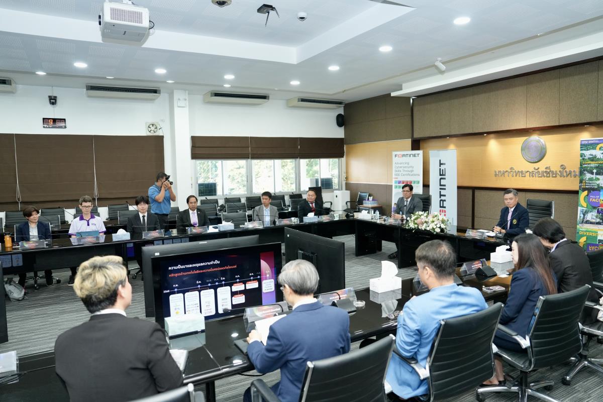 ศาสตราจารย์ ดร.นายแพทย์พงษ์รักษ์ ศรีบัณฑิตมงคล อธิการบดีมหาวิทยาลัยเชียงใหม่ ให้การต้อนรับ ดร.ศุภกร กังพิศดาร Country Manager บริษัท ฟอร์ทิเนท ซีเคียวริตี้ เน็ทเวิร์ค (ประเทศไทย) จำกัด และคณะฯ ในโอกาสที่ร่วมพิธีลงนามบันทึกข้อตกลงความร่วมมือทางวิชาการ (MOU) ระหว่าง มหาวิทยาลัยเชียงใหม่ กับ บริษัท ฟอร์ทิเนท ซีเคียวริตี้ เน็ทเวิร์ค (ประเทศไทย) จำกัด เพื่อเป็นพันธมิตรทางวิชาการ (Academic Partner) ภายใต้หลักสูตร Fortinet Network Security Expert (NSE) เพื่อยกระดับองค์ความรู้และทักษะด้านความมั่นคงปลอดภัยไซเบอร์ให้แก่นักศึกษาและบุคลากร ณ ห้องประชุมบัวเรศ คำทอง สำนักงานมหาวิทยาลัย มหาวิทยาลัยเชียงใหม่ เมื่อวันพุธที่ 22 ตุลาคม 2568