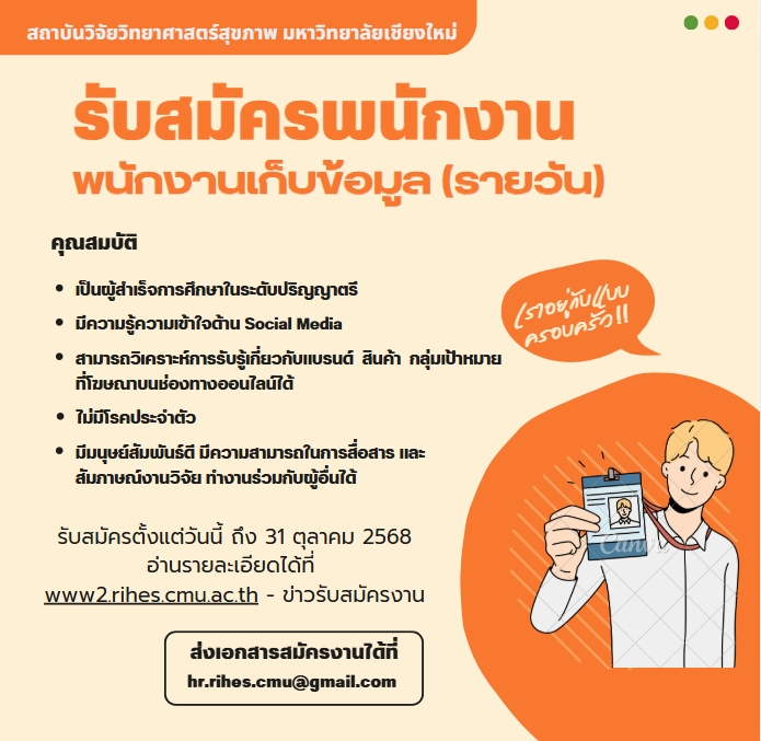 อ่านรายละเอียดได้ที่ www2.rihes.cmu.ac.th - ข่าวรับสมัครงาน