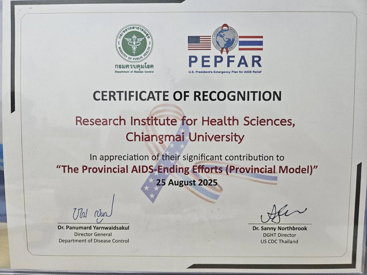 สถาบันวิจัยวิทยาศาสตร์สุขภาพ มช. ร่วมรับใบเกียรติคุณสนับสนุนงานเร่งรัดยุติปัญหาเอดส์