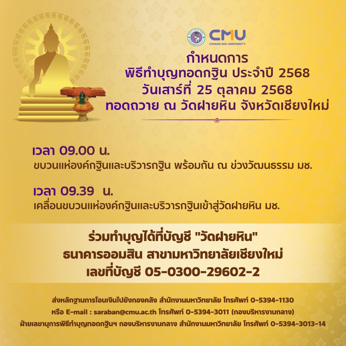 มหาวิทยาลัยเชียงใหม่ จัดพิธีทำบุญทอดกฐินมหาวิทยาลัยเชียงใหม่ ประจำปี 2568 ในวันที่ 25 ตุลาคม 2568 ทอดถวาย ณ วัดฝายหิน ตำบลสุเทพ อำเภอเมือง จังหวัดเชียงใหม่