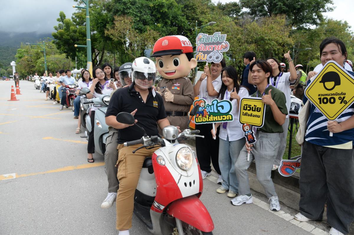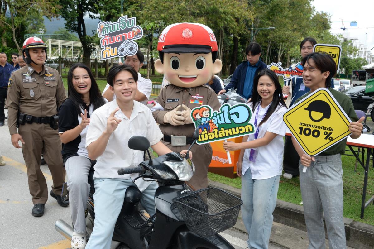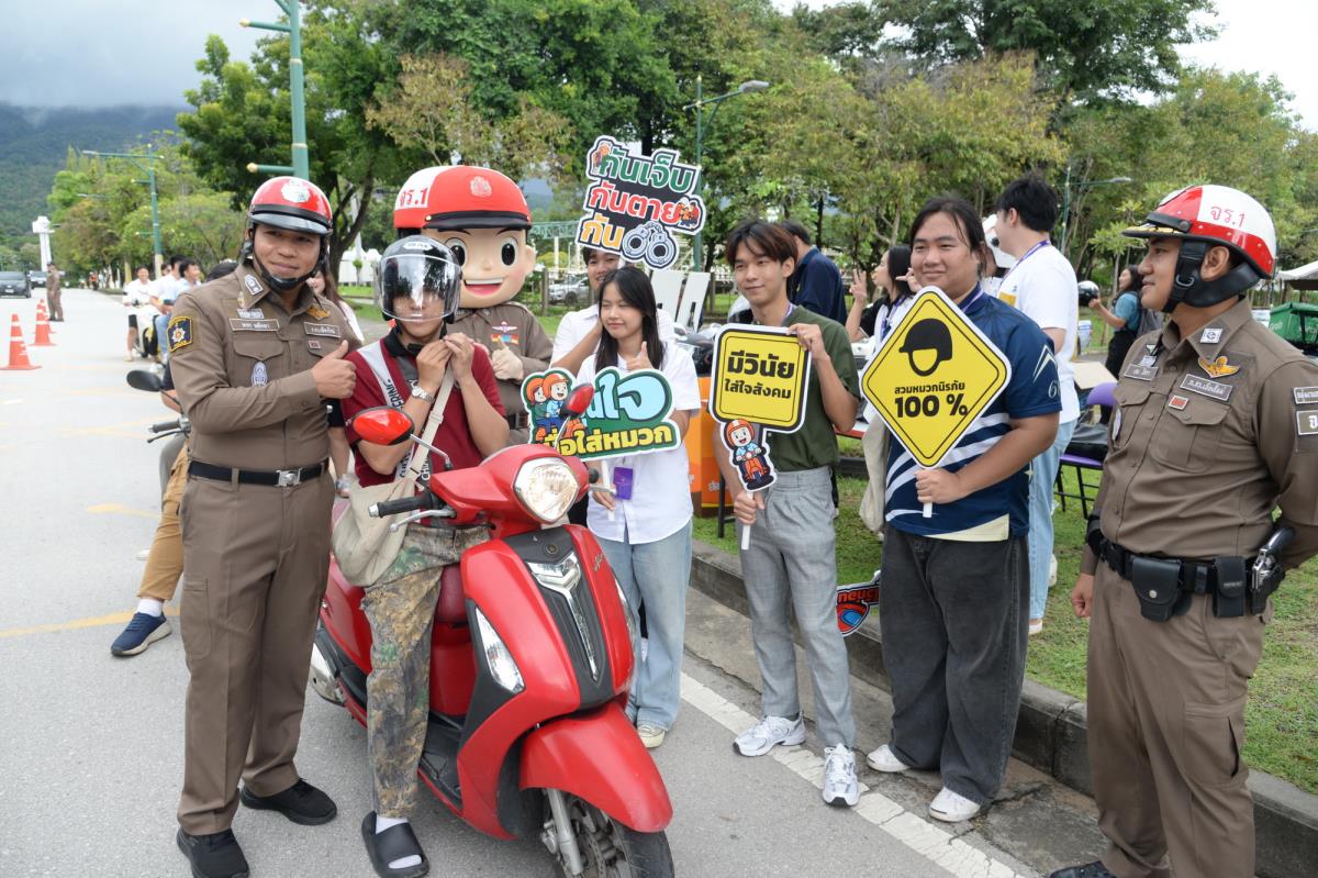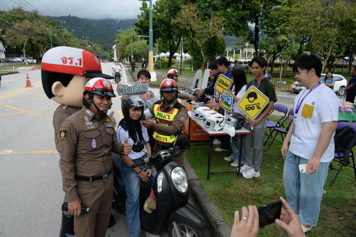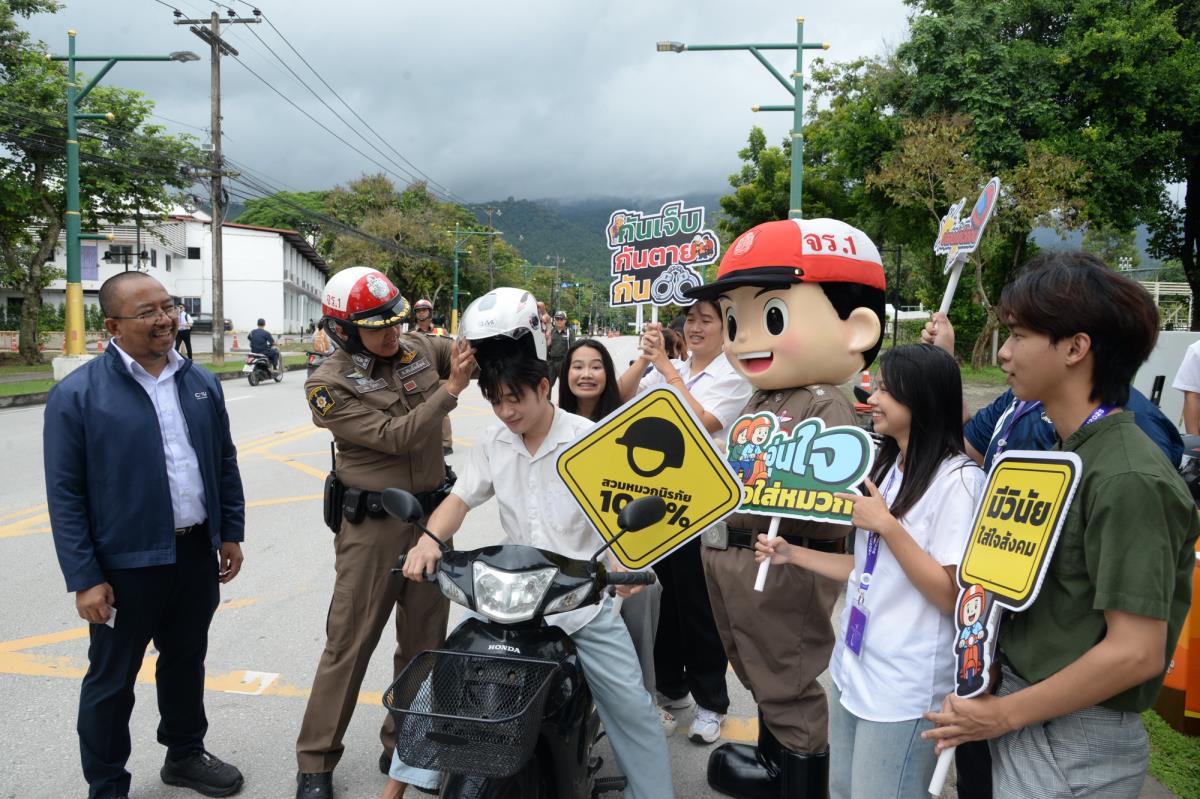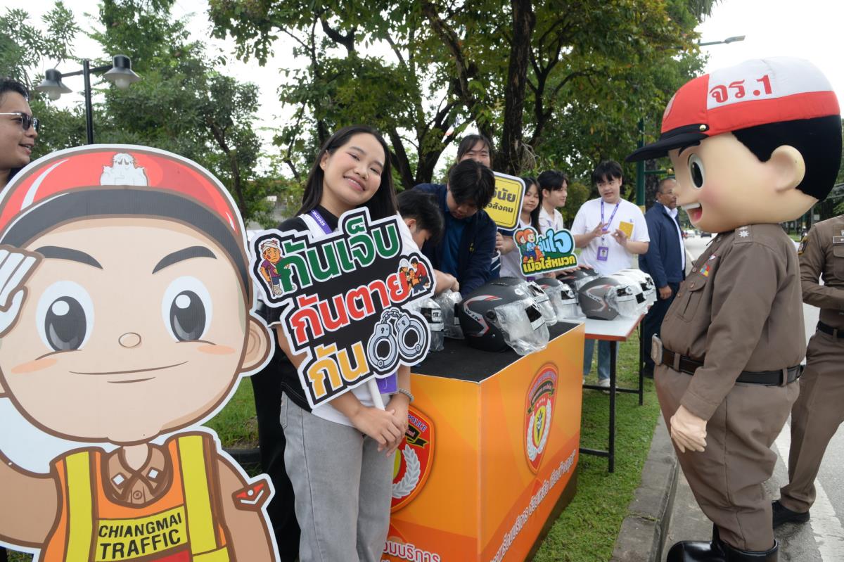 ผู้ช่วยศาสตราจารย์ ดร.จิรวัฒน์ พัสระ ผู้ช่วยอธิการบดีมหาวิทยาลัยเชียงใหม่ และพันตำรวจเอก เจน โสภา ผู้กำกับการกลุ่มงานจราจร ตำรวจภูธรจังหวัดเชียงใหม่ ร่วมกิจกรรมรณรงค์แจกหมวกนิรภัย ให้แก่นักศึกษาและบุคคลที่สัญจรภายในมหาวิทยาลัยเชียงใหม่ เพื่อสร้างความปลอดภัยในการขับขี่รถจักรยานยนต์ ลดปัญหาของการบาดเจ็บและเสียชีวิตจากอุบัติเหตุ ตลอดจนการสร้างระเบียบวินัยในการขับขี่ยานพาหนะให้ถูกต้องตามกฎจราจร ณ ลานด้านหน้า CMU 60th Years Main Stadium ศูนย์กีฬาและสุขภาพ มหาวิทยาลัยเชียงใหม่ วันพุธที่ 1 ตุลาคม พ.ศ. 2568