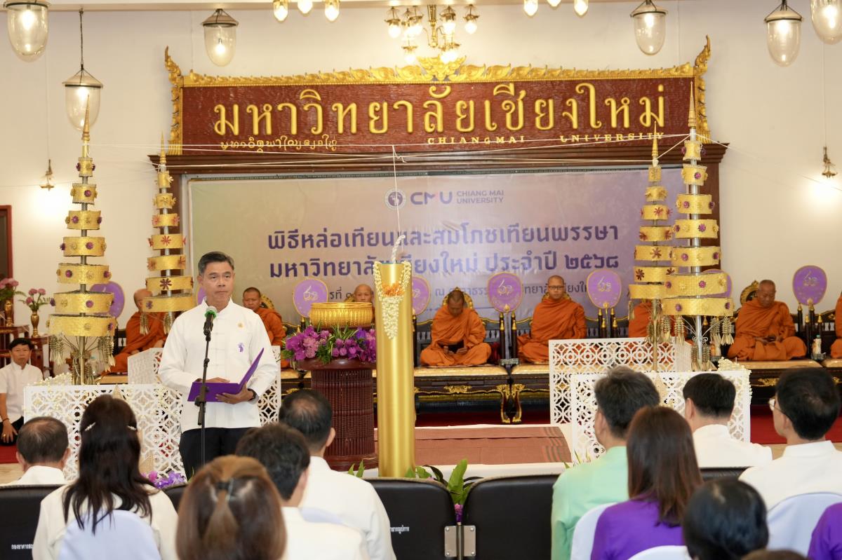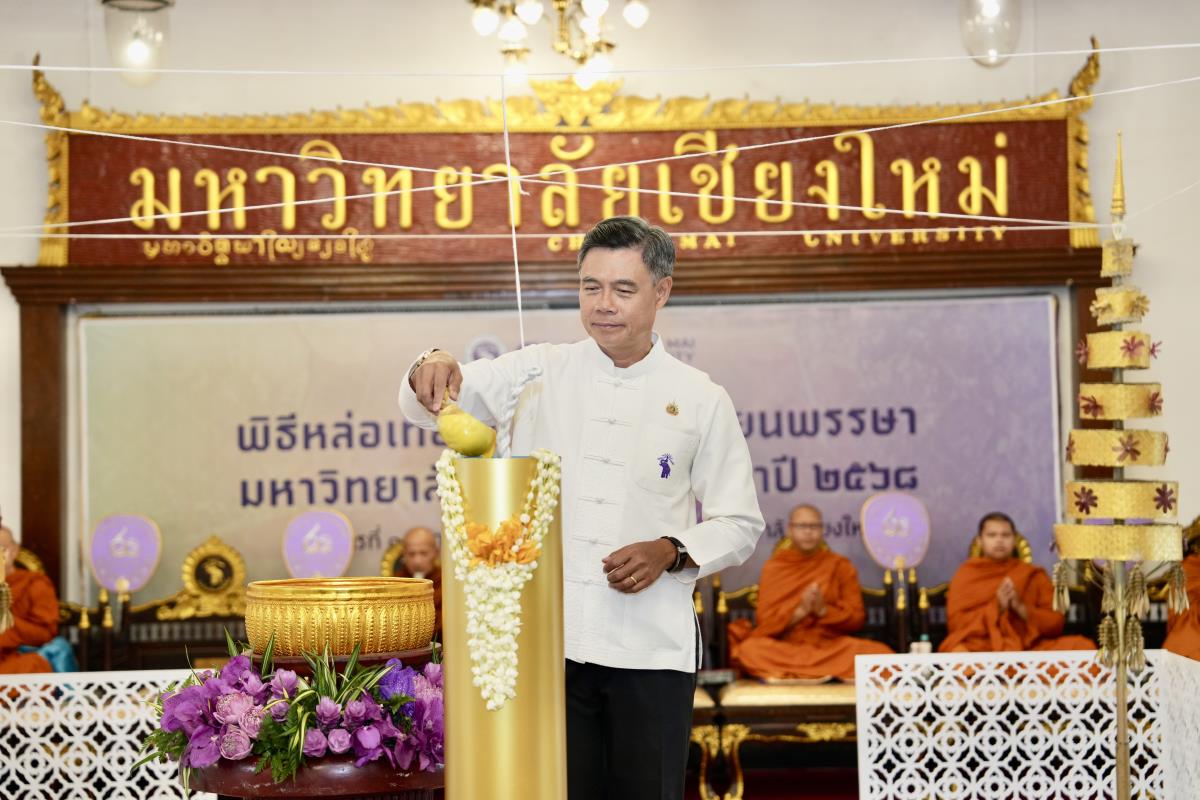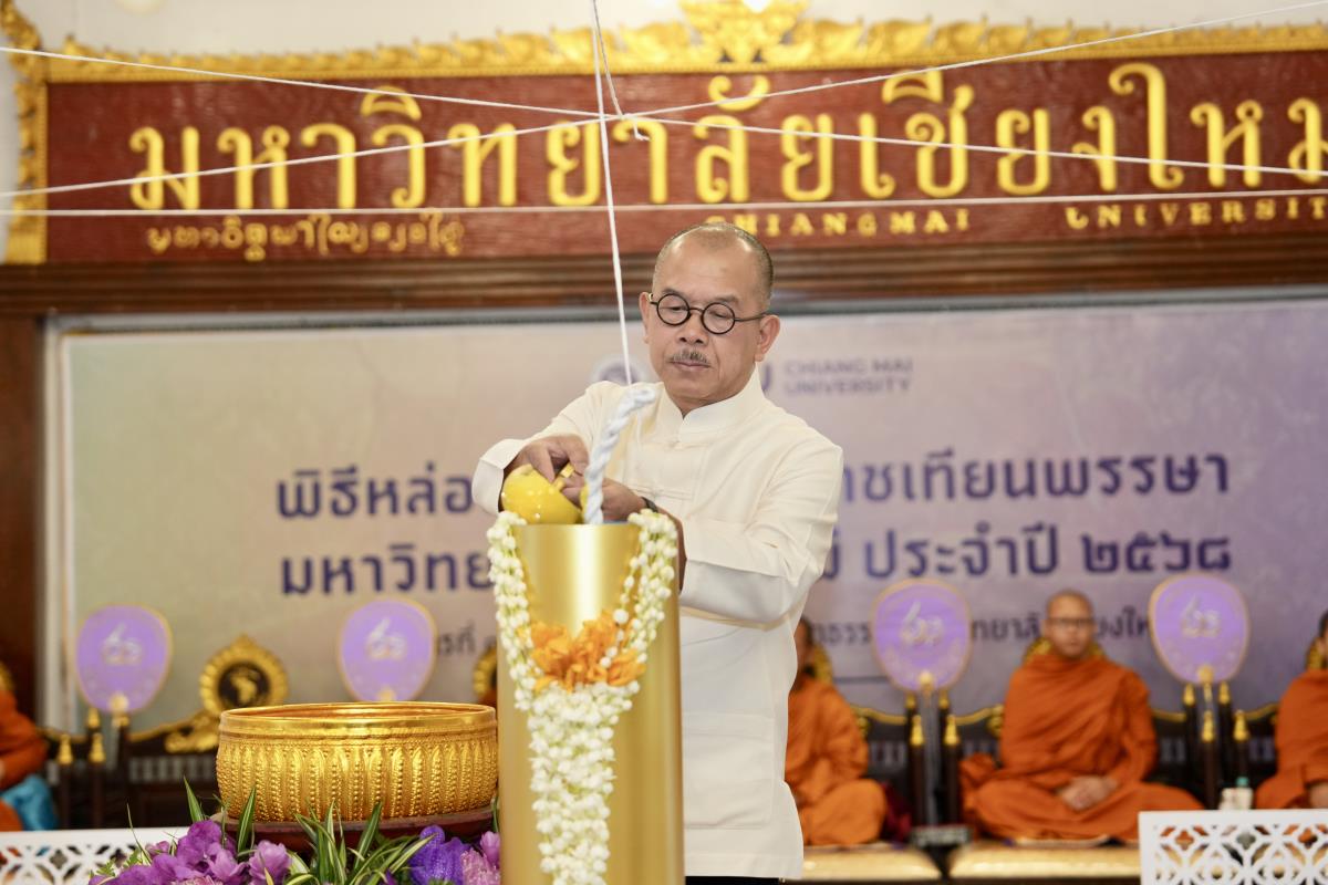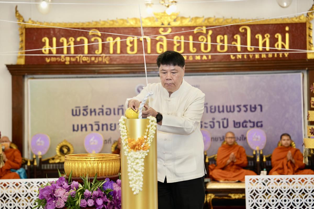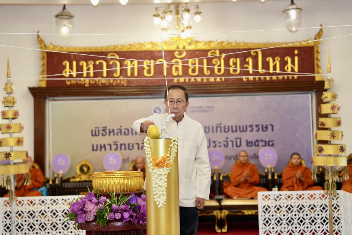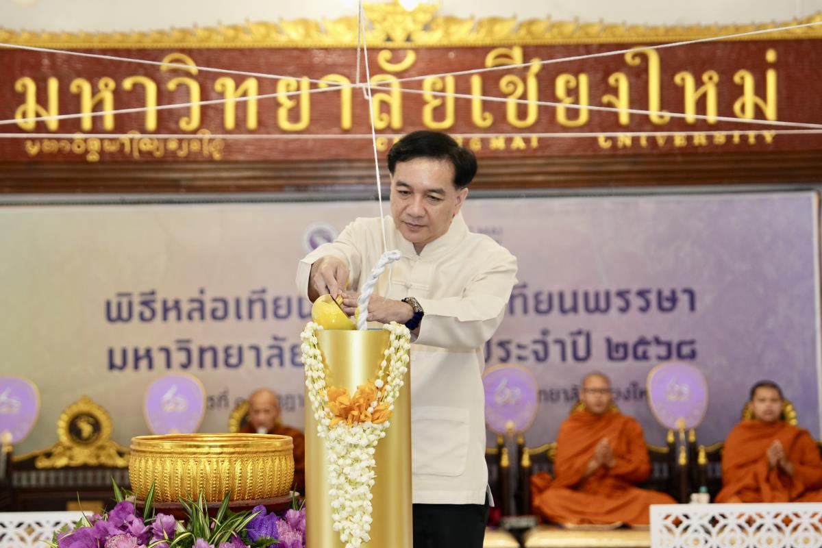 ศาสตราจารย์ ดร.นพ.พงษ์รักษ์ ศรีบัณฑิตมงคล อธิการบดีมหาวิทยาลัยเชียงใหม่ เป็นประธานในพิธีหล่อเทียนและสมโภชเทียนพรรษามหาวิทยาลัยเชียงใหม่ ประจำปี 2568 โดยมีศาสตราจารย์ปฏิบัติ ดร.เอกชัย มหาเอก รองอธิการบดี กล่าวรายงาน พร้อมด้วยคณะผู้บริหาร คณาจารย์ เจ้าหน้าที่จากทุกส่วนงานและนักศึกษามหาวิทยาลัยเชียงใหม่ร่วมพิธี เพื่ออนุรักษ์ศิลปวัฒนธรรมประเพณีอันดีงาม ร่วมสืบสานมรดกทางวัฒนธรรมที่มีคุณค่าให้คงอยู่สืบไป ณ ศาลาธรรม มหาวิทยาลัยเชียงใหม่ เมื่อวันอังคารที่ 1 กรกฎาคม พ.ศ.2568