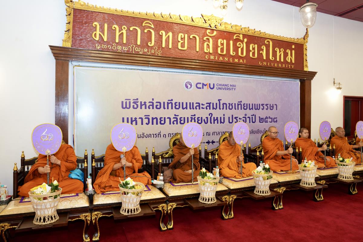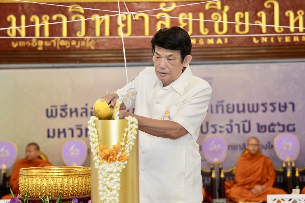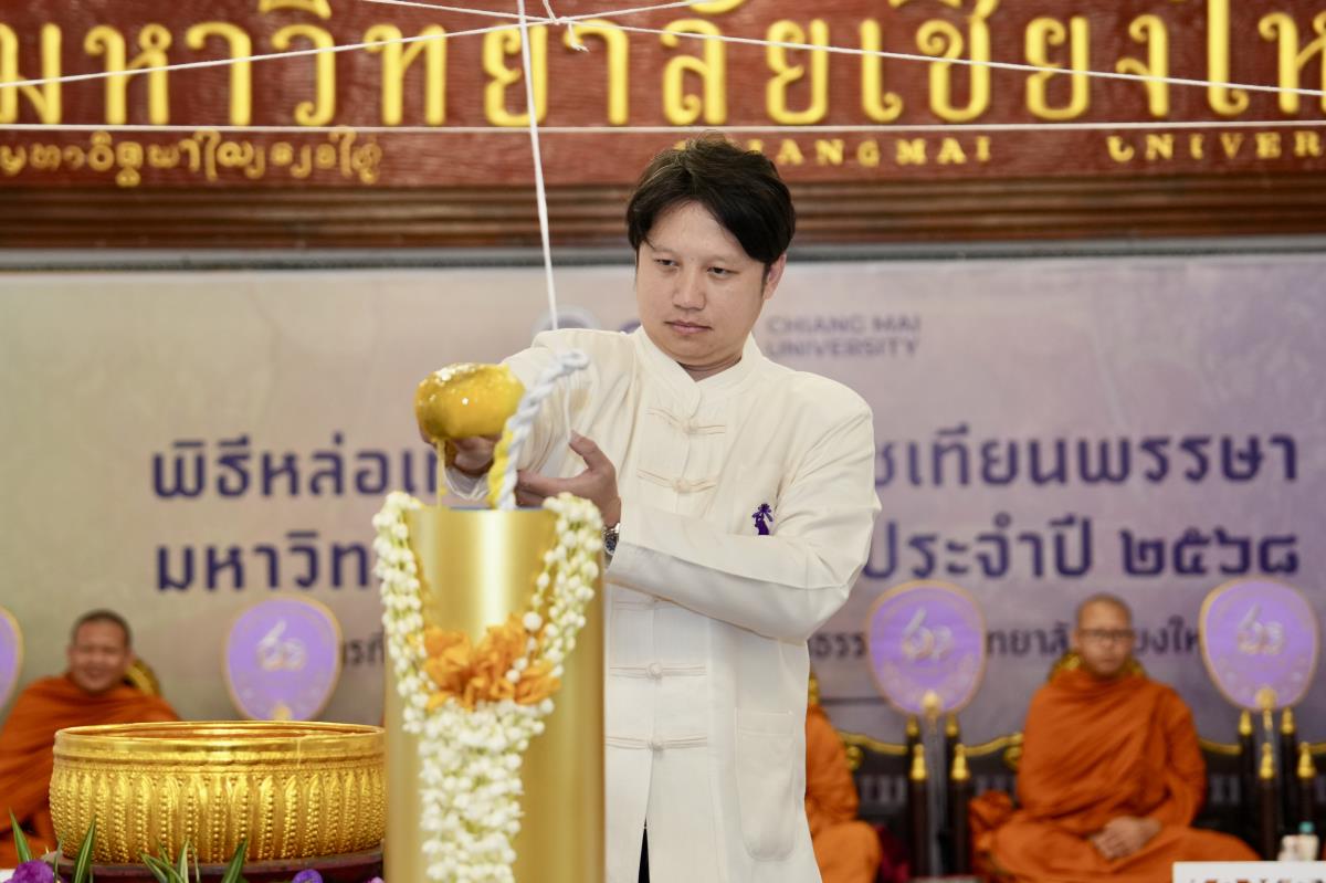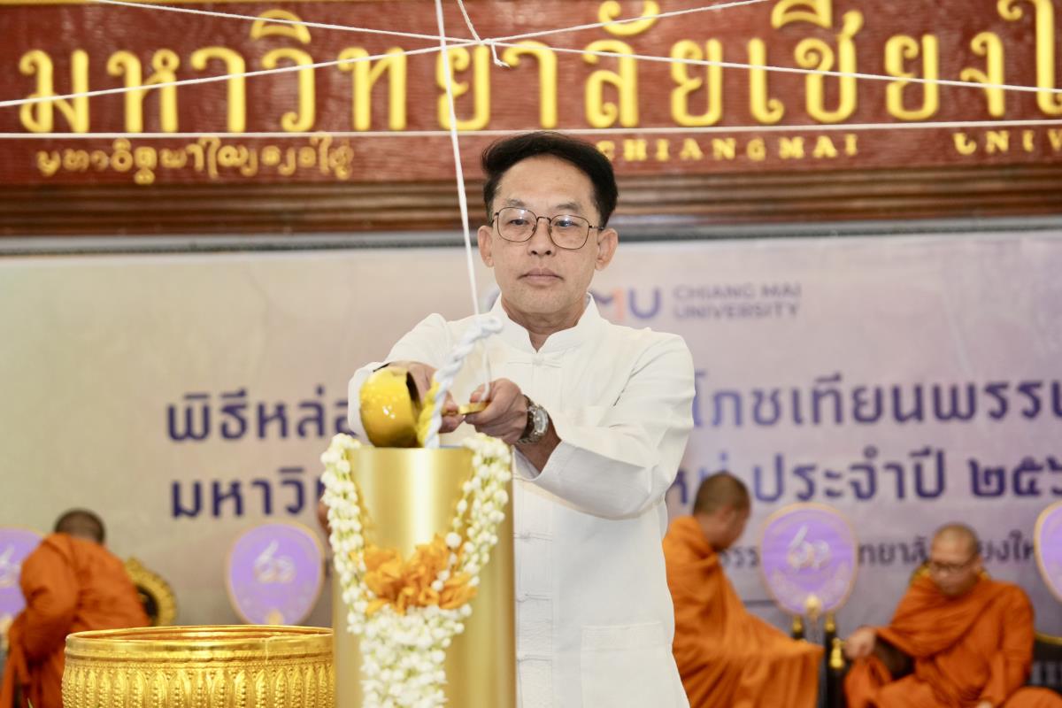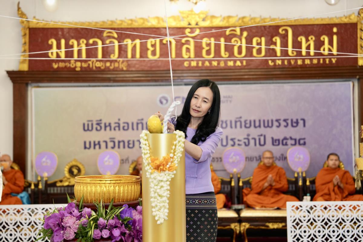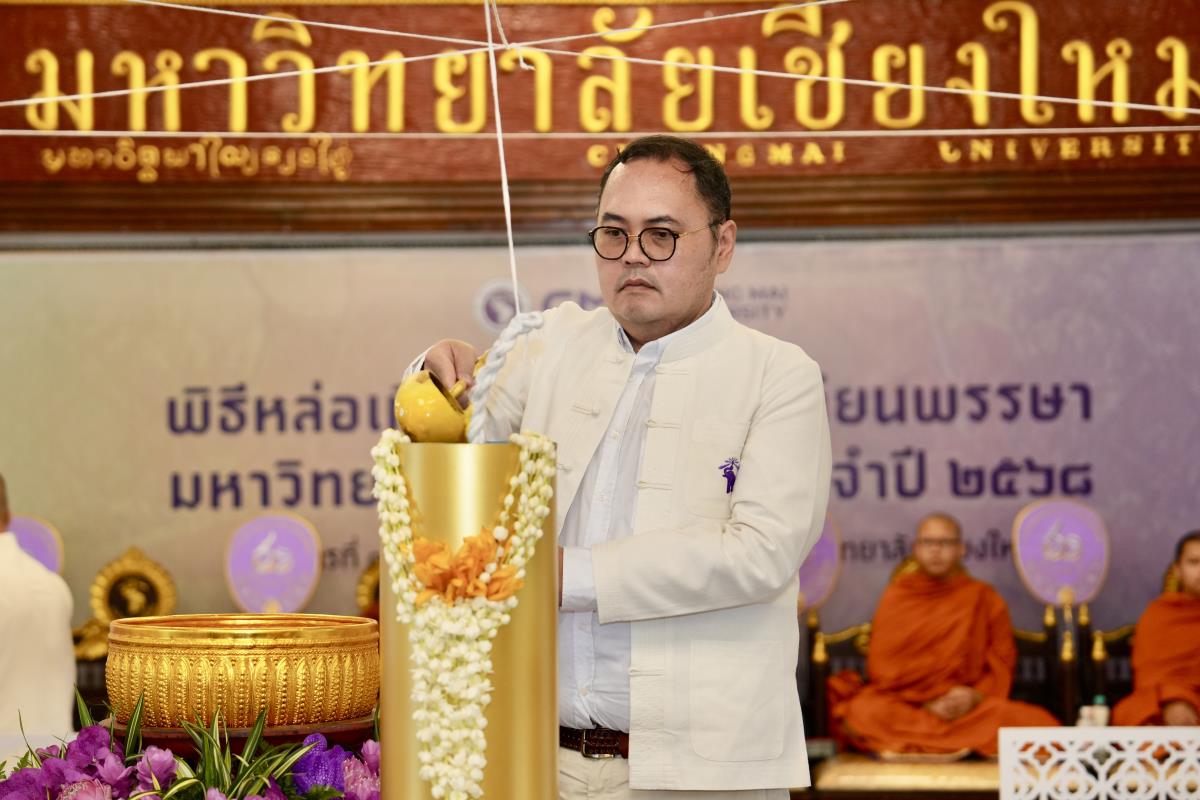 ศาสตราจารย์ ดร.นพ.พงษ์รักษ์ ศรีบัณฑิตมงคล อธิการบดีมหาวิทยาลัยเชียงใหม่ เป็นประธานในพิธีหล่อเทียนและสมโภชเทียนพรรษามหาวิทยาลัยเชียงใหม่ ประจำปี 2568 โดยมีศาสตราจารย์ปฏิบัติ ดร.เอกชัย มหาเอก รองอธิการบดี กล่าวรายงาน พร้อมด้วยคณะผู้บริหาร คณาจารย์ เจ้าหน้าที่จากทุกส่วนงานและนักศึกษามหาวิทยาลัยเชียงใหม่ร่วมพิธี เพื่ออนุรักษ์ศิลปวัฒนธรรมประเพณีอันดีงาม ร่วมสืบสานมรดกทางวัฒนธรรมที่มีคุณค่าให้คงอยู่สืบไป ณ ศาลาธรรม มหาวิทยาลัยเชียงใหม่ เมื่อวันอังคารที่ 1 กรกฎาคม พ.ศ.2568