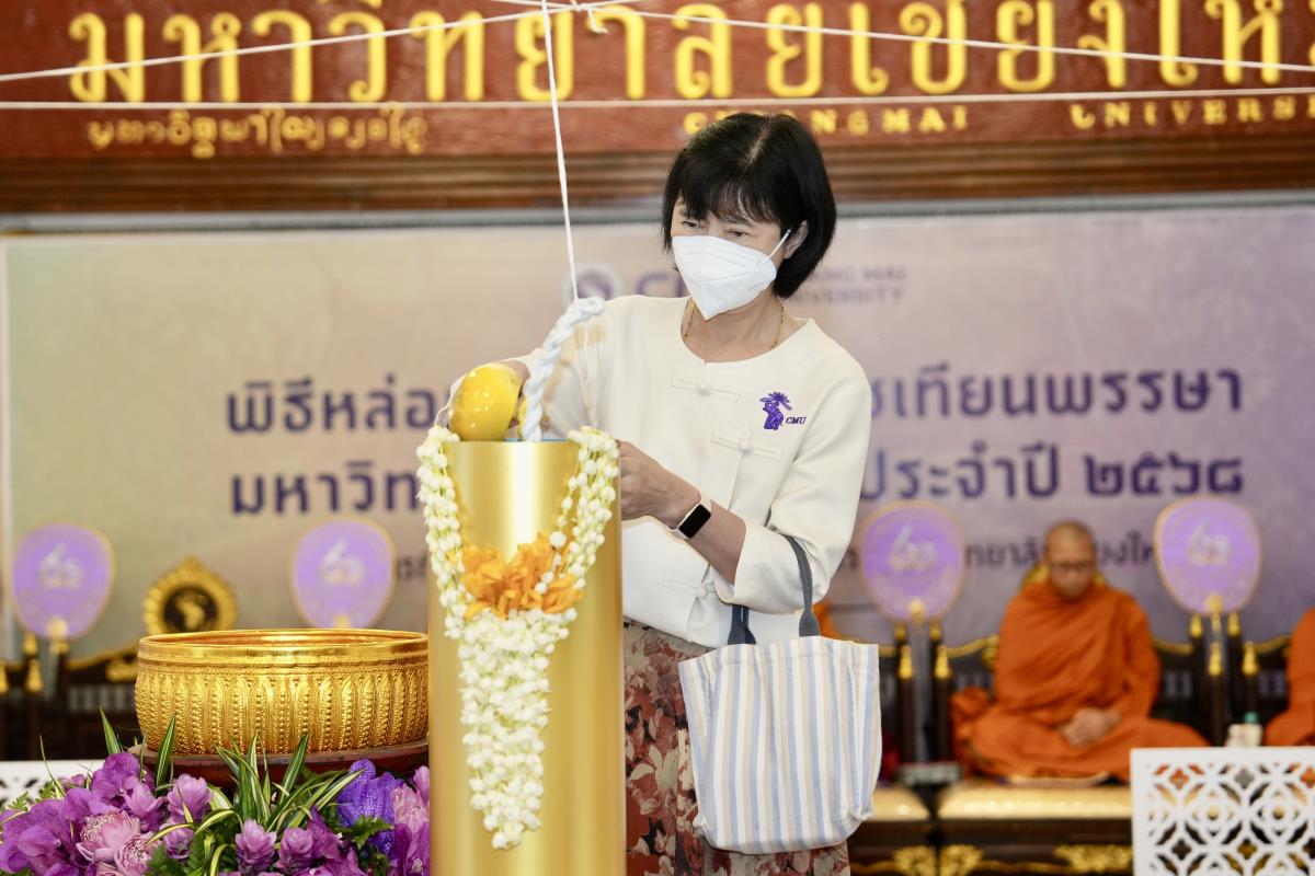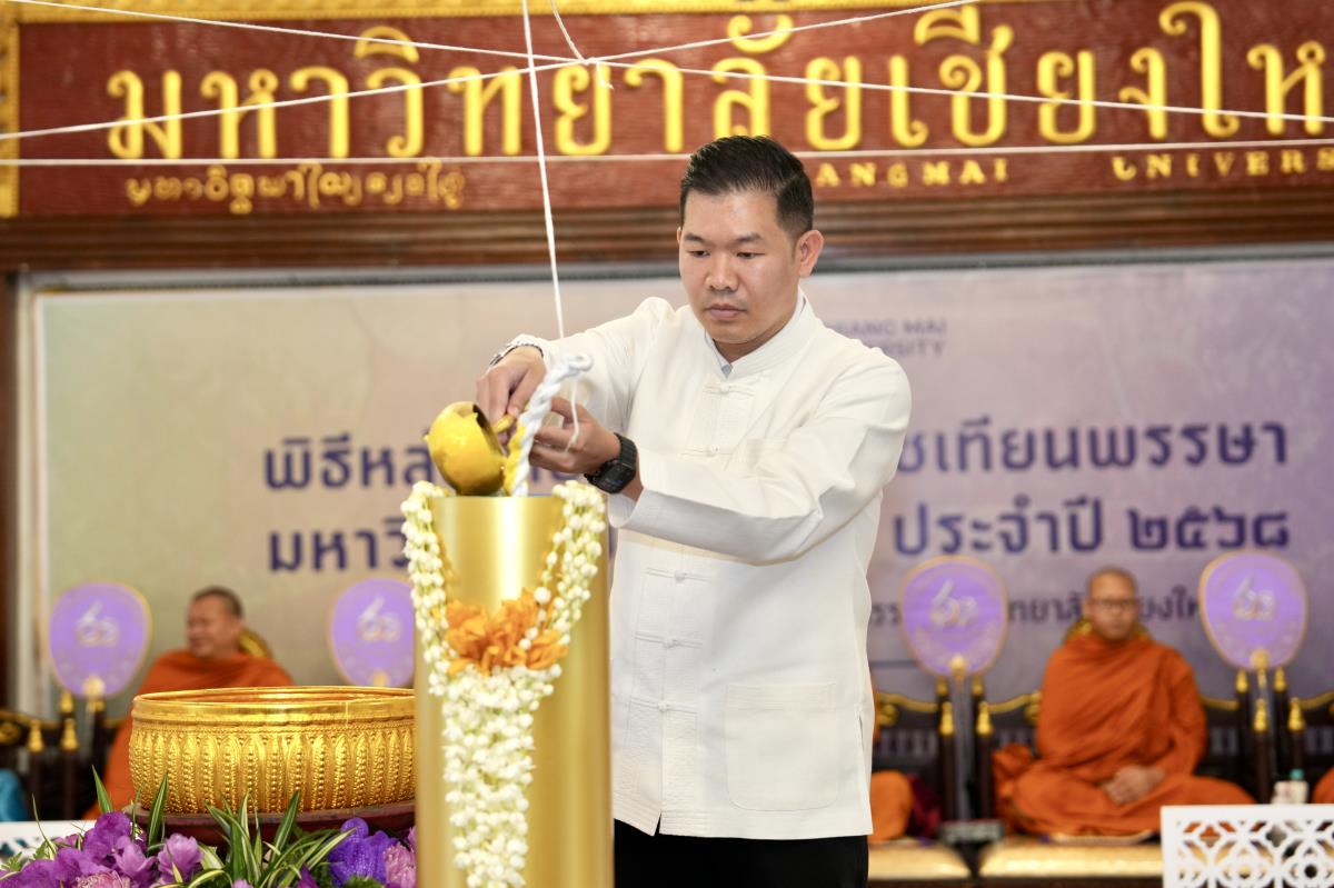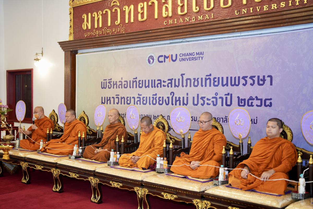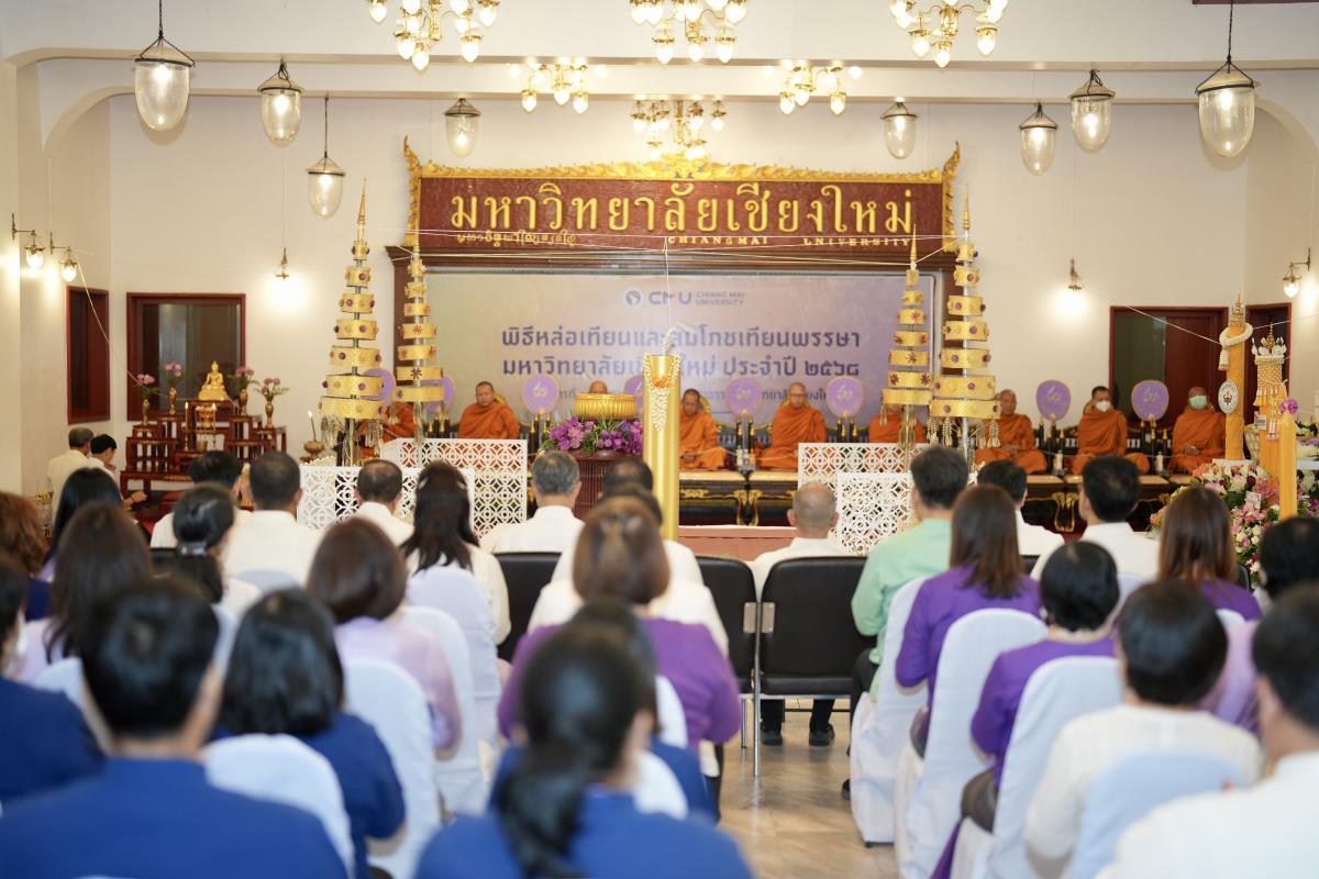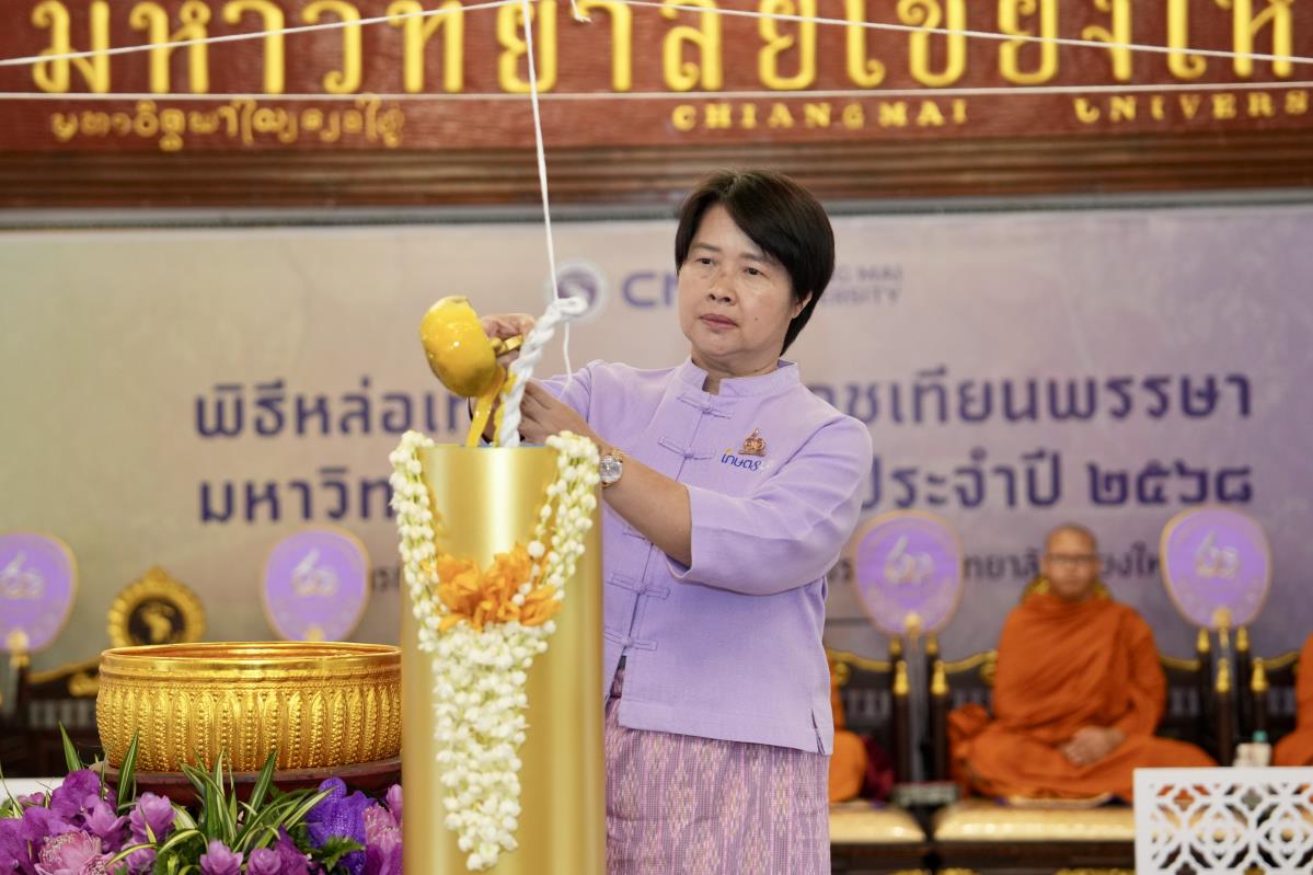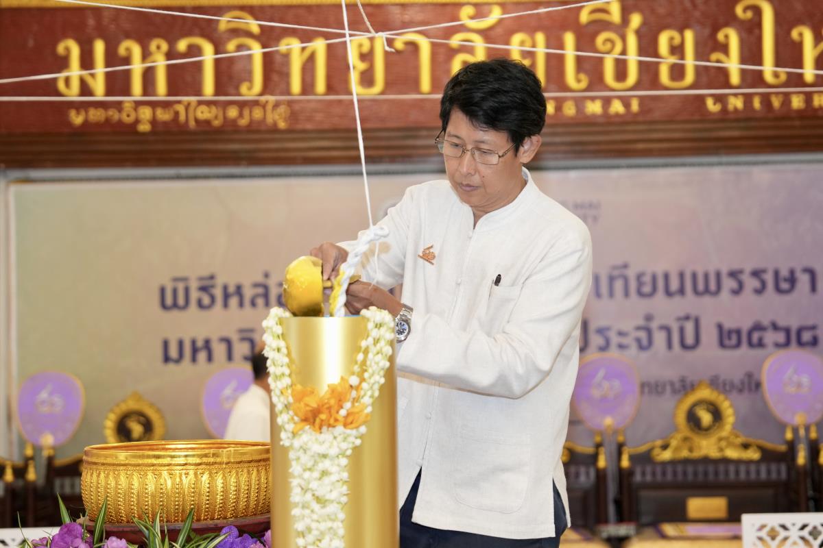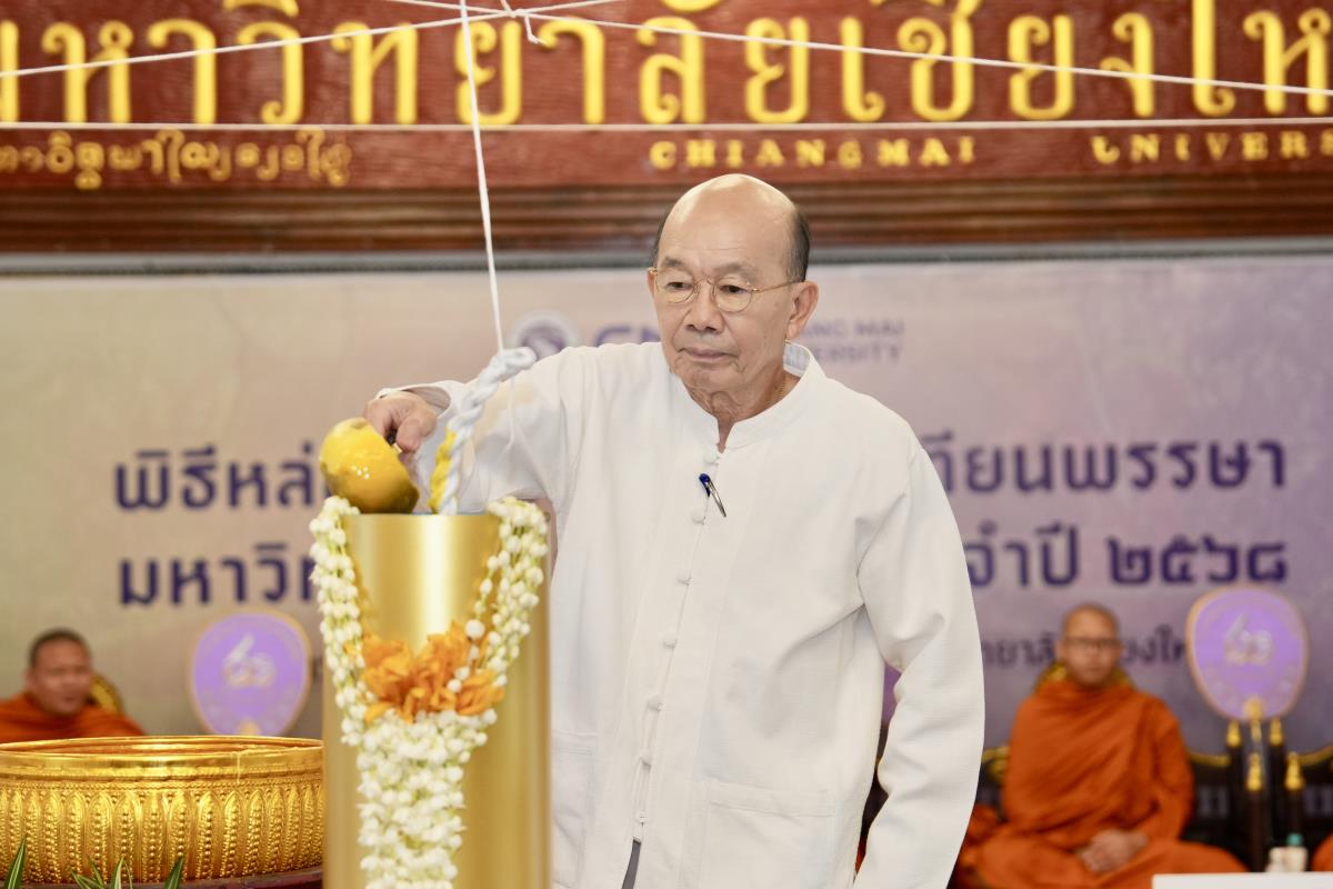 ศาสตราจารย์ ดร.นพ.พงษ์รักษ์ ศรีบัณฑิตมงคล อธิการบดีมหาวิทยาลัยเชียงใหม่ เป็นประธานในพิธีหล่อเทียนและสมโภชเทียนพรรษามหาวิทยาลัยเชียงใหม่ ประจำปี 2568 โดยมีศาสตราจารย์ปฏิบัติ ดร.เอกชัย มหาเอก รองอธิการบดี กล่าวรายงาน พร้อมด้วยคณะผู้บริหาร คณาจารย์ เจ้าหน้าที่จากทุกส่วนงานและนักศึกษามหาวิทยาลัยเชียงใหม่ร่วมพิธี เพื่ออนุรักษ์ศิลปวัฒนธรรมประเพณีอันดีงาม ร่วมสืบสานมรดกทางวัฒนธรรมที่มีคุณค่าให้คงอยู่สืบไป ณ ศาลาธรรม มหาวิทยาลัยเชียงใหม่ เมื่อวันอังคารที่ 1 กรกฎาคม พ.ศ.2568