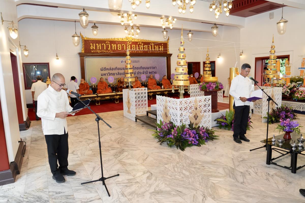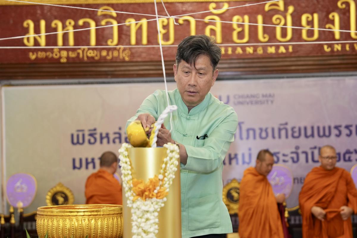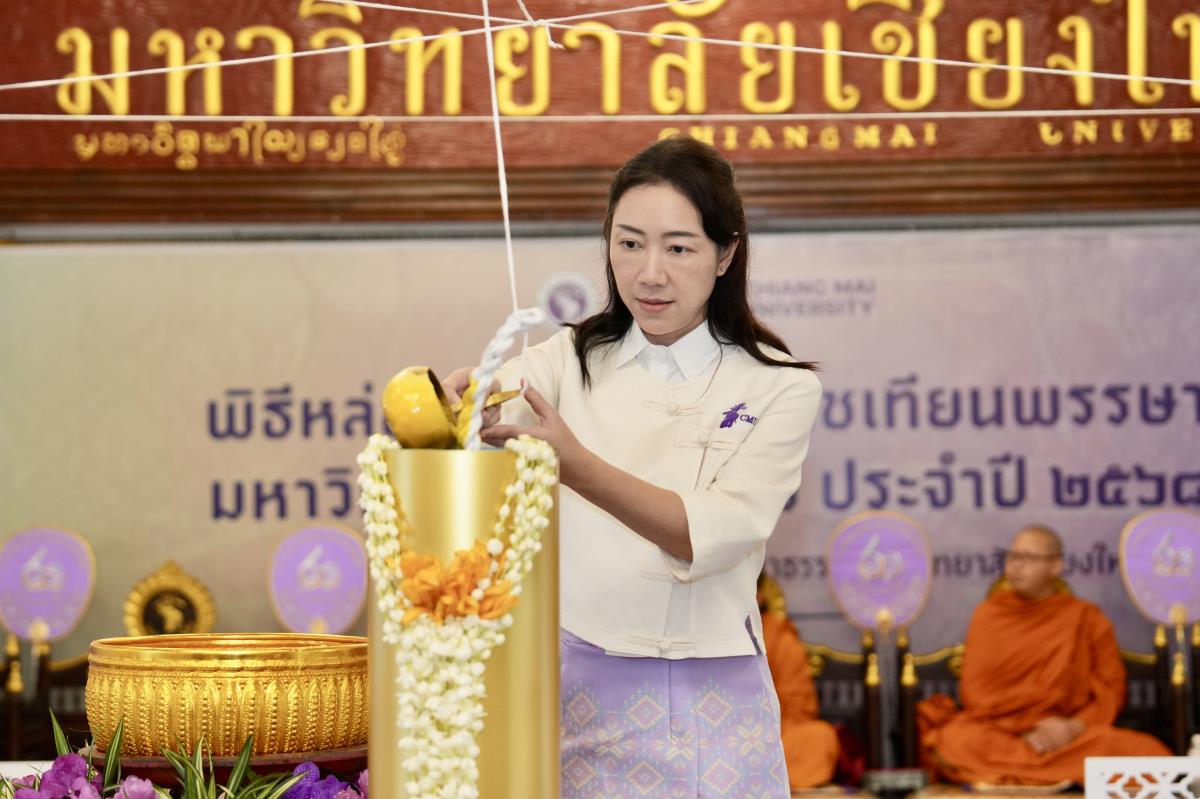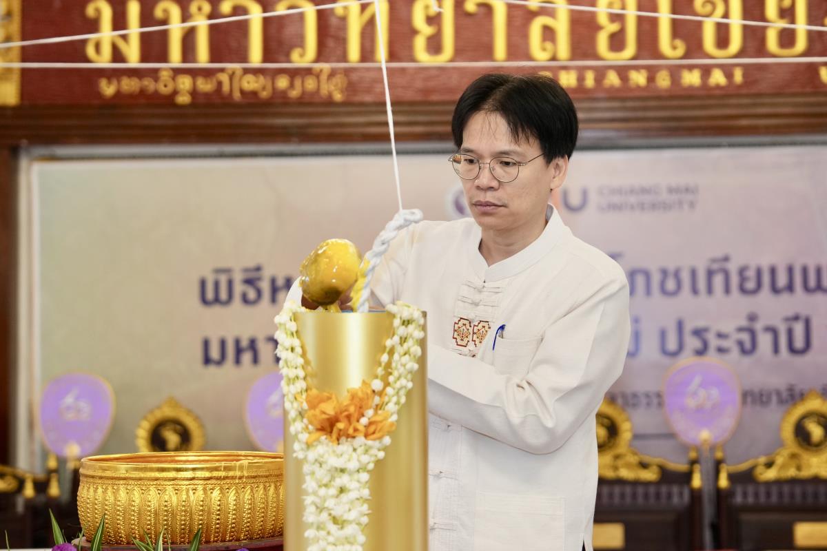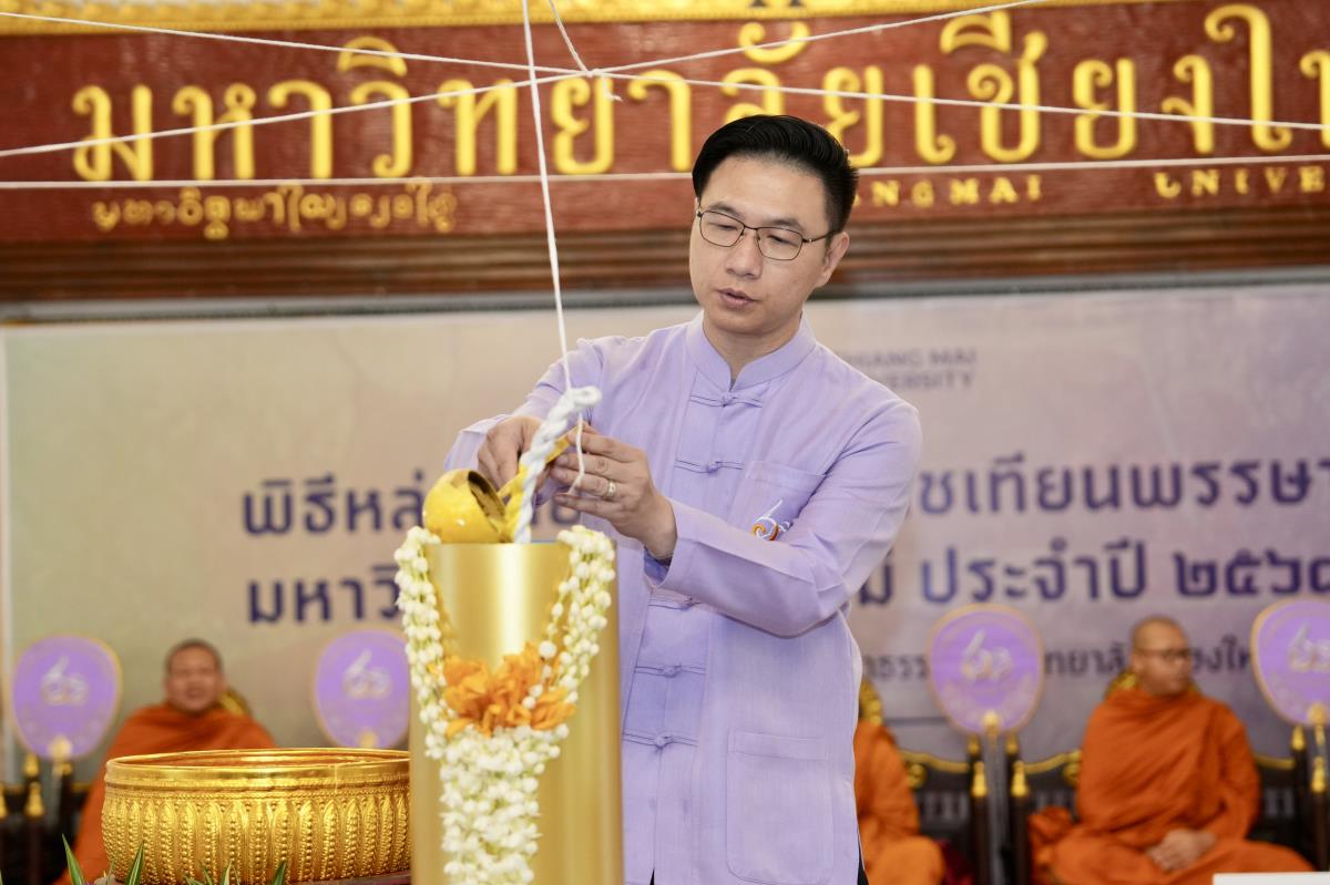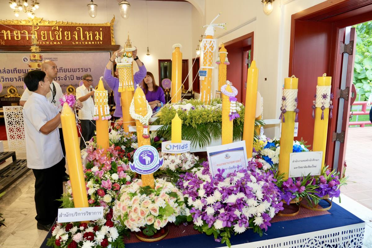 ศาสตราจารย์ ดร.นพ.พงษ์รักษ์ ศรีบัณฑิตมงคล อธิการบดีมหาวิทยาลัยเชียงใหม่ เป็นประธานในพิธีหล่อเทียนและสมโภชเทียนพรรษามหาวิทยาลัยเชียงใหม่ ประจำปี 2568 โดยมีศาสตราจารย์ปฏิบัติ ดร.เอกชัย มหาเอก รองอธิการบดี กล่าวรายงาน พร้อมด้วยคณะผู้บริหาร คณาจารย์ เจ้าหน้าที่จากทุกส่วนงานและนักศึกษามหาวิทยาลัยเชียงใหม่ร่วมพิธี เพื่ออนุรักษ์ศิลปวัฒนธรรมประเพณีอันดีงาม ร่วมสืบสานมรดกทางวัฒนธรรมที่มีคุณค่าให้คงอยู่สืบไป ณ ศาลาธรรม มหาวิทยาลัยเชียงใหม่ เมื่อวันอังคารที่ 1 กรกฎาคม พ.ศ.2568