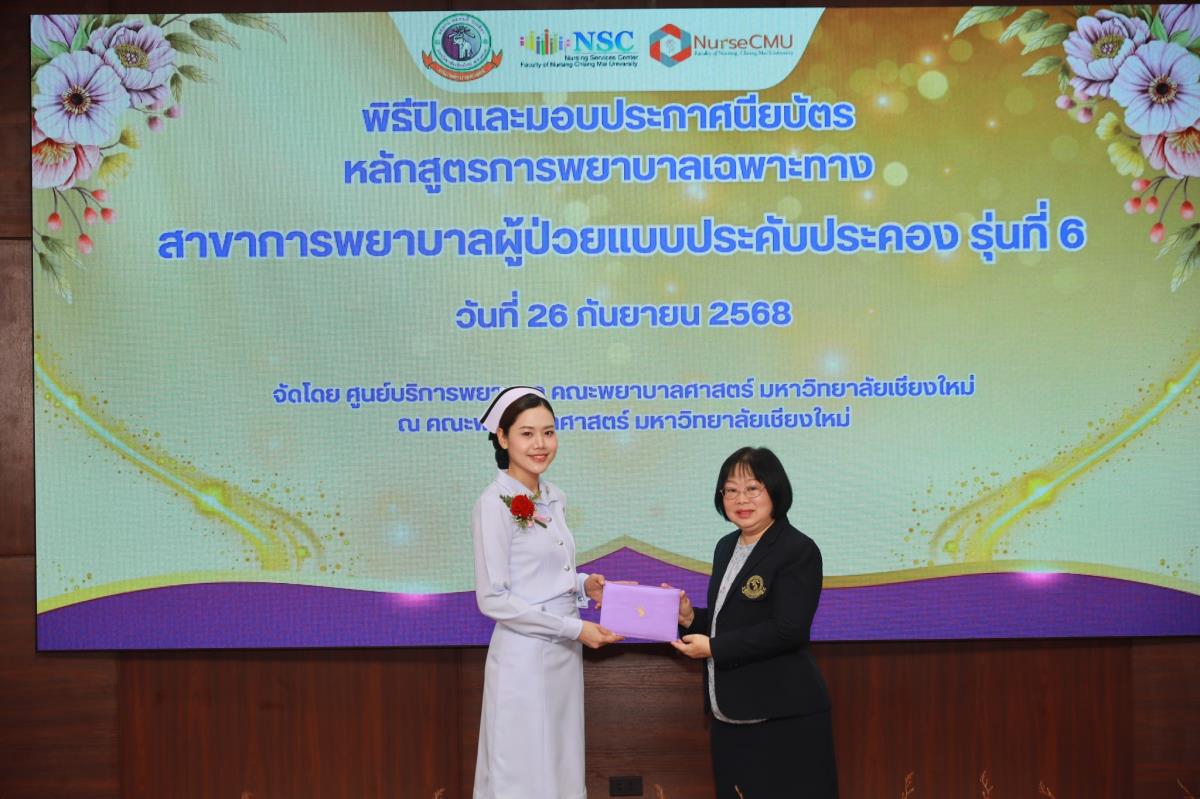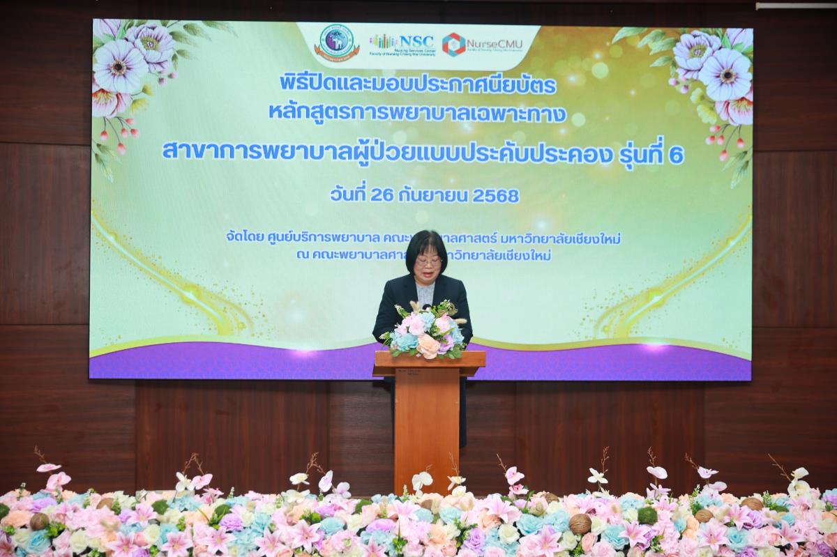 วันศุกร์ที่ 26 กันยายน 2568 ศูนย์บริการพยาบาล คณะพยาบาลศาสตร์ มหาวิทยาลัยเชียงใหม่ จัดพิธีปิดและมอบประกาศนียบัตรหลักสูตรเฉพาะทางสาขาการพยาบาลผู้ป่วยแบบประคับประคอง รุ่นที่ 6 โดยมี ผู้ช่วยศาสตราจารย์ ดร.จันทร์ฉาย โยธาใหญ่ รองคณบดีคณะพยาบาลศาสตร์ เป็นประธานในพิธี รองศาสตราจารย์ ดร.ประทุม สร้อยวงค์ ประธานกรรมการหลักสูตรฯ กล่าวรายงาน ศาสตราจารย์คลินิก ดร.พรรณพิไล ศรีอาภรณ์ ผู้อำนวยการศูนย์บริการพยาบาล คุณณัฐยา พั่วทัด หัวหน้างานการพยาบาลผู้ป่วยสูติศาสตร์และนรีเวชวิทยา ฝ่ายการพยาบาล โรงพยาบาลมหาราชนครเชียงใหม่ และคุณสุรีย์รัตน์ พวงสายใจ รองผู้อำนวยการด้านการพยาบาล โรงพยาบาลมะเร็งลำปาง ร่วมกล่าวแสดงความยินดี ณ ห้องประชุมชั้น 5 อาคาร 4