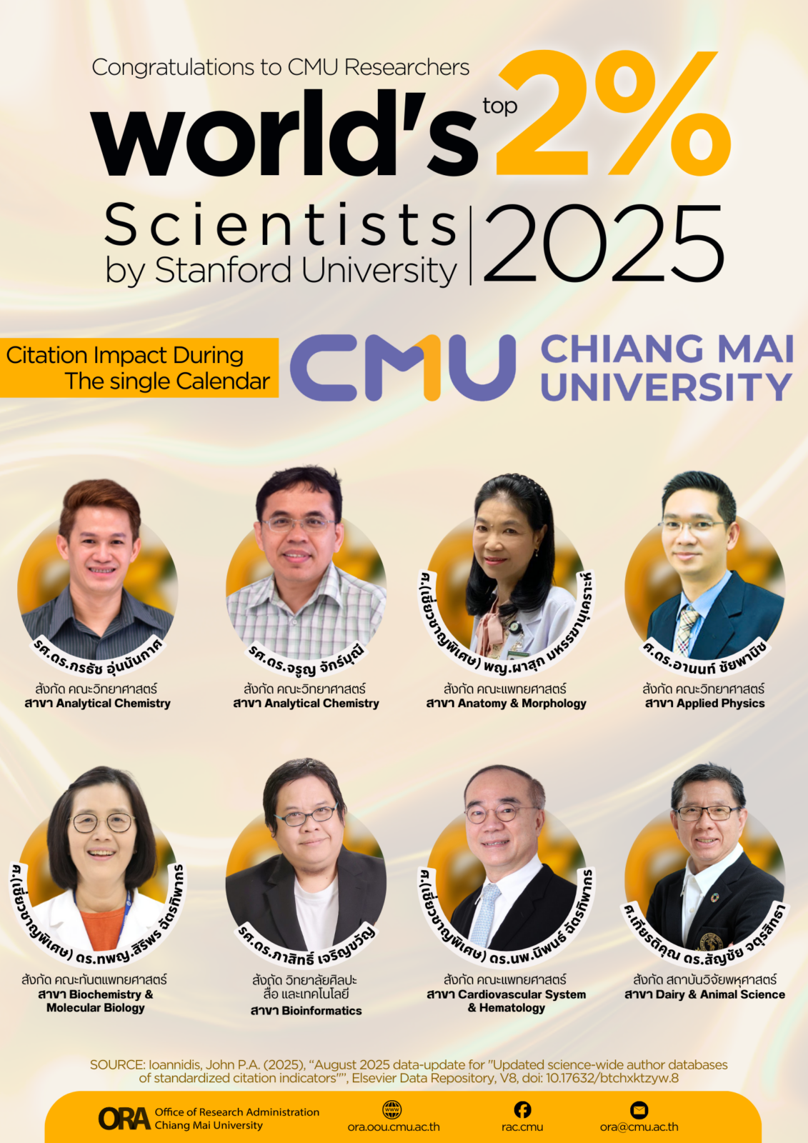 มหาวิทยาลัยเชียงใหม่ ขอแสดงความภาคภูมิใจอย่างยิ่งกับคณาจารย์และนักวิจัยที่ได้รับการจัดอันดับให้เป็นหนึ่งใน นักวิทยาศาสตร์ชั้นนำของโลก ประจำปี 2025 (World’s Top 2% Scientists 2025) ซึ่งจัดทำโดยมหาวิทยาลัยสแตนฟอร์ด (Stanford University) และเผยแพร่เมื่อวันที่ 19 กันยายน 2568 การจัดอันดับนี้อ้างอิงจากข้อมูลการถูกอ้างอิง (Citation Impact) ที่สะท้อนคุณภาพและอิทธิพลของผลงานวิจัยในระดับสากล โดยแบ่งออกเป็น 2 ประเภทหลัก ได้แก่ ผลกระทบการอ้างอิงตลอดชีพ (Career-long Citation Impact) และผลกระทบการอ้างอิงเฉพาะปี 2024 (Single-year Citation Impact) ซึ่งเป็นเครื่องยืนยันถึงความโดดเด่นและความสำคัญของงานวิจัยที่ได้รับการยอมรับในวงการวิชาการทั่วโลก