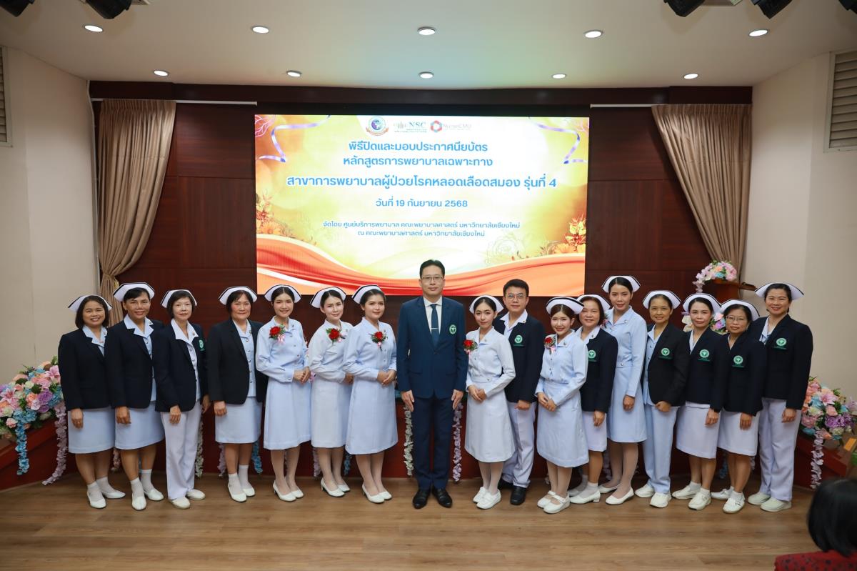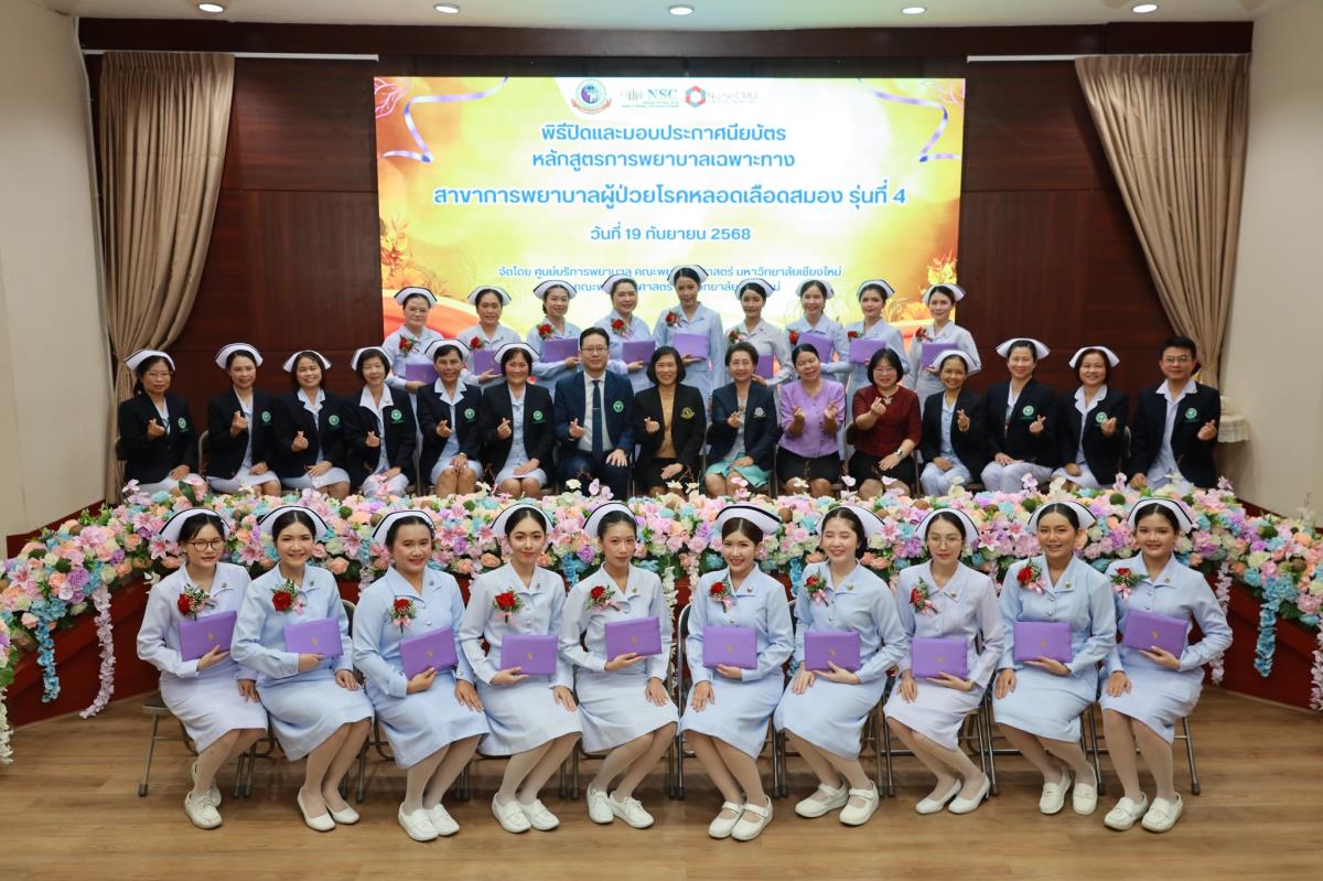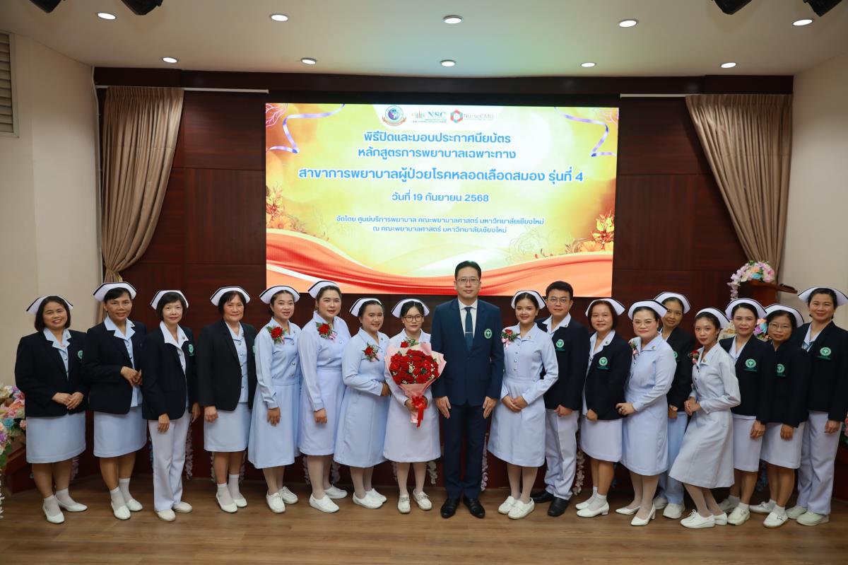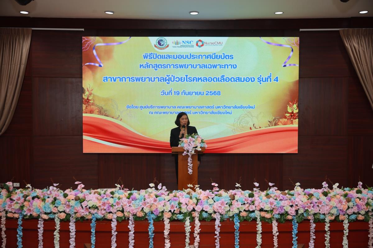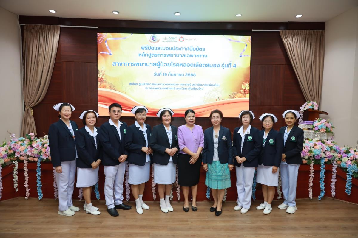 วันศุกร์ที่ 19 กันยายน 2568 ศูนย์บริการพยาบาล คณะพยาบาลศาสตร์ มหาวิทยาลัยเชียงใหม่ ร่วมกับ กลุ่มภารกิจด้านการพยาบาล โรงพยาบาลประสาทเชียงใหม่ จัดพิธีปิดและมอบประกาศนียบัตรการอบรมหลักสูตรการพยาบาลเฉพาะทางสาขาการพยาบาลผู้ป่วยโรคหลอดเลือดสมอง รุ่นที่ 4 โดยมี ผู้ช่วยศาสตราจารย์ ดร.สุภารัตน์ วังศรีคูณ คณบดีคณะพยาบาลศาสตร์ เป็นประธาน ผู้ช่วยศาสตราจารย์ ดร.ณัฐธยาน์ สุวรรณคฤหาสน์ ประธานกรรมการหลักสูตรฯ กล่าวรายงาน ศาสตราจารย์คลินิก ดร.พรรณพิไล ศรีอาภรณ์ ผู้อำนวยการศูนย์บริการพยาบาล และ นายแพทย์ดลสุข พงษ์นิกร ผู้อำนวยการโรงพยาบาลประสาทเชียงใหม่ กล่าวแสดงความยินดี ณ ห้องประชุมชั้น 5 อาคาร 4 คณะพยาบาลศาสตร์