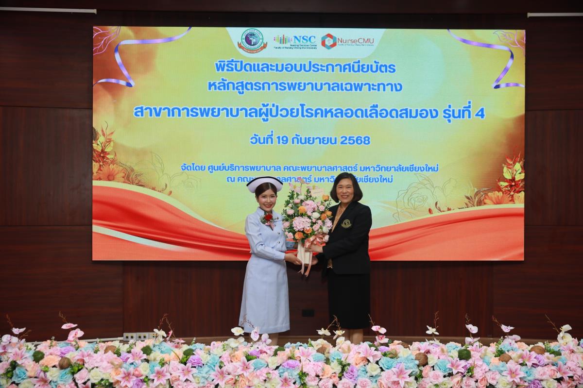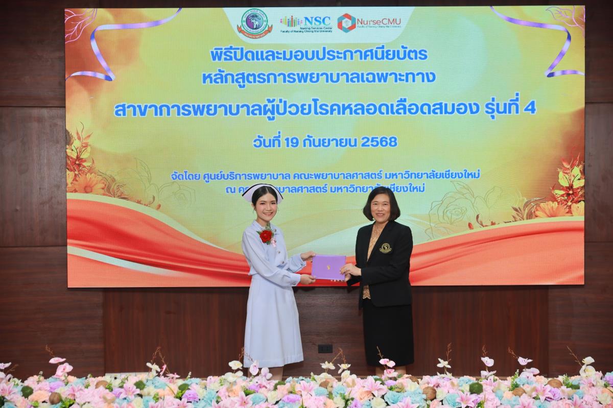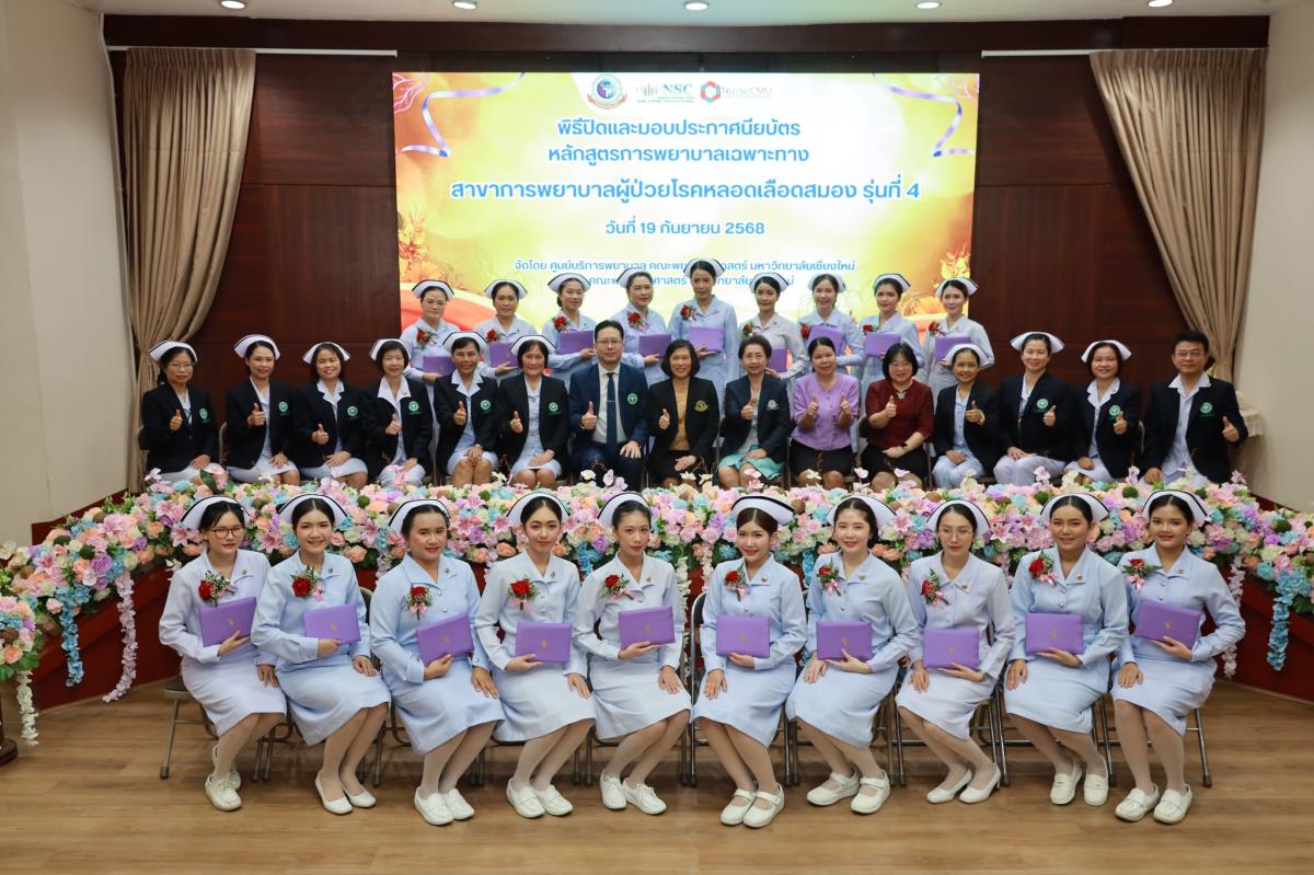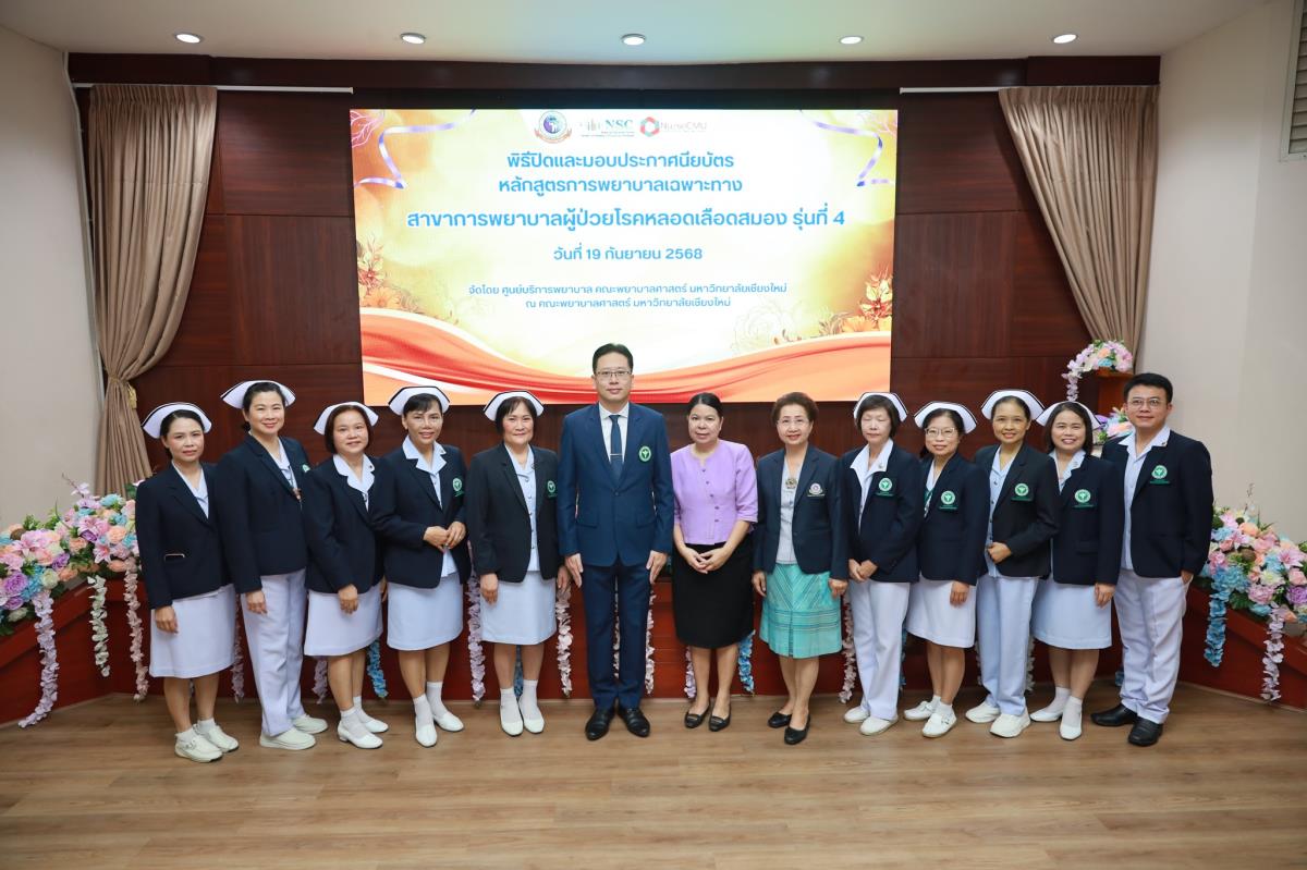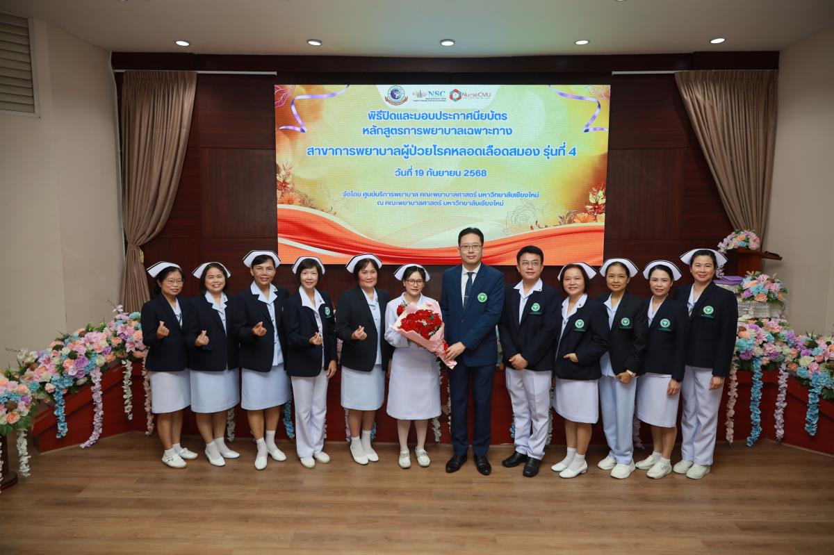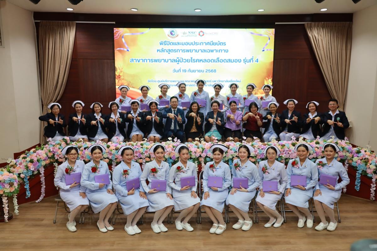 วันศุกร์ที่ 19 กันยายน 2568 ศูนย์บริการพยาบาล คณะพยาบาลศาสตร์ มหาวิทยาลัยเชียงใหม่ ร่วมกับ กลุ่มภารกิจด้านการพยาบาล โรงพยาบาลประสาทเชียงใหม่ จัดพิธีปิดและมอบประกาศนียบัตรการอบรมหลักสูตรการพยาบาลเฉพาะทางสาขาการพยาบาลผู้ป่วยโรคหลอดเลือดสมอง รุ่นที่ 4 โดยมี ผู้ช่วยศาสตราจารย์ ดร.สุภารัตน์ วังศรีคูณ คณบดีคณะพยาบาลศาสตร์ เป็นประธาน ผู้ช่วยศาสตราจารย์ ดร.ณัฐธยาน์ สุวรรณคฤหาสน์ ประธานกรรมการหลักสูตรฯ กล่าวรายงาน ศาสตราจารย์คลินิก ดร.พรรณพิไล ศรีอาภรณ์ ผู้อำนวยการศูนย์บริการพยาบาล และ นายแพทย์ดลสุข พงษ์นิกร ผู้อำนวยการโรงพยาบาลประสาทเชียงใหม่ กล่าวแสดงความยินดี ณ ห้องประชุมชั้น 5 อาคาร 4 คณะพยาบาลศาสตร์