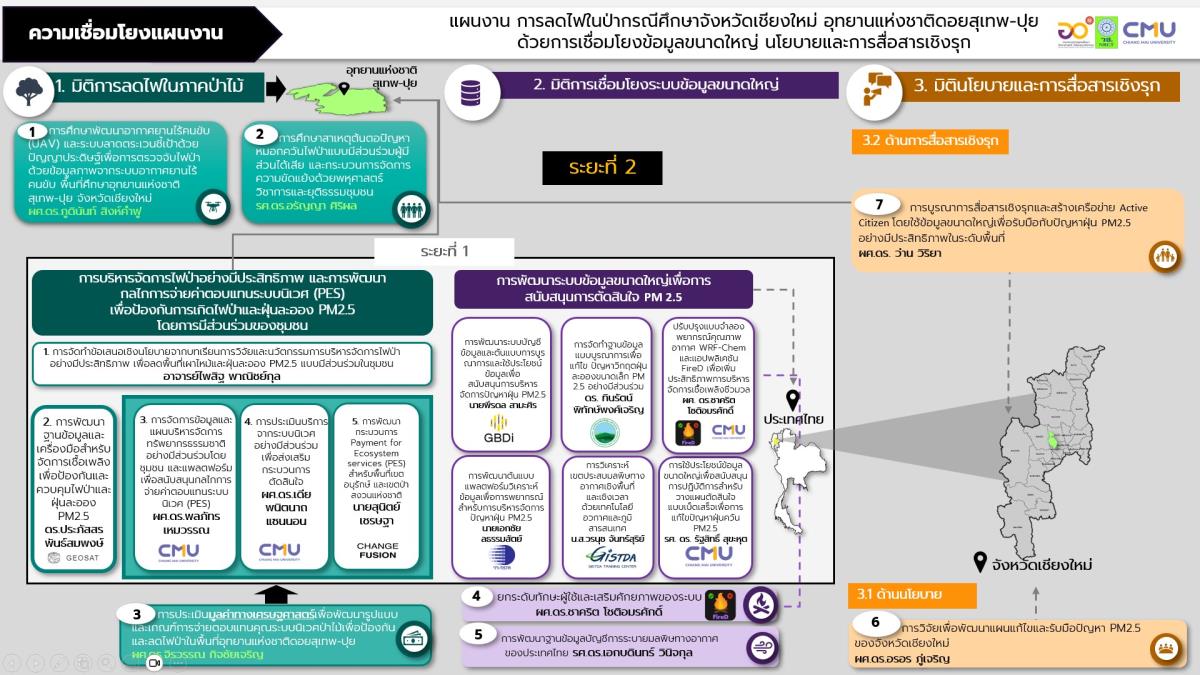 มิติการเชื่อมโยงข้อมูลขนาดใหญ่ และมิตินโยบายและการสื่อสารเชิงรุก ภายใต้ แผนงาน P24 “การลดไฟในป่ากรณีศึกษาจังหวัดเชียงใหม่ อุทยานแห่งชาติดอยสุเทพ-ปุย ด้วยการเชื่อมโยงข้อมูลขนาดใหญ่ นโยบาย และการสื่อสารเชิงรุก”: Air for All – เน้นดำเนินการในพื้นที่อุทยานแห่งชาติดอยสุเทพ-ปุย และจังหวัดเชียงใหม่ นำไปสู่การพัฒนาแผนนโยบายการจัดการปัญหามลพิษทางอากาศระยะ 5 ปีของจังหวัดเชียงใหม่ ควบคู่กับ แผนงานมุ่งเป้า “การลดการเผาในพื้นที่ป่าภาคเหนือด้วยนวัตกรรมและนโยบายแบบมีส่วนร่วม เพื่อการจัดการฝุ่น PM2.5 แบบมุ่งเป้า” โดยมีการขยายผลการดำเนินงานครอบคลุมพื้นที่ 9 จังหวัด ได้แก่ จังหวัดเชียงใหม่ จังหวัดลำพูน จังหวัดลำปาง จังหวัดเชียงราย จังหวัดแพร่ จังหวัดน่าน จังหวัดพะเยา จังหวัดแม่ฮ่องสอน และจังหวัดตาก โดยมี รองศาสตราจารย์ ดร.สมพร จันทระ ประธานคณะทำงานด้านวิชาการเพื่อสนับสนุนการแก้ไขปัญหาหมอกควันภาคเหนือ มหาวิทยาลัยเชียงใหม่ และหัวหน้าศูนย์วิจัยวิทยาศาสตร์สิ่งแวดล้อม คณะวิทยาศาสตร์ มหาวิทยาลัยเชียงใหม่ เป็นผู้อำนวยการแผนงาน ซึ่งดำเนินการวิจัยร่วมกับเครือข่ายนักวิจัยของมหาวิทยาลัย และผู้มีส่วนได้ส่วนเสีย ทั้งหน่วยงานภาครัฐ ภาคประชาชน และภาคเอกชน โดยได้รับการสนับสนุนทุนวิจัยจาก สำนักงานการวิจัยแห่งชาติ (วช.) ประจำปีงบประมาณ 2567 และ 2568 และกำลังอยู่ในระหว่างการดำเนินงานเพื่อผลลัพธ์ประเทศไทยปลอดภัย จาก PM2.5 ตามนโยบายของประเทศต่อไป