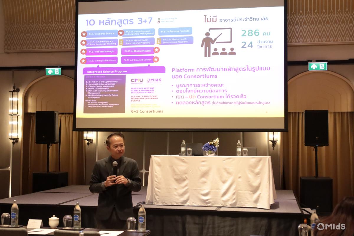 และในช่วงบ่าย ได้รับเกียรติจาก ศาสตราจารย์ปฏิบัติ ดร.ชรินทร์ เตชะพันธุ์ รองอธิการบดีมหาวิทยาลัยเชียงใหม่ และประธานคณะกรรมการอำนวยการ MIdS ร่วมกับ กองแผนงาน มหาวิทยาลัยเชียงใหม่ บรรยายในหัวข้อ แนวทางการดำเนินงานตามแผนปฏิบัติการที่สำคัญ (Action Plan) ตามแผนพัฒนาการศึกษา มหาวิทยาลัยเชียงใหม่ ระยะที่ 13 (พ.ศ.2566-2570) และความคาดหวังที่มหาวิทยาลัยต้องการจากวิทยาลัยพหุวิทยาการและสหวิทยาการ และกิจกรรมถัดมาเป็นการแบ่งกลุ่มระดมสมอง เพื่อจัดทำแผนกลยุทธ์ประจำปีงบประมาณ พ.ศ. 2569 ณ โรงแรมอินเตอร์คอนติแนนตัล เชียงใหม่ แม่ปิง