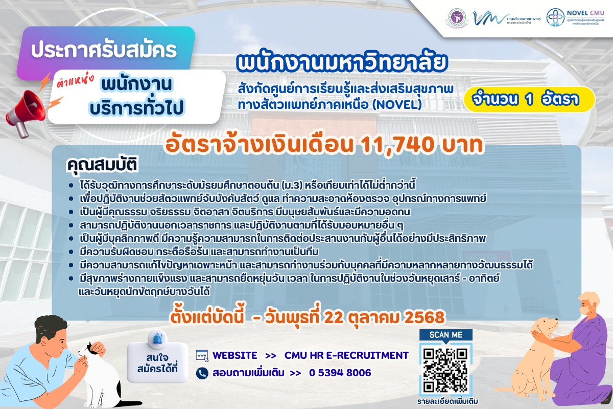 คณะสัตวแพทยศาสตร์ มช. รับสมัครงาน ตำแหน่งพนักงานบริการทั่วไป จำนวน 1 อัตรา