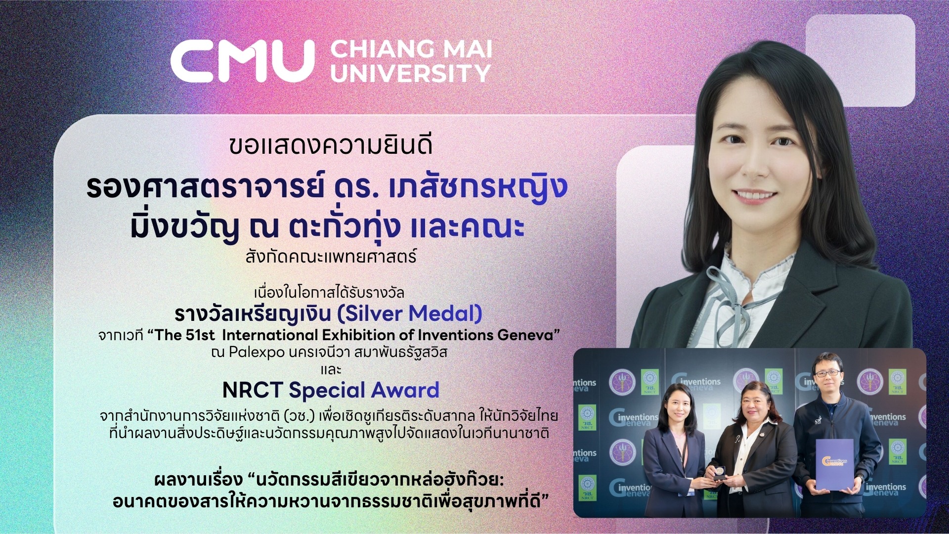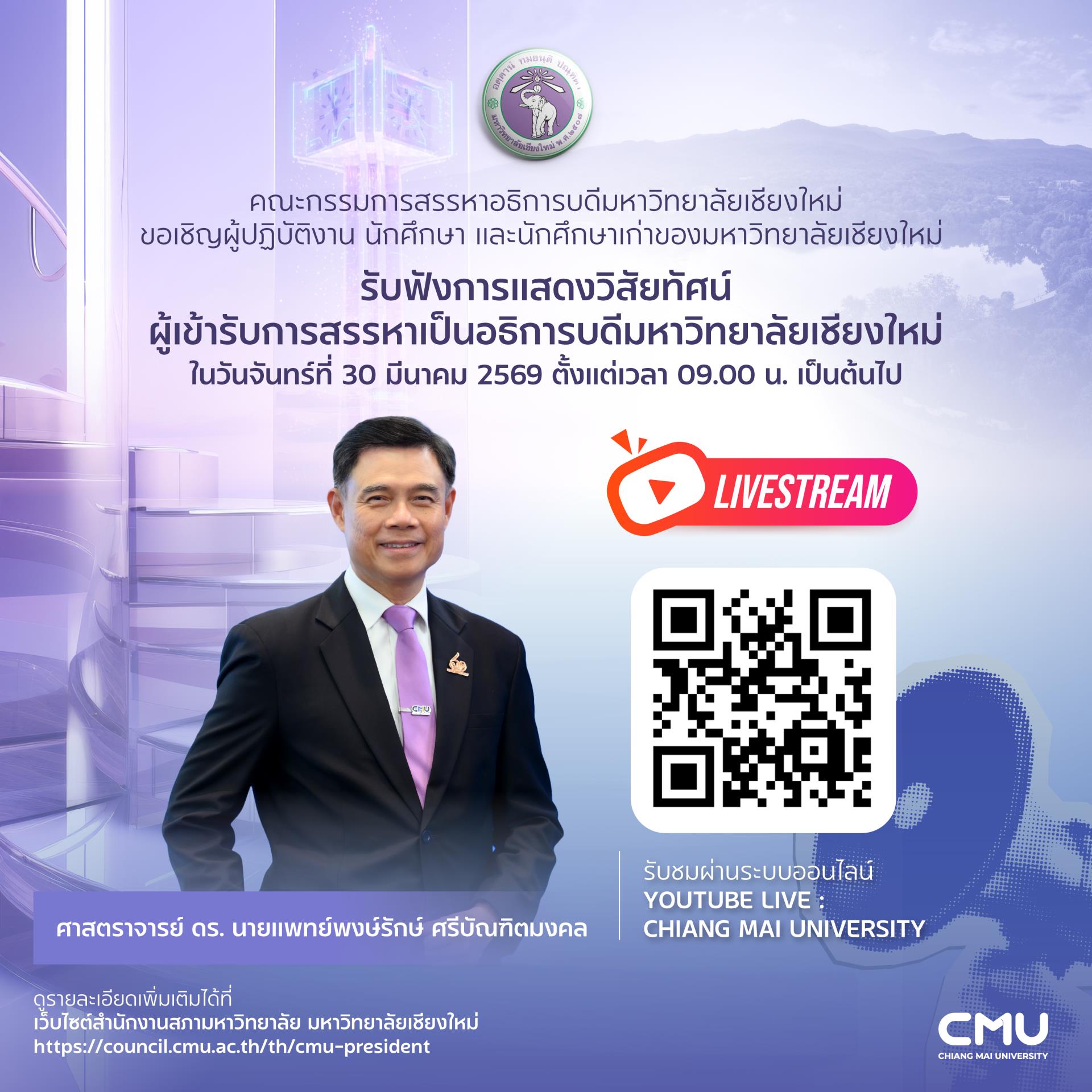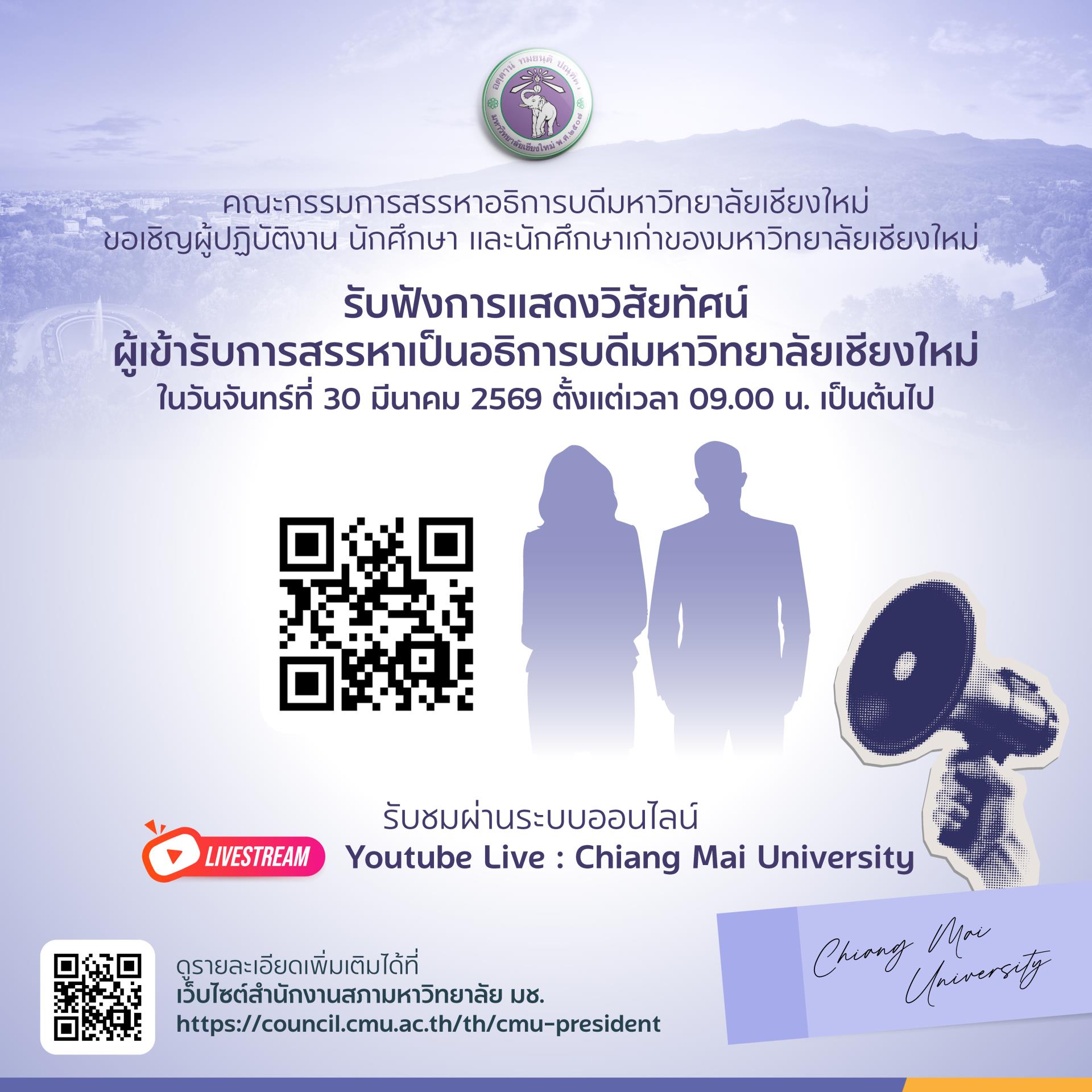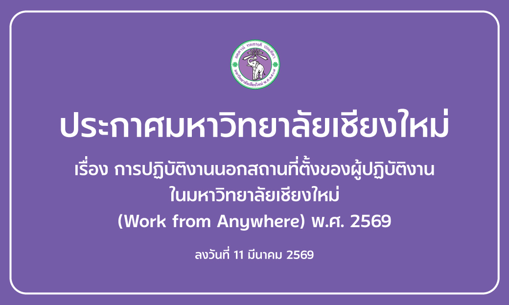มหาวิทยาลัยเชียงใหม่มุ่งสร้างองค์ความรู้และนวัตกรรมที่ทันสมัย พร้อมพัฒนากำลังคนคุณภาพสูง เพื่อตอบโจทย์การเปลี่ยนแปลงของโลก และขับเคลื่อนสังคมสู่อนาคตที่ยั่งยืนด้วยวิทยาการและภูมิปัญญาที่ผสมผสานระหว่างเทคโนโลยีล้ำสมัยกับรากฐานทางวัฒนธรรมที่เข้มแข็ง