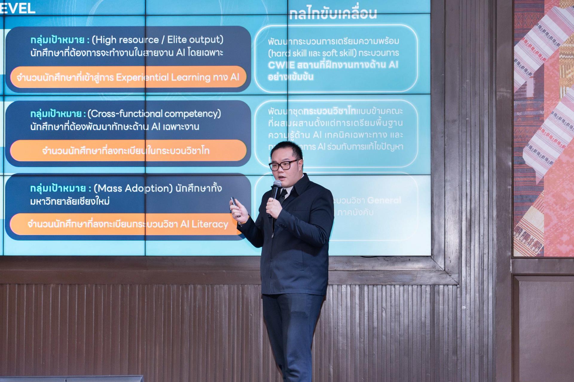 - ด้าน Learning มุ่งเพิ่มศักยภาพการศึกษาที่สนับสนุนการใช้ AI สำหรับนักศึกษาทุกคน แบ่งระดับการเรียนรู้ตั้งแต่ความรู้พื้นฐาน (AI Literacy) ระดับผู้สนใจเฉพาะด้าน (AI Interest) และระดับเชี่ยวชาญ (AI Expert) ผ่านการจัดกลุ่มกระบวนวิชาและวิชาโทที่เหมาะสมกับบริบทของผู้เรียน เพื่อให้นักศึกษาทุกคณะสามารถเข้าถึงและใช้ AI ได้อย่างเหมาะสม