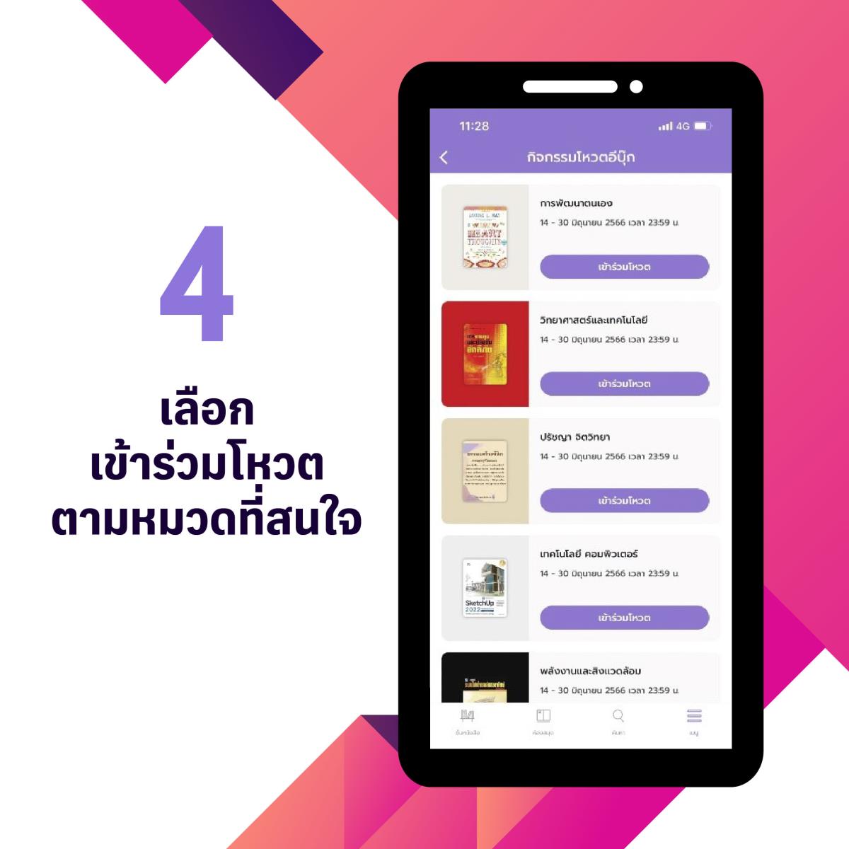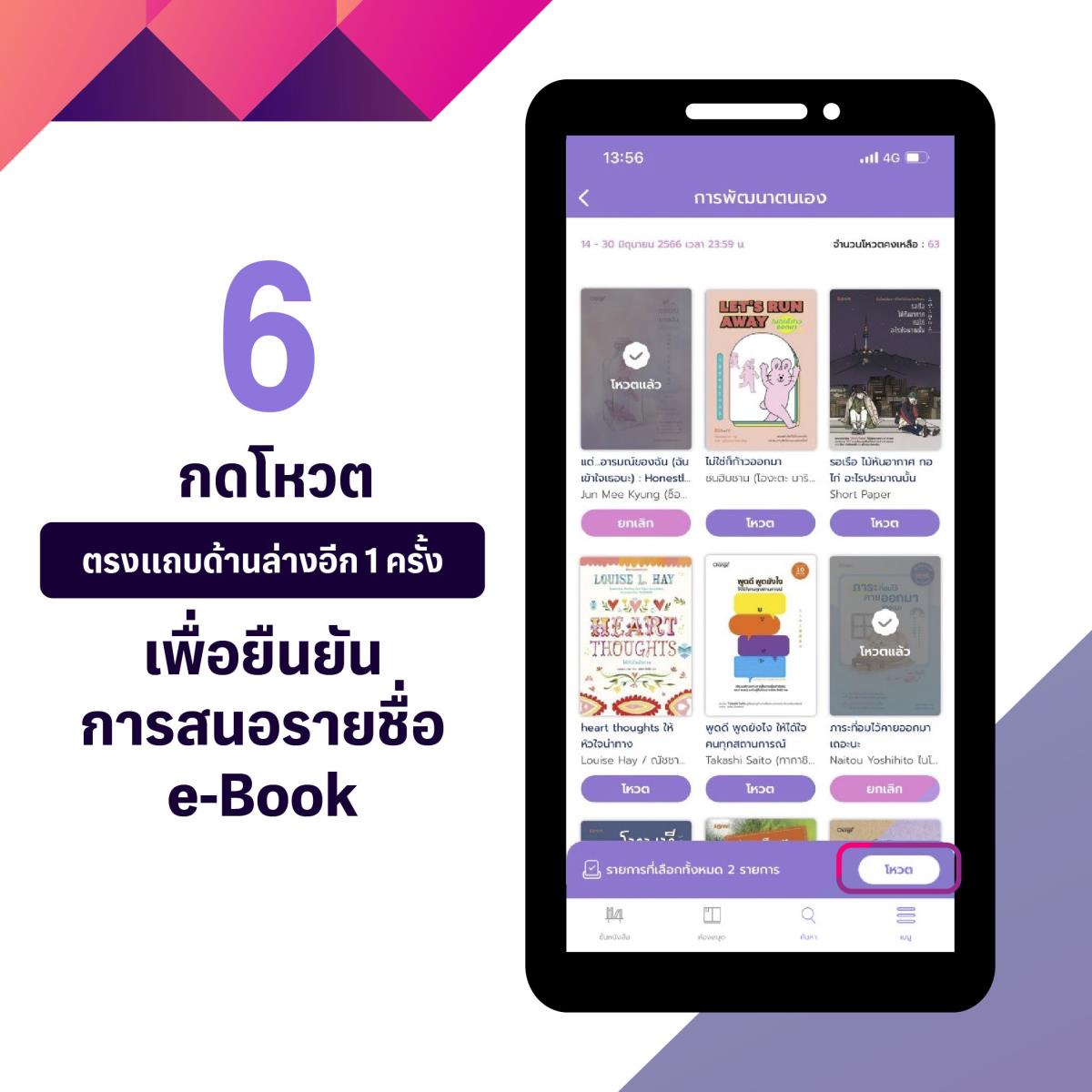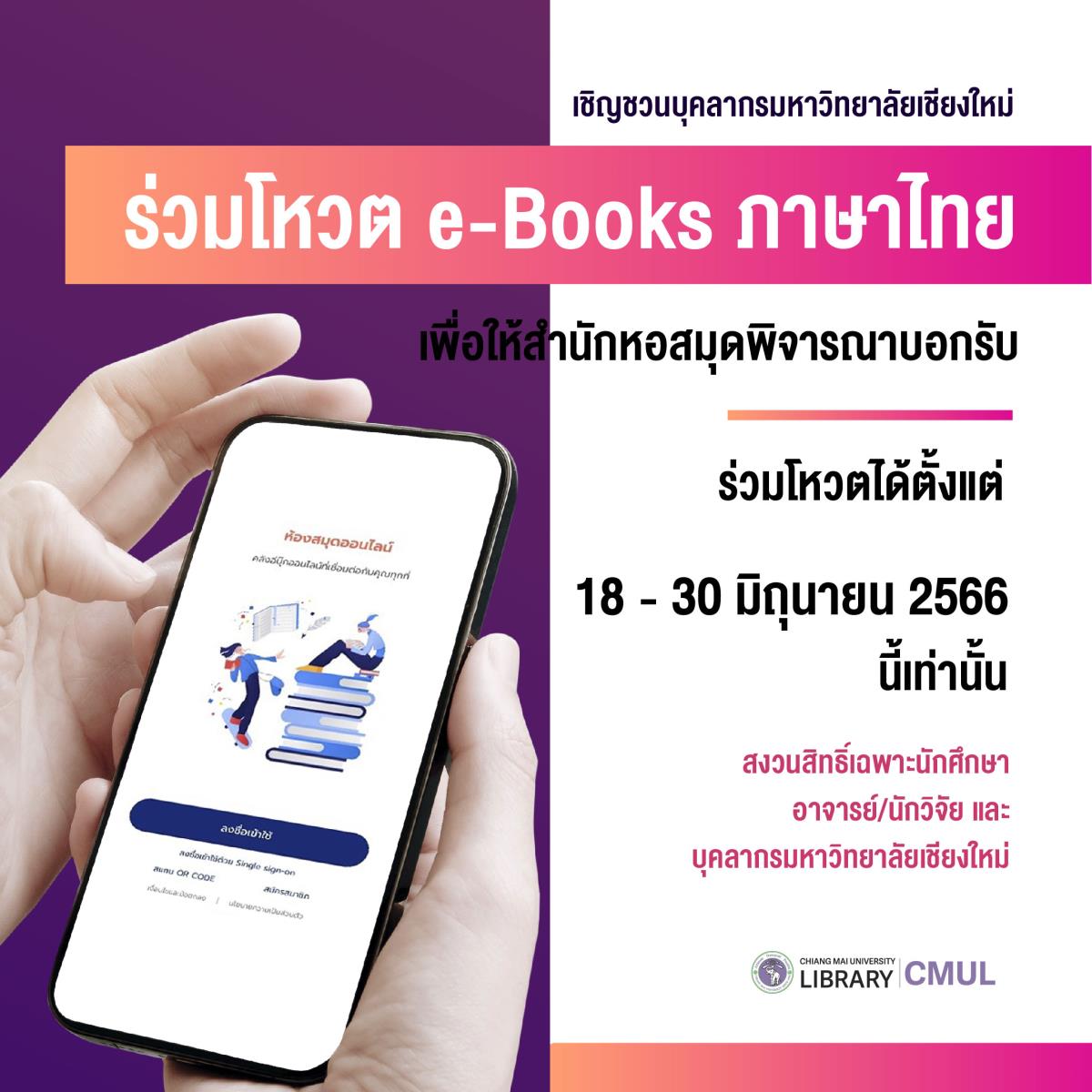 清迈大学图书馆邀请用户为泰语电子书投票,以供图书馆订阅考虑。从现在起至2023年6月30日,通过Hibrary应用程序或访问