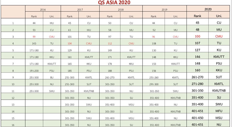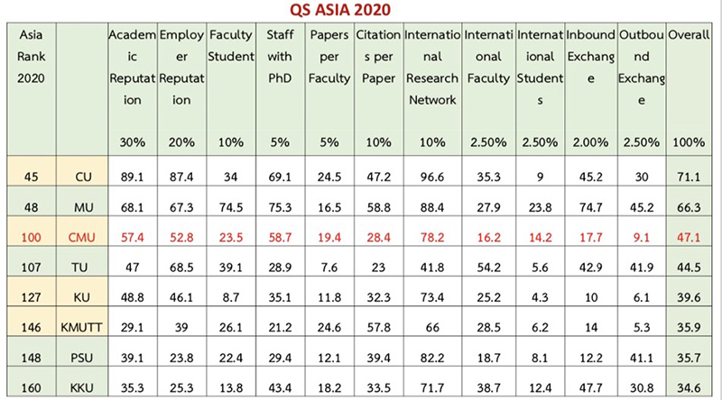 2020QS 亚洲大学排名出炉,清迈大学名列泰国第三