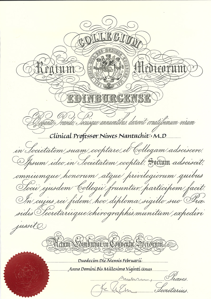 清迈大学 贺 清迈大学校长,临床医学教授尼维(Niwes Nanthachit)博士荣获爱丁堡皇家内科医学院颁发的荣誉证书及奖学金。