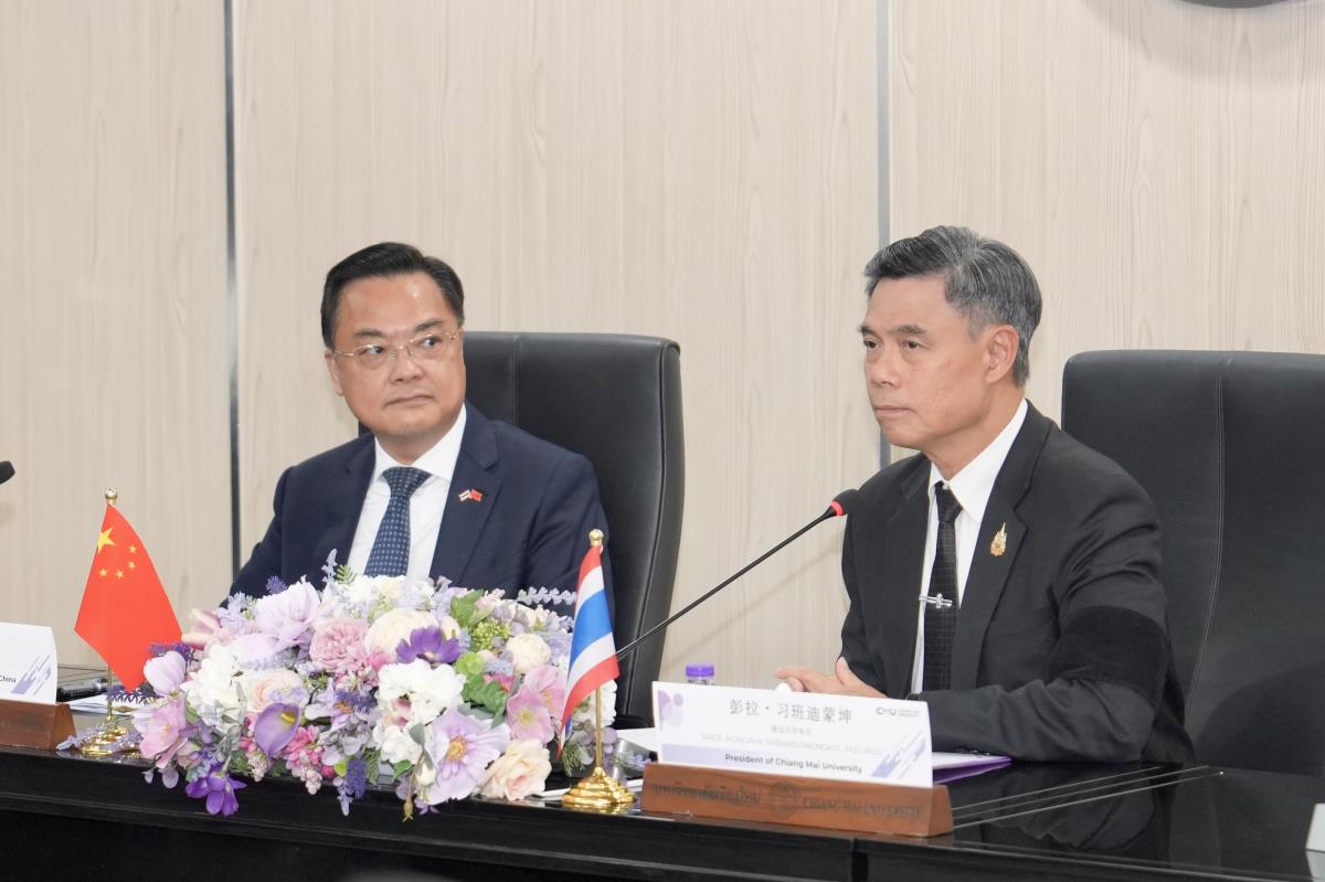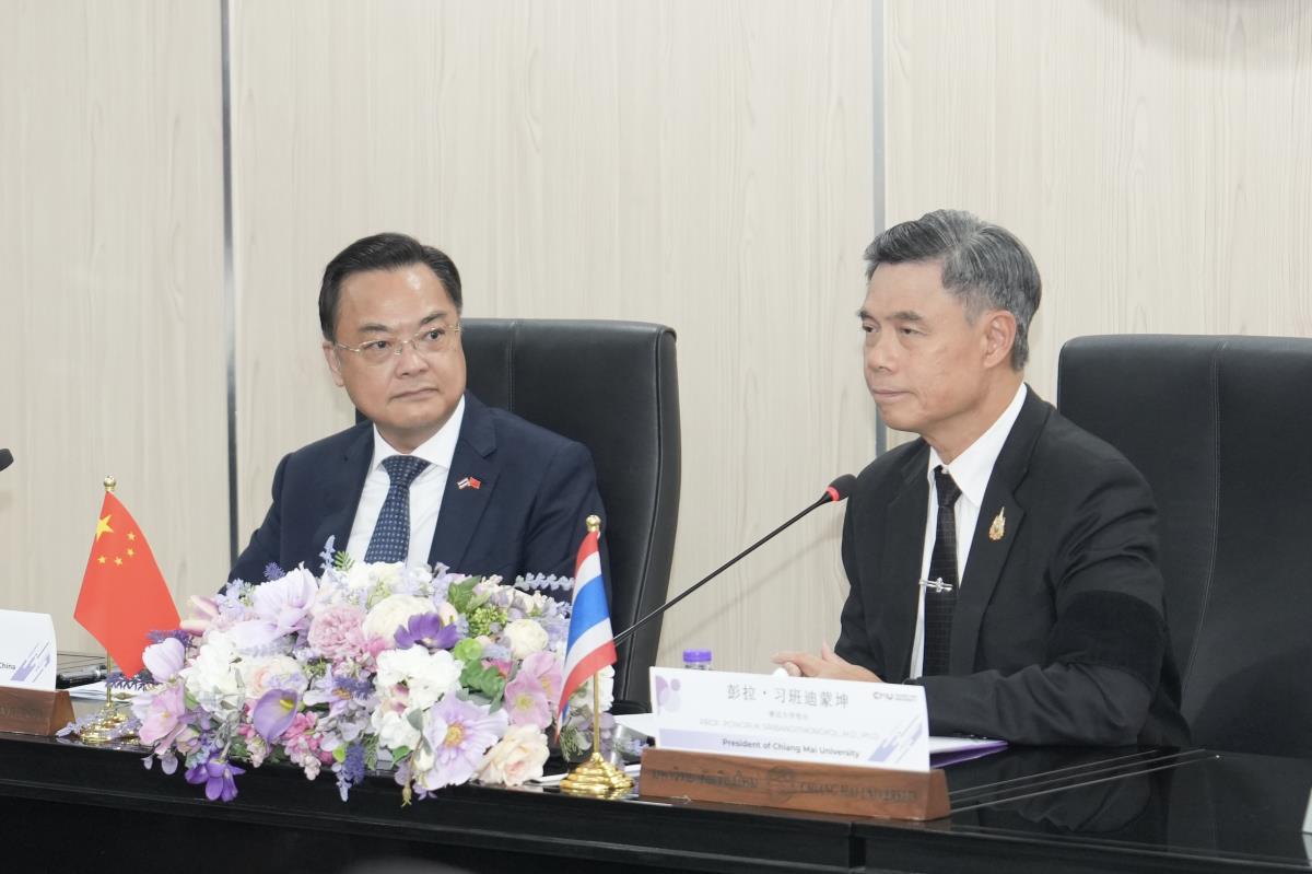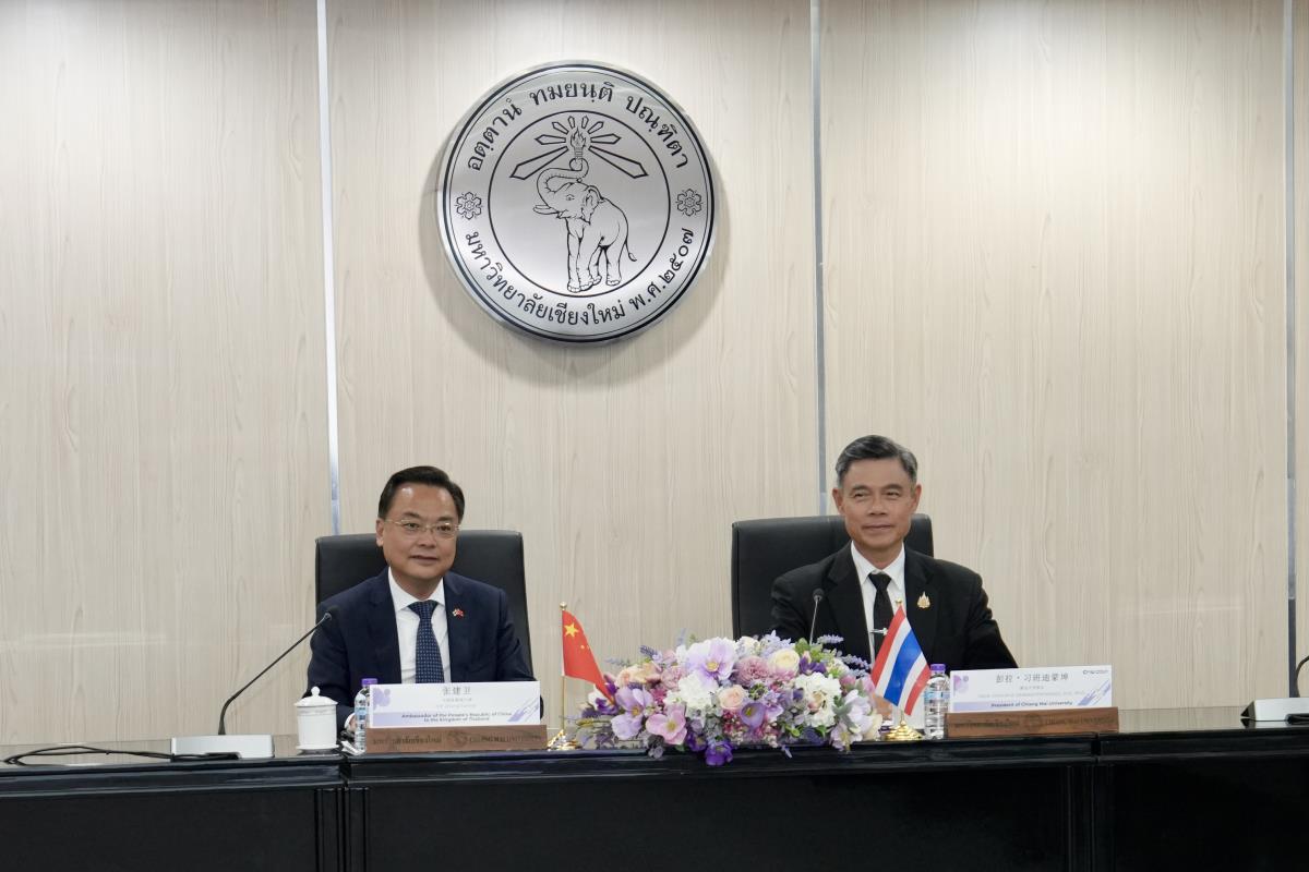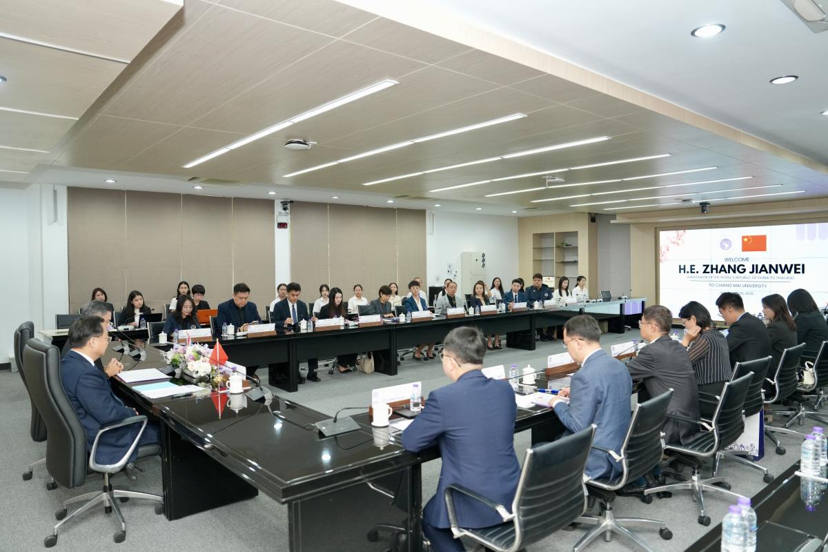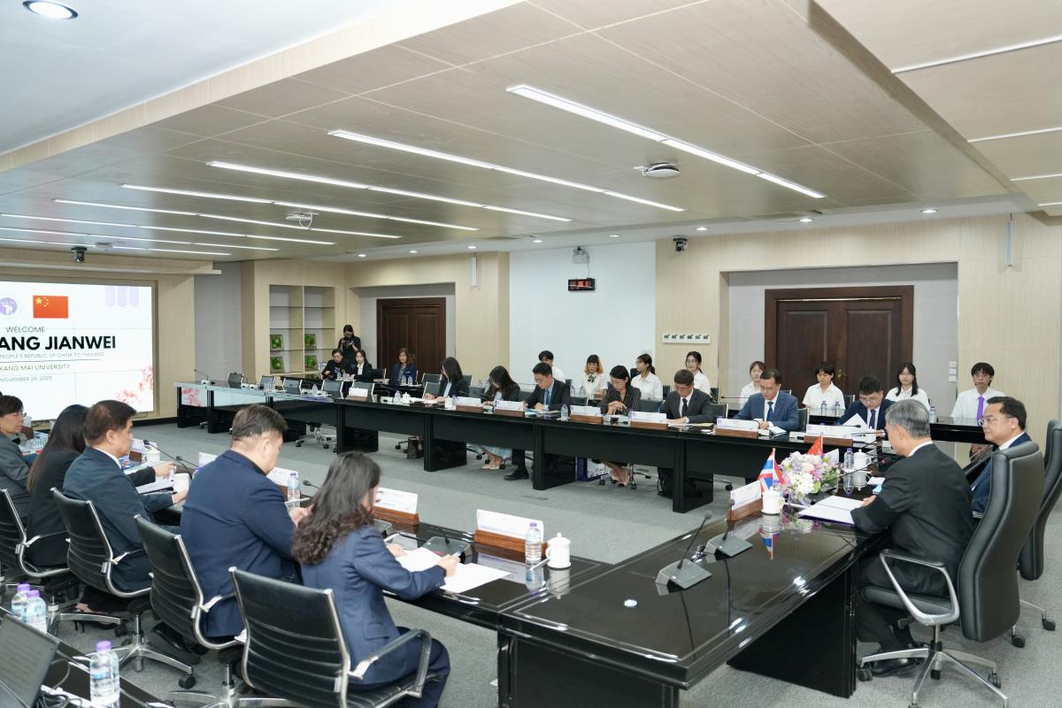 清迈大学校长 Pongruk Sribanditmongkol 教授(博士) 于 2025 年 11 月 26 日在清迈大学办公楼一层 Phraya Srivisnvacha 会议室,率学校管理团队隆重接待 中华人民共和国驻泰王国大使张建卫阁下及随行代表团。在此次访问中,双方就未来学术合作方向进行了深入交流,着重探讨推动清迈大学与中国高校在教育、科研与人才交流等领域的合作机遇。此行将进一步巩固与拓展清迈大学与中华人民共和国教育机构之间的战略合作关系。
