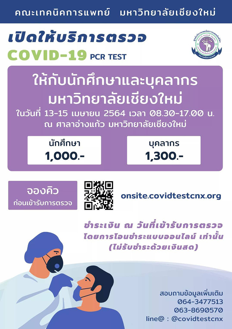CMU students/staff who have had contact with a confirmed COVID-19 case or have been to a night club listed in the Chiang Mai Provincial Public Health Office announcement can take the COVID-19 test at Ang Kaew pavilion, Chiang Mai University between 13 - 15 April 2021, 8.30 am - 5. 00 pm.