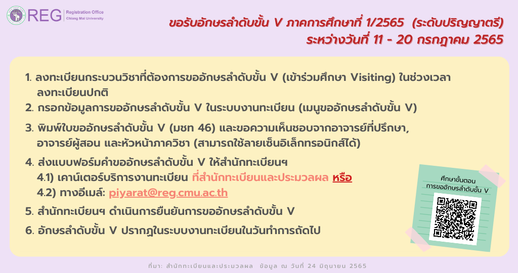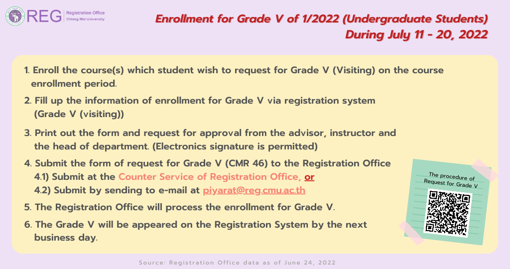 Request for grade V for undergraduate courses, the first semester of 2022 during July 11-20, 2022 via registration system at https://cmu.to/requestV