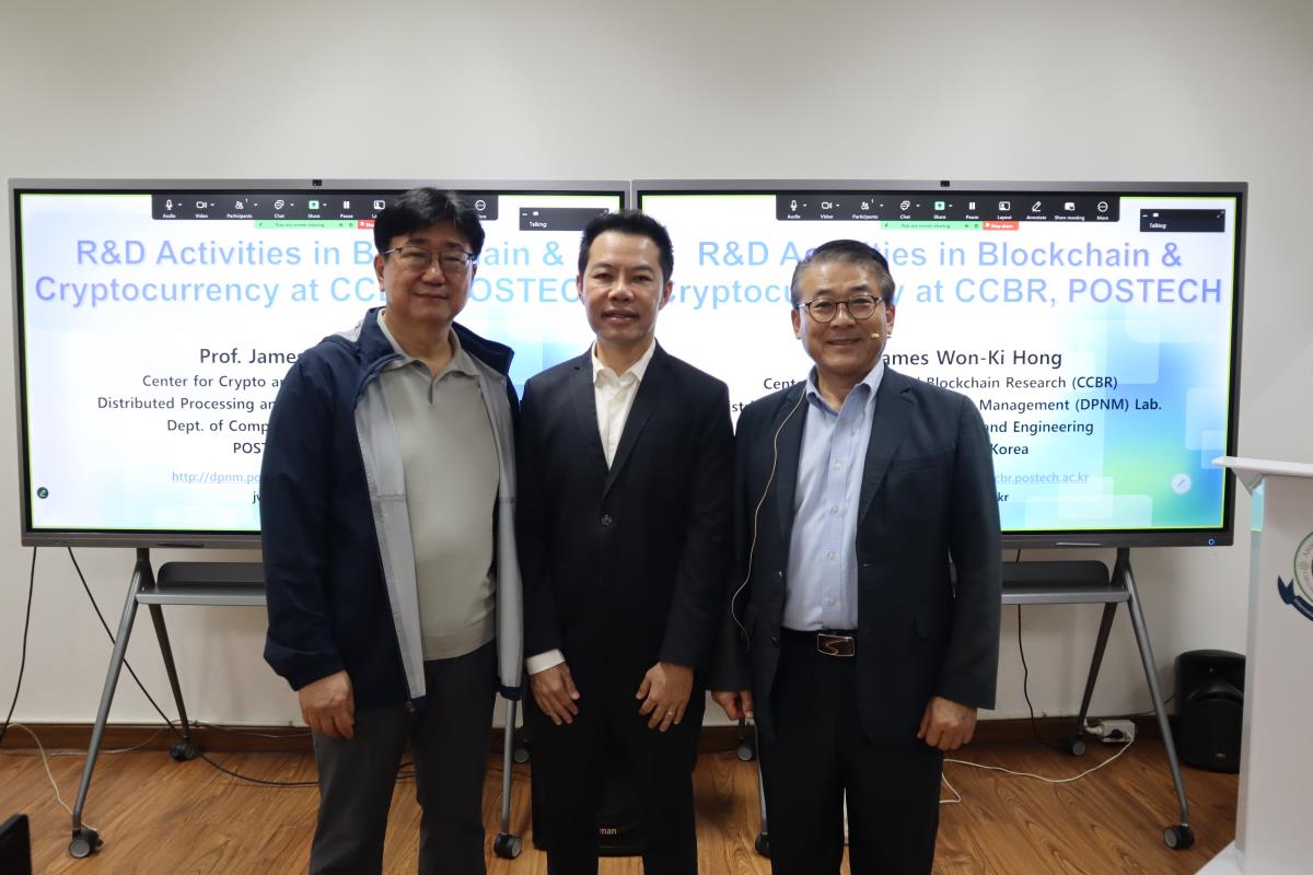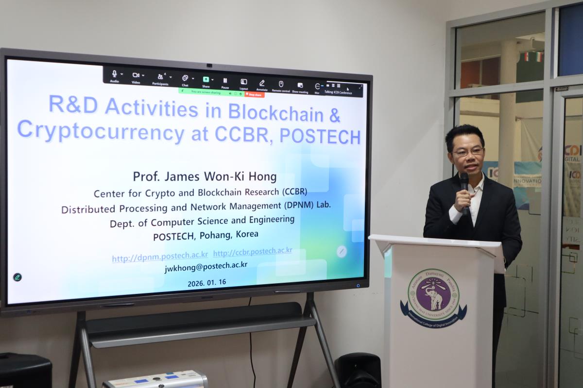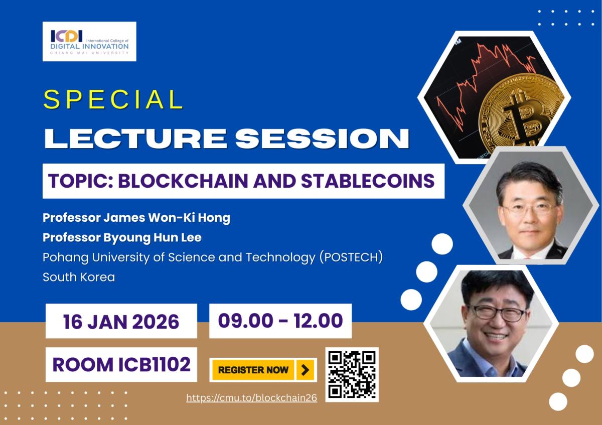 On 16 January 2026, the International College of Digital Innovation, Chiang Mai University (ICDI CMU), organized a Special Lecture Session on the topic “Blockchain and Stablecoins” at Room ICB1102, ICDI Building. The session featured distinguished digital technology experts from South Korea: Professor James Won-Ki Hong and Professor Byoung Hun Lee from the Pohang University of Science and Technology (POSTECH).