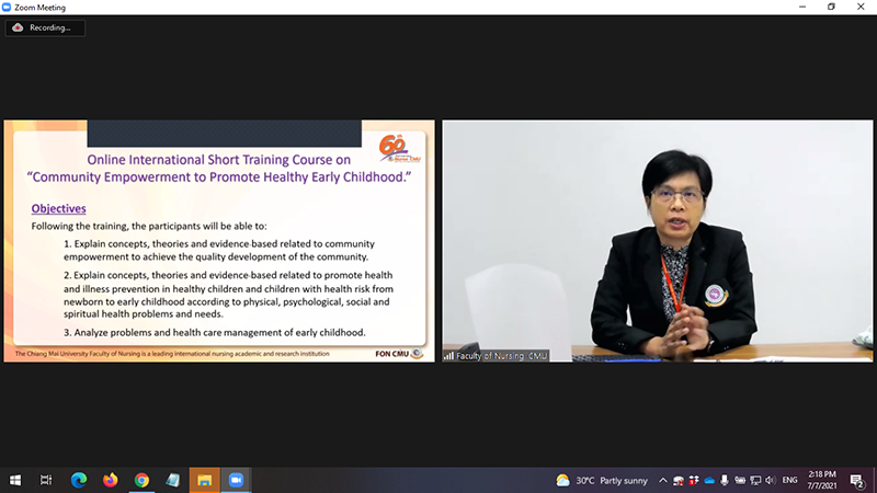 The Faculty of Nursing, Chiang Mai University, Chiang Mai, Thailand, supported by the Thailand International Development Cooperation Agency (TICA), organized an online international short training course on “Community Empowerment to Promote Healthy Early Childhood” during July 7 - 23, 2021 via Nurse CMU Moodle and the Zoom Cloud Meetings platform. The participants were 40 people from 18 countries: Algeria, Azerbaijan, Botswana, Brazil, Ecuador, Guyana, India, Indonesia, Iran, Iraq, Maldives, Morocco, Myanmar, Peru, Philippines, Sri Lanka, Tanzania, Uzbekistan. This course was honored to open with welcome speeches by Miss Hataichanok Siriwadhanakul, Director of Human Resources Development Bureau, at the Thailand International Cooperation Agency (TICA), and Asst. Prof. Dr.Thanee Kaewthummanukul, Ph.D., RN, Dean, Faculty of Nursing, Chiang Mai University. The opening speech was given by Clinical Professor Niwes Nantachit, President of Chiang Mai University. The participants will meet the following objectives: