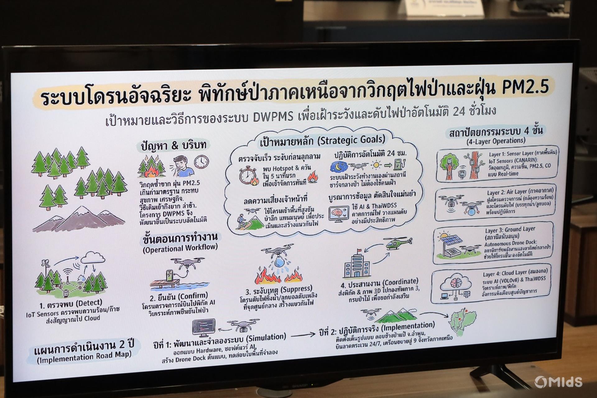 Proposed by Associate Professor Dr. Apichat Sophadang, focusing on a 24/7 autonomous drone system for wildfire surveillance and suppression in Northern forests.