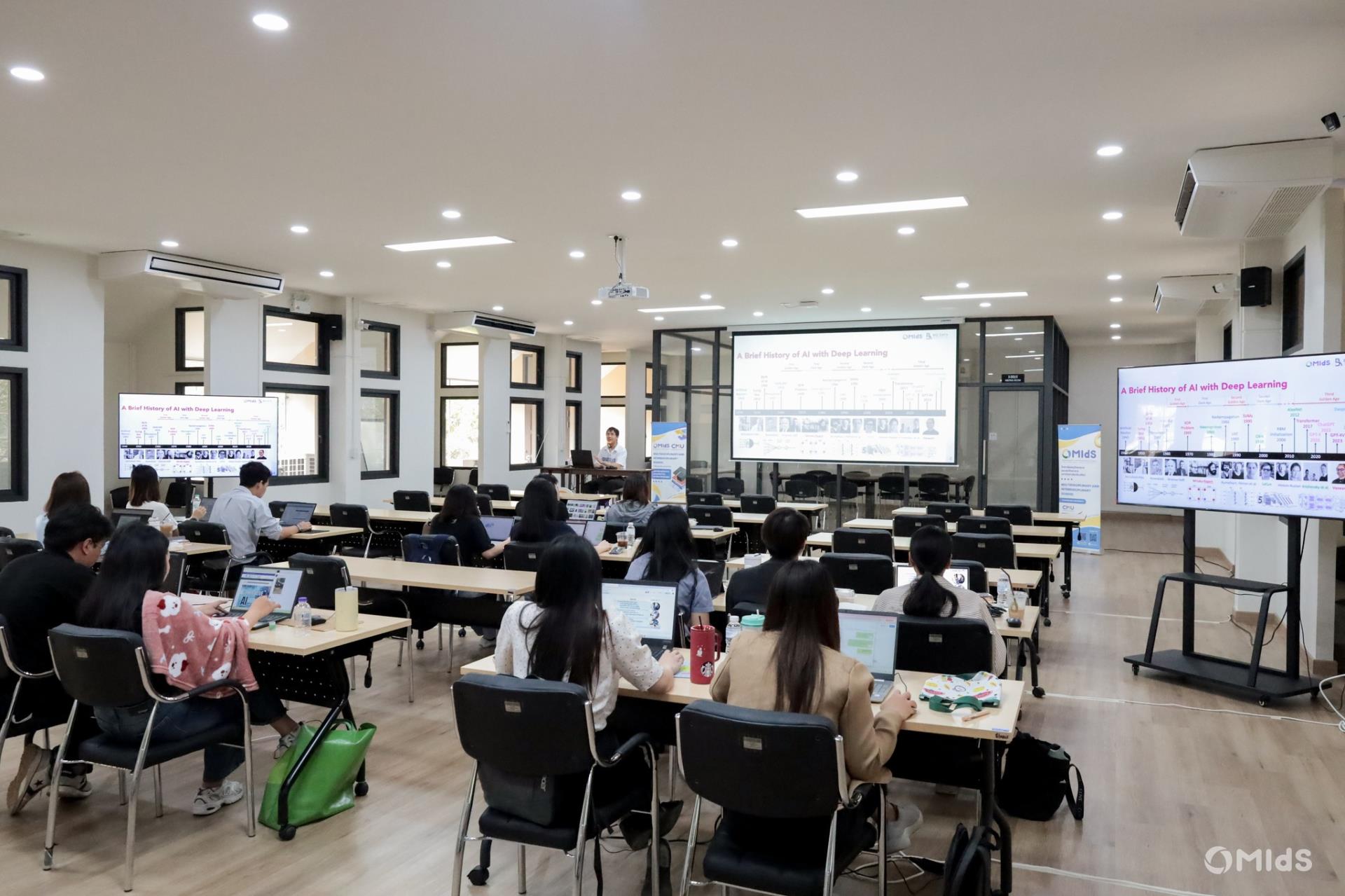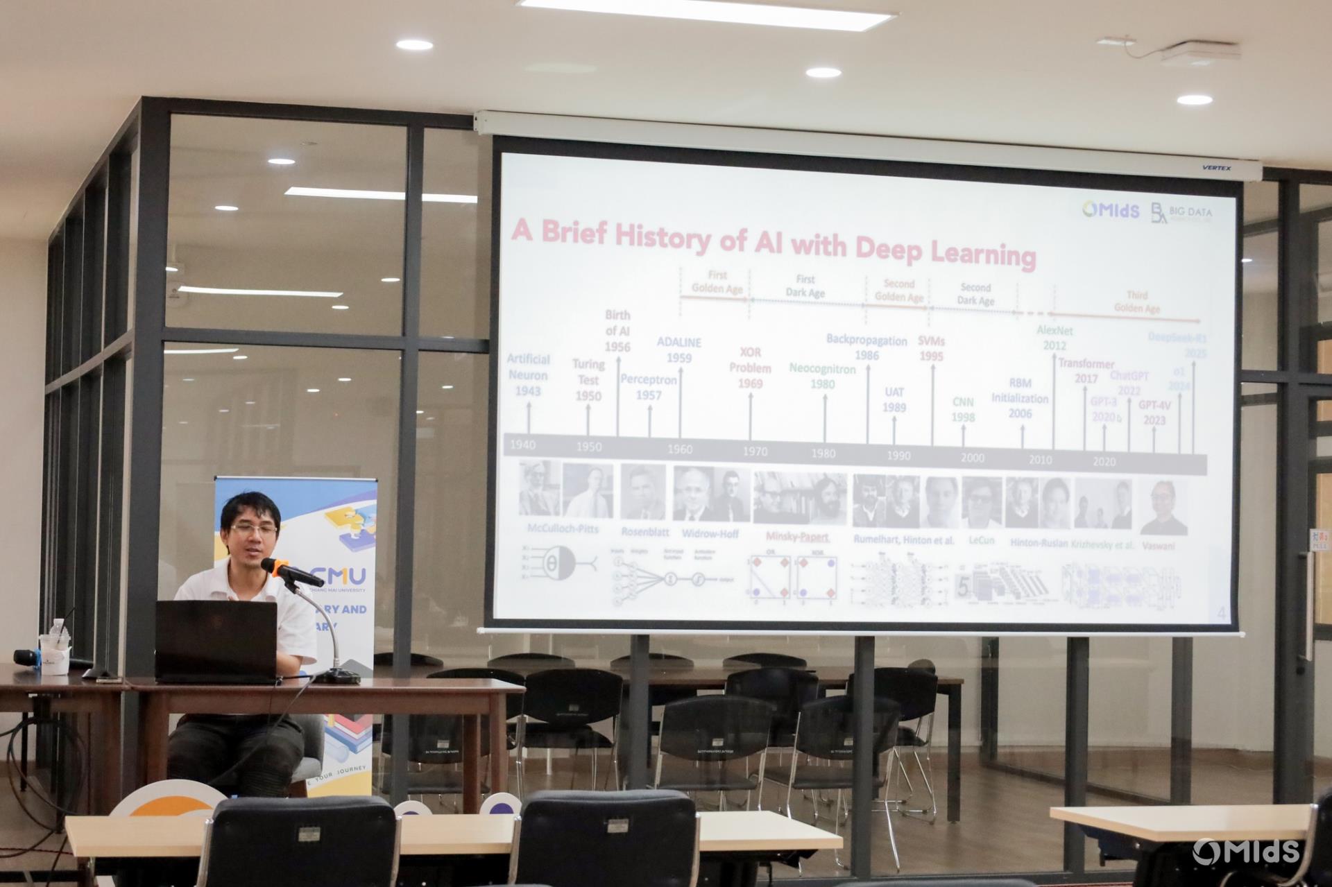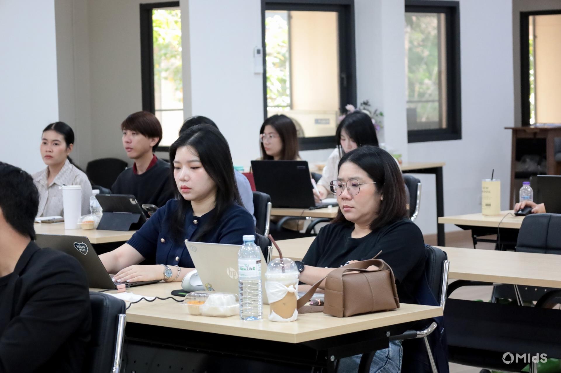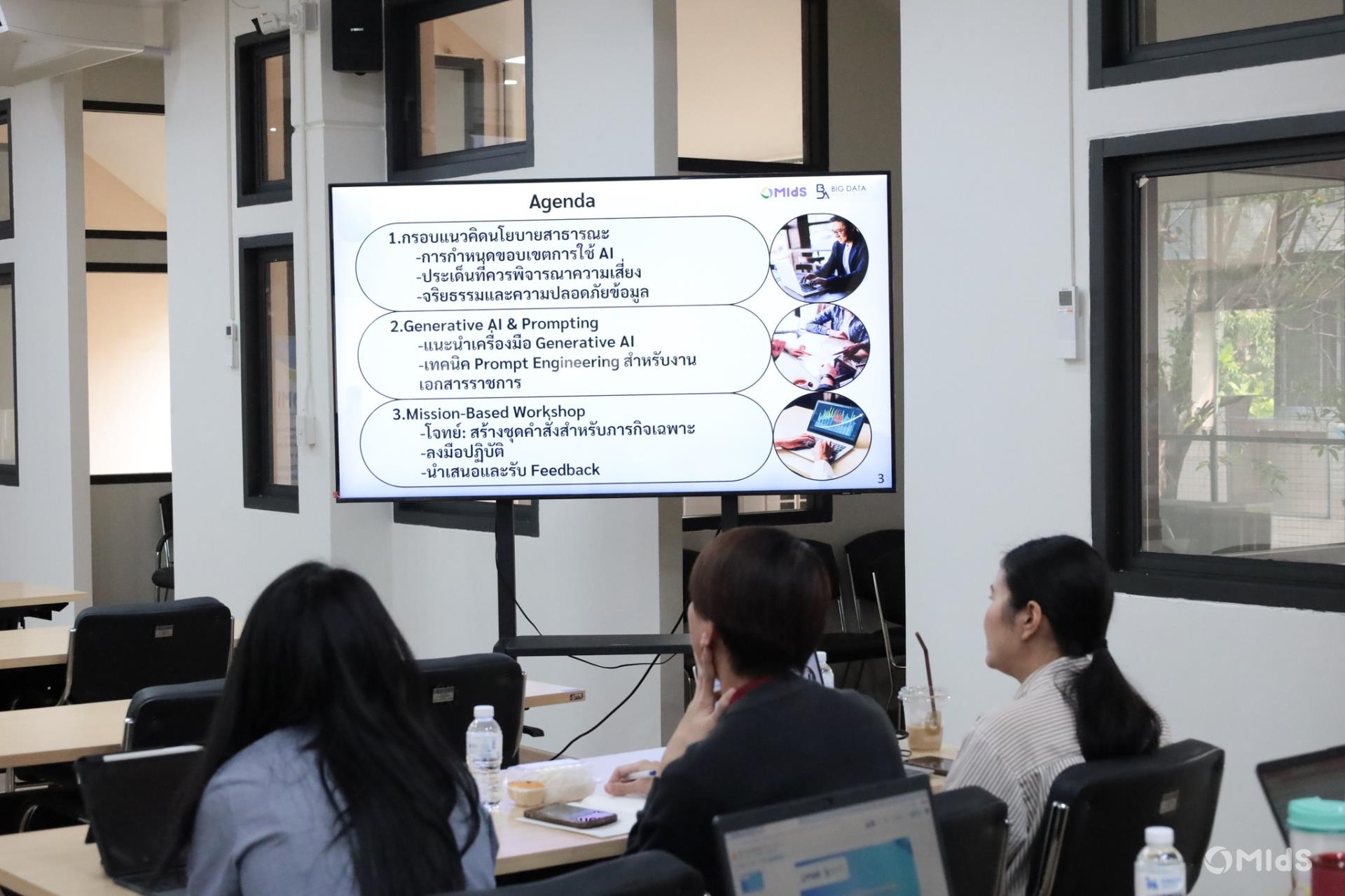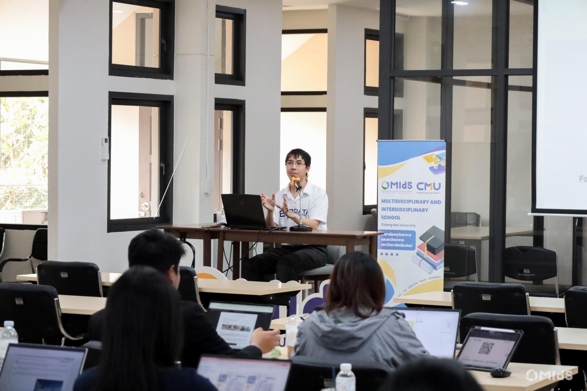 The workshop was conducted by a team of expert speakers from Big Data Agency Co., Ltd., featuring lectures and hands-on sessions on public policy frameworks, fundamental concepts of Generative AI, effective Prompt Engineering techniques, and the application of AI in the public sector. Participants also engaged in a Mission-Based Workshop designed to develop practical thinking and AI utilization skills through real-world problem scenarios. The training took place at Room 2-202, 2nd Floor, Building 2, MIdS CMU.
