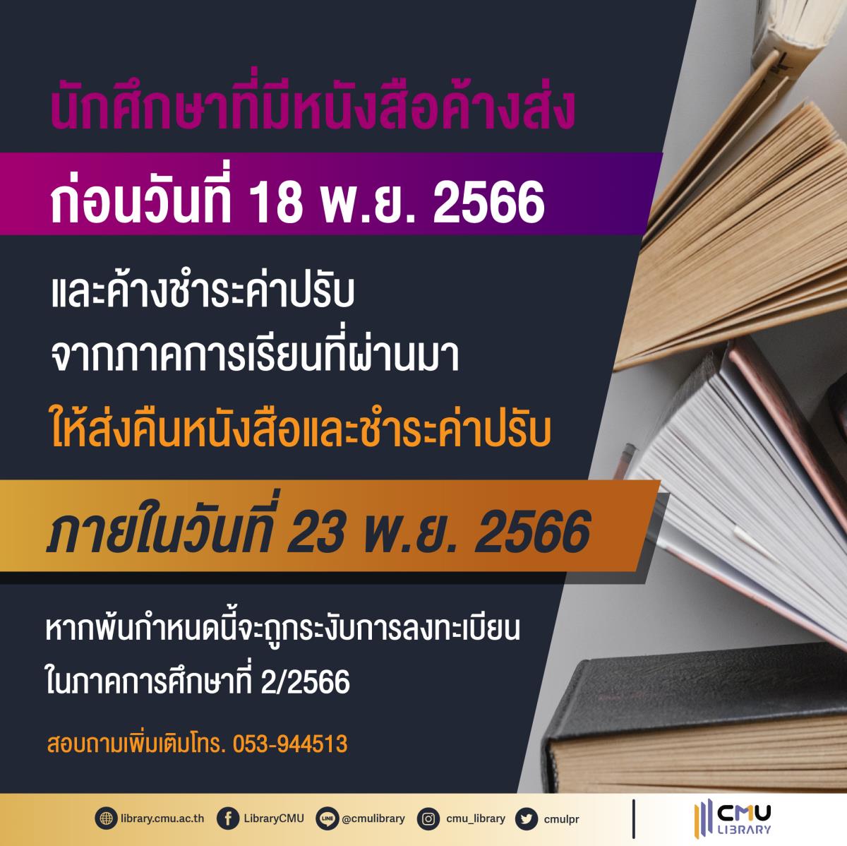 Chiang Mai University Library announces the debt settlement and book return process for students who have outstanding fines and overdue books from the previous semester (before November 18, 2023). Please return the books and pay the fines by November 23, 2023.