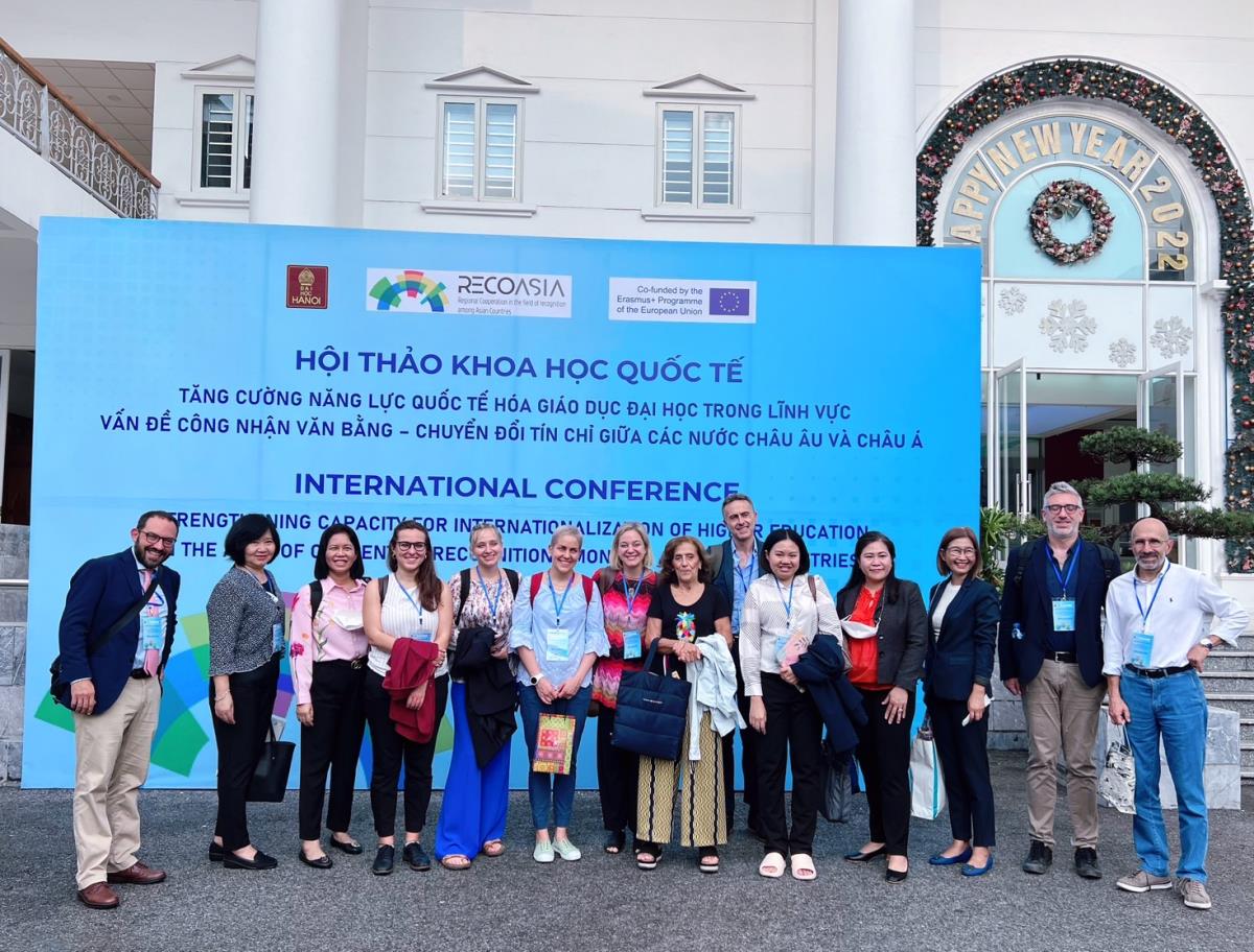 International College of Digital Innovation, as a representative of Chiang Mai University, participating in the Erasmus+ RecoAsia: Regional Cooperation in the field of recognition among Asian countries project, under the budget of the European Union, and under the cooperation of project members from organizations and universities from Italy, Estonia, Mongolia, Vietnam, Cambodia, and Thailand. This RecoAsia project has organized the International Conference “Strengthening Capacity for Internationalization of Higher Education in the area of Credential Recognition among EU and Asian Countries.” and Steering Committee Meeting during 3-6 October 2022 at Hanoi University, Republic of Vietnam. Assistant Professor Dr. Benjamas Suksatit, Associate Dean, and Mrs. Wiranya Ratnapinda, General staff of ICDI participated in this meeting with project members from Thailand, namely the Office of the Permanent Secretary, Ministry of Higher Education, Research and Innovation and Mahidol University.