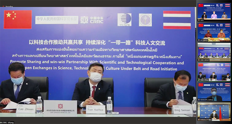 CMU vice president, Assoc. Prof. Dr. Sampan Singharajwarapan, accompanied by Asst. Prof. Dr. Chatchawan Chaichana, Associate Dean for Research, Innovation and International Affairs of the Faculty of Engineering, and Assoc. Prof. Dr . Peerapong Jitsangiam, attended the online ceremony on 15th March 2022 to sign the MoU between CRRC Qingdao Sifang Co., Ltd, Thailand Institute of Scientific and Technological Research, and universities in China and Thailand.