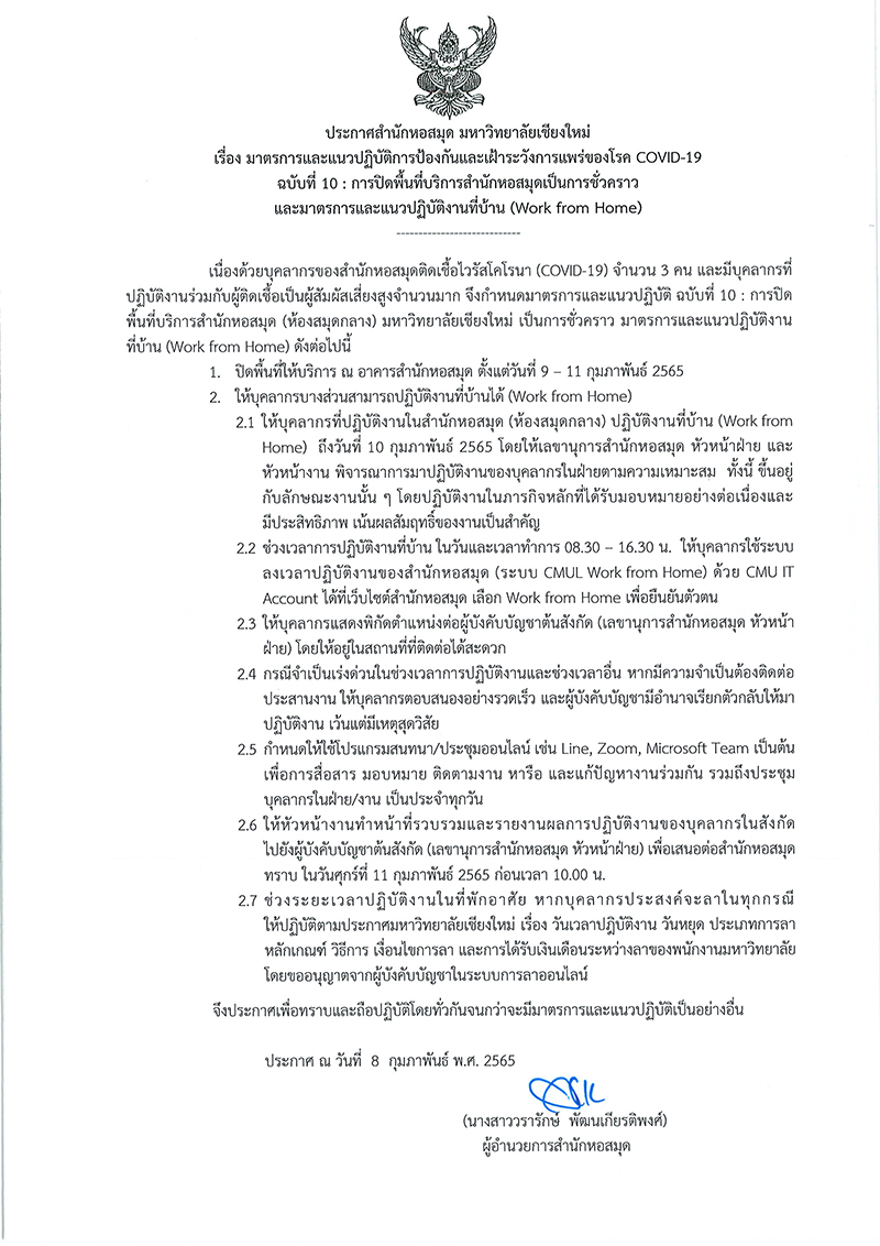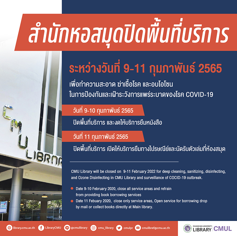 CMU Library will be closed on 9-11 February 2022 for deep cleaning, sanitizing, disinfecting, and Ozone Disinfecting in CMU Library and surveillance of COCID-19 outbreak.