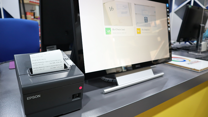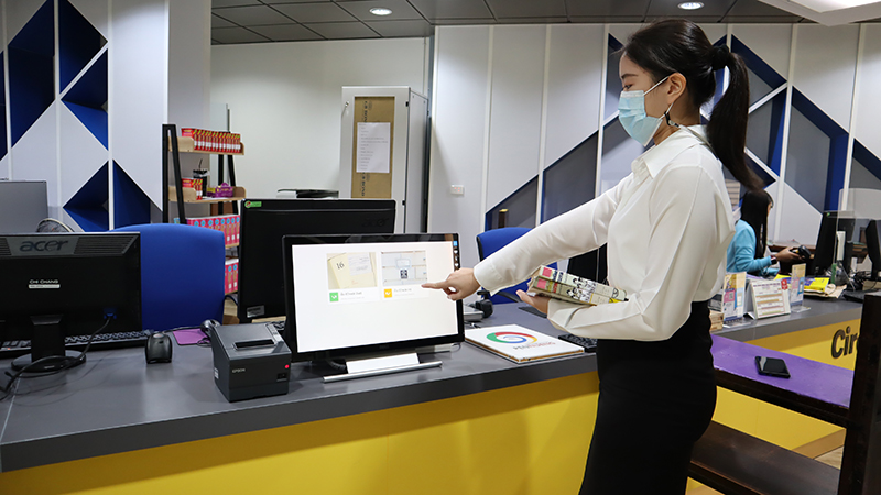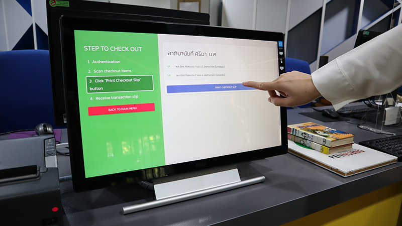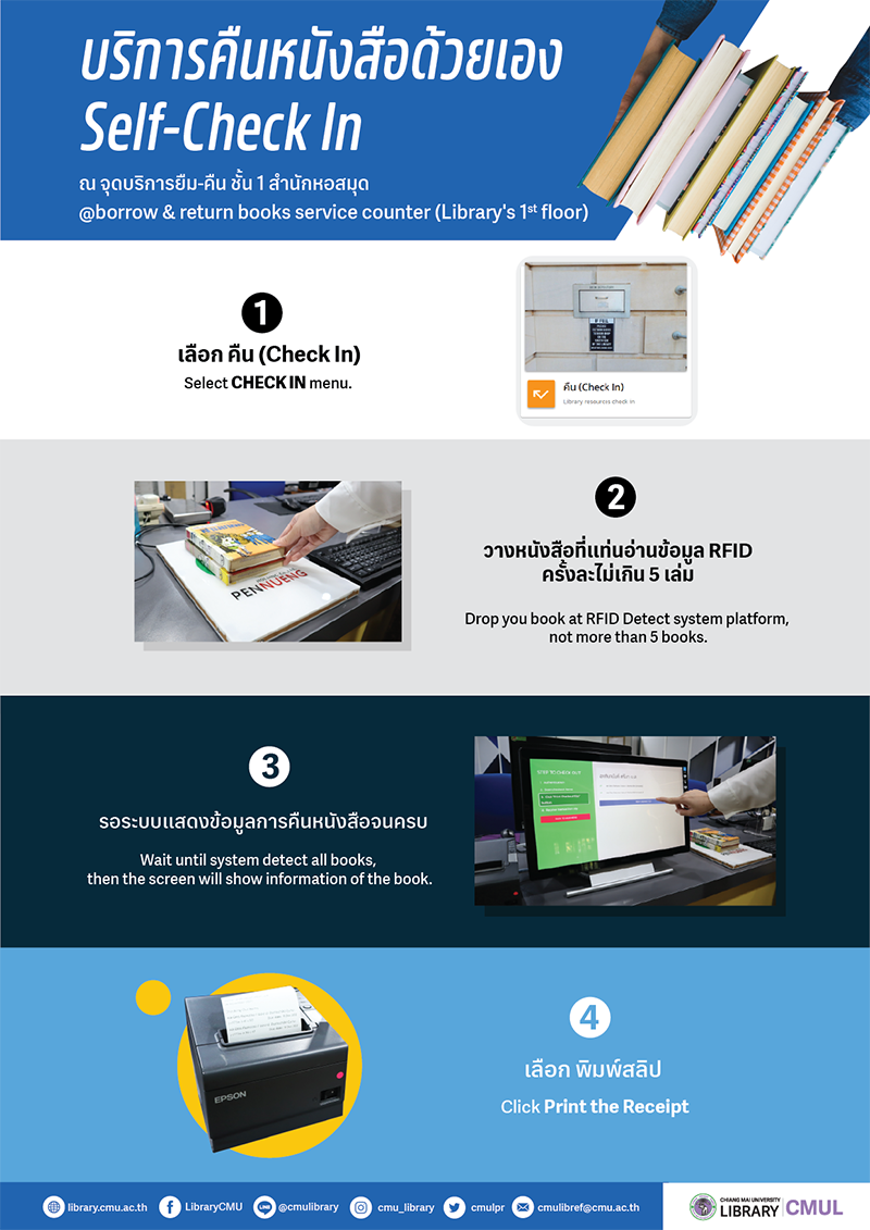 CMU library had themselves return book service (Self-Check In) at Circulation Desk.
