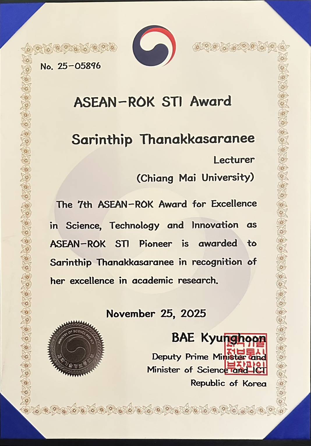 The award ceremony was held on 25 November 2025 at Gwanghwamun conference hall, Kyobo building, presided over by Mr. Koo Hyuk Chae, 1st Vice Minister of the Ministry of Science and ICT (MSIT), Republic of Korea. This honor highlights the significance of Asst. Prof. Dr. Sarinthip’s academic and research contributions, which have gained international acknowledgment—particularly her strong and sustained research collaboration with the Republic of Korea. Her achievements serve as an inspiring example for emerging researchers dedicated to advancing scientific knowledge, technological development, and innovation in the years ahead.