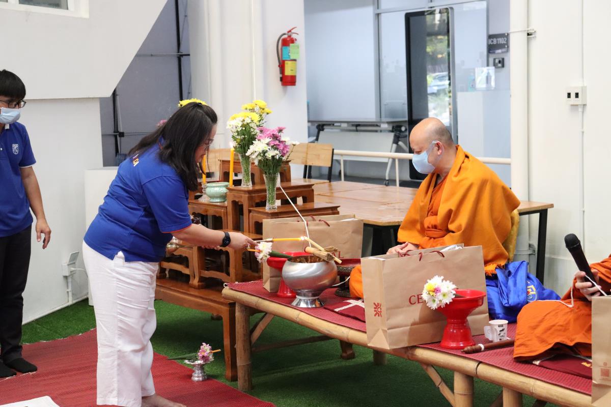 On Wednesday 11 January 2023 at 8:30 a.m., Assistant Professor Dr. Rujira Uncharoen, Dean of the International College of Digital Innovation presided over the alms-giving ceremony donated as a royal charity to offer royal merit to Her Royal Highness Princess Maha Chakri Sirindhorn Prince Patcharakitiyabha Narentira Thep Yowadee Kromluang Ratchasarinee Siriphat Maha Watcharajthida to recover from her illness and had complete strength and health. It is also a good opportunity to continue Thai traditions during the New Year with the ICDI administrators team, faculty members, and all supporting staff of the International College of Digital Innovation, including participating in the ceremony at the multipurpose yard (Green grass field) and at 08.30 hrs. joining in offering food to 9 monks at the entrance hall of the building.