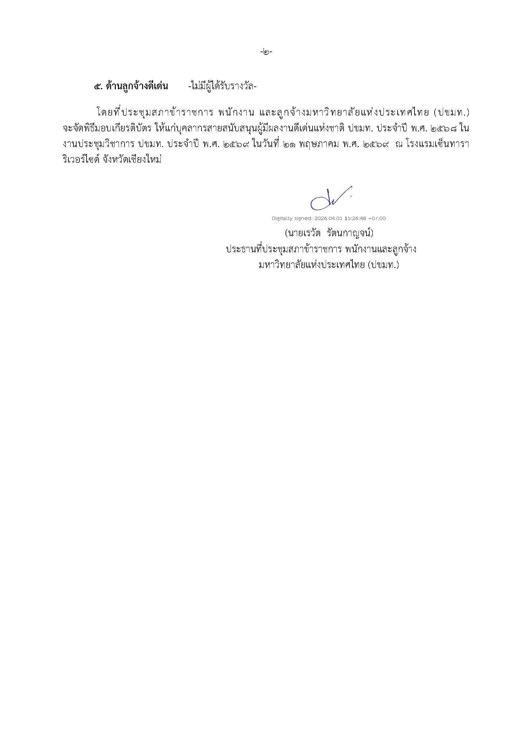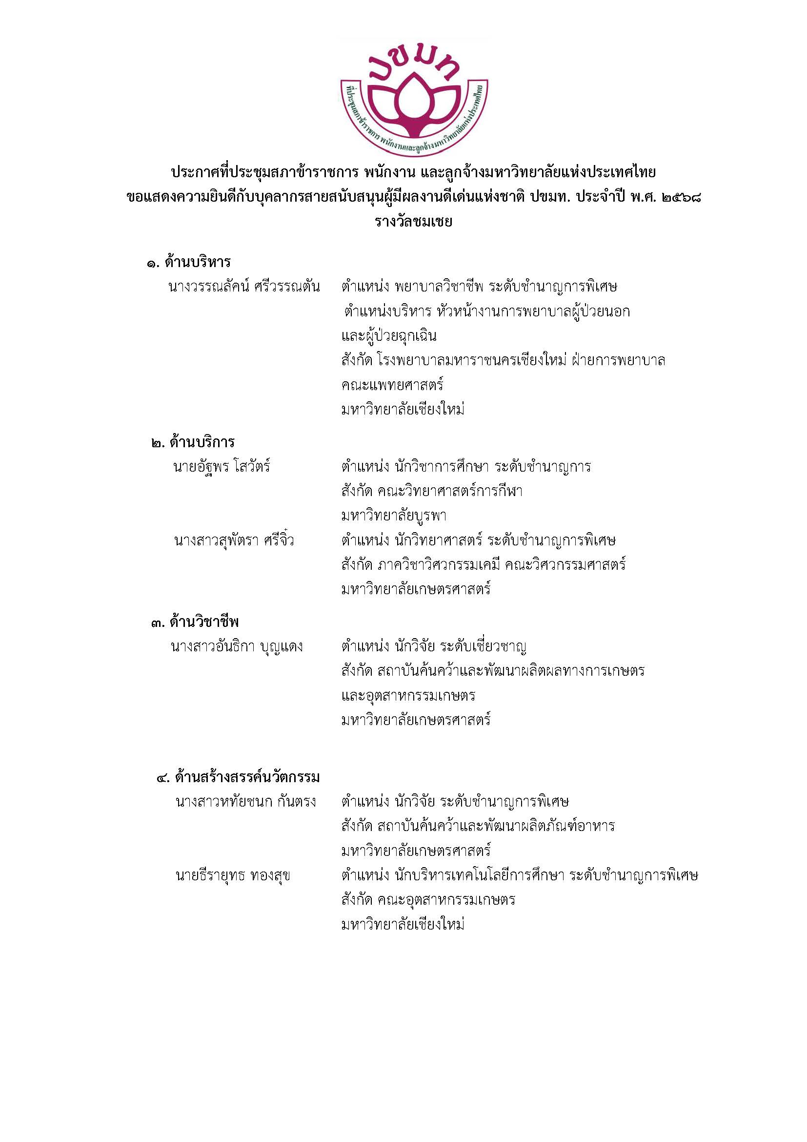 The award is organized by the Council of University Civil Servants, Employees and Staff of Thailand to recognize outstanding support personnel who have demonstrated excellence and significant contributions to the development of university systems and operations at the national level.