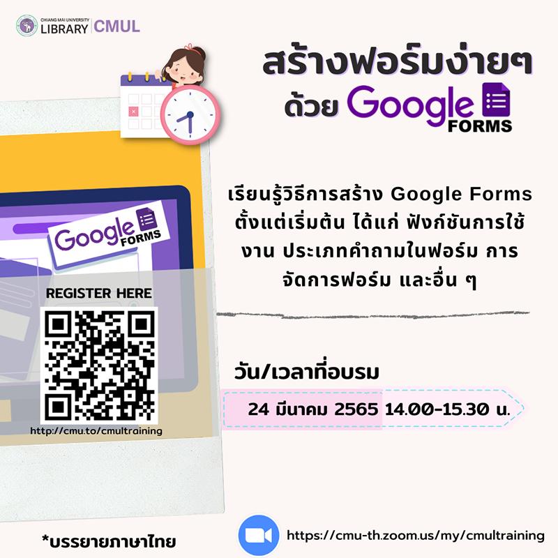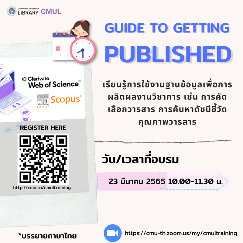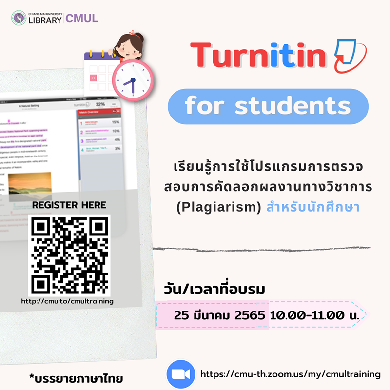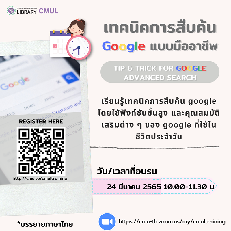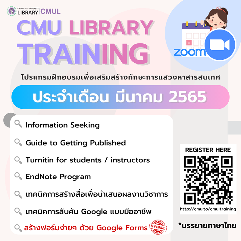 Chiang Mai University Library organizes a training program to enhance information-seeking skills (CMU Library Training) for March 2022. Through the online program Zoom as follows