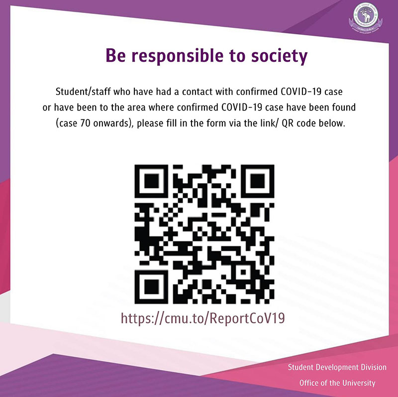Student/staff who have had a contact with confirmed COVID-19 case or have been to the area where confirmed COVID-19 case have been found (case 70 onwards), please fill in the form via the link cmu.to/ReportCoV19 or https://docs.google.com/forms/d/e/1FAIpQLSdR7-yhjpa5_--ppP1V5epCXwVdJ6f4NZa6XMt3rupUJ8pmdA/viewform QR code below and closely monitor your symptoms.
