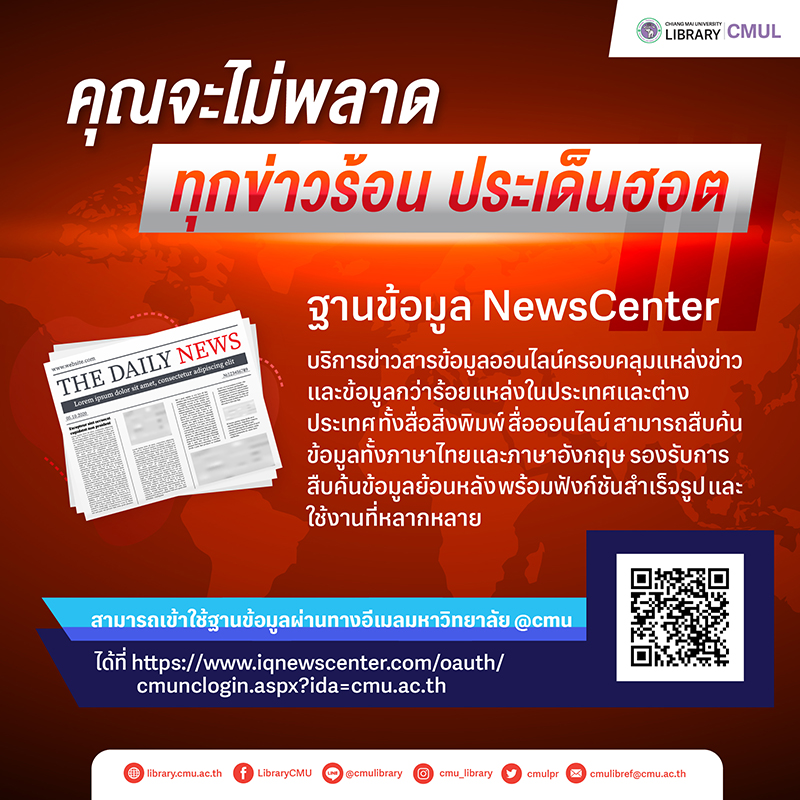 The NewsCenter database, an online news service, covers hundreds of local and international news and information sources. Both print media and online media can search for information in both Thai and English. There also supports historical data retrieval with ready-made functions. You can access the database via @cmu university e-mail https://www.iqnewscenter.com/oauth/cmunclogin.aspx?ida=cmu.ac.th.