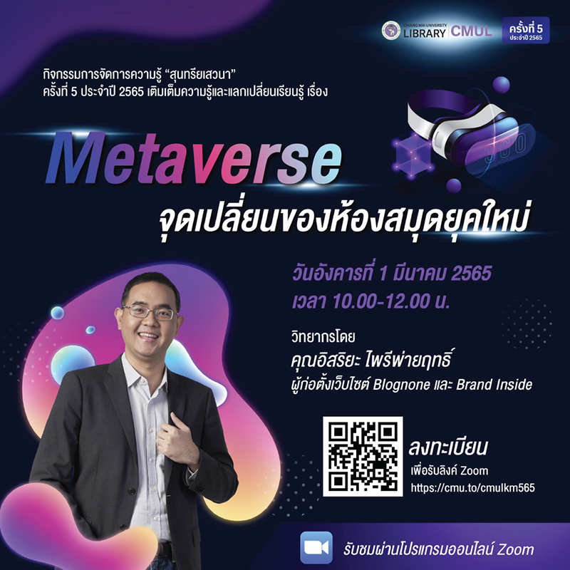 Chiang Mai University Library organizes activities for knowledge replenishment and exchanging knowledge; an aesthetic discussion entitled "Metaverse, the turning point of a new era library?" with Mr. Isriya Phairi defeated the Founder of Blognone and Brand Inside website as a speaker. On Tuesday, March 1st of 2022, from 10:00 AM to 12:00 noon via electronic media system Zoom.