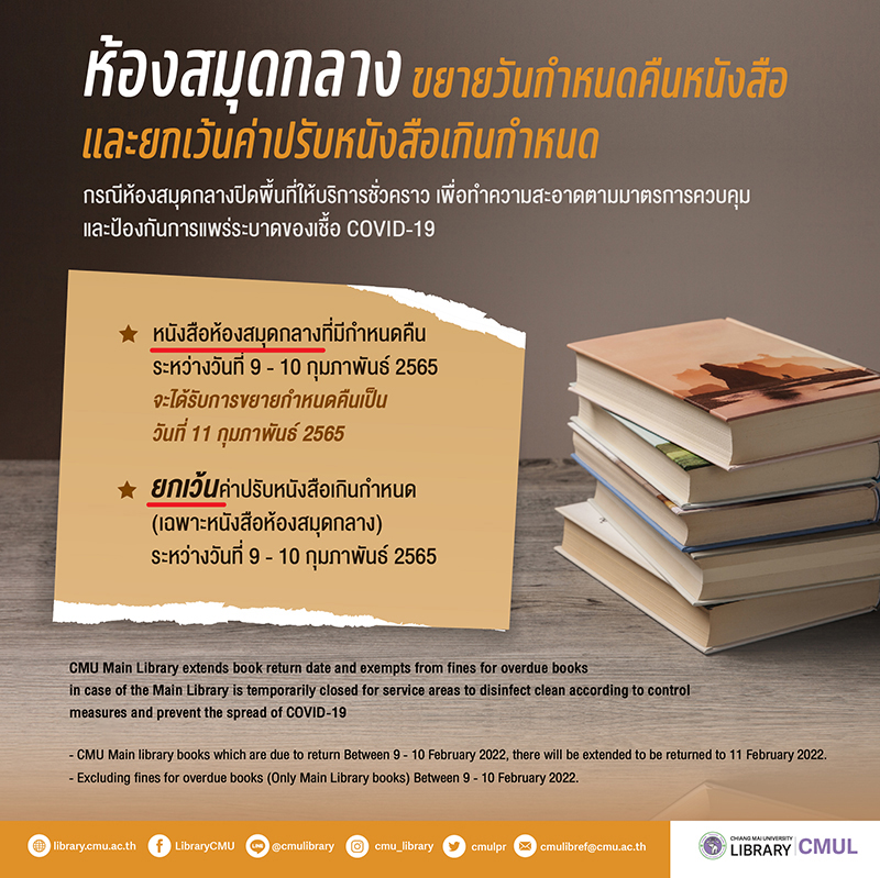 CMU Main Library extends book return date and exempts from fines for overdue books in case of the Main Library is temporarily closed for service areas to disinfect clean according to control measures and prevent the spread of COVID-19