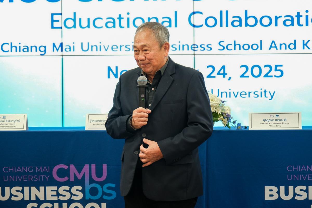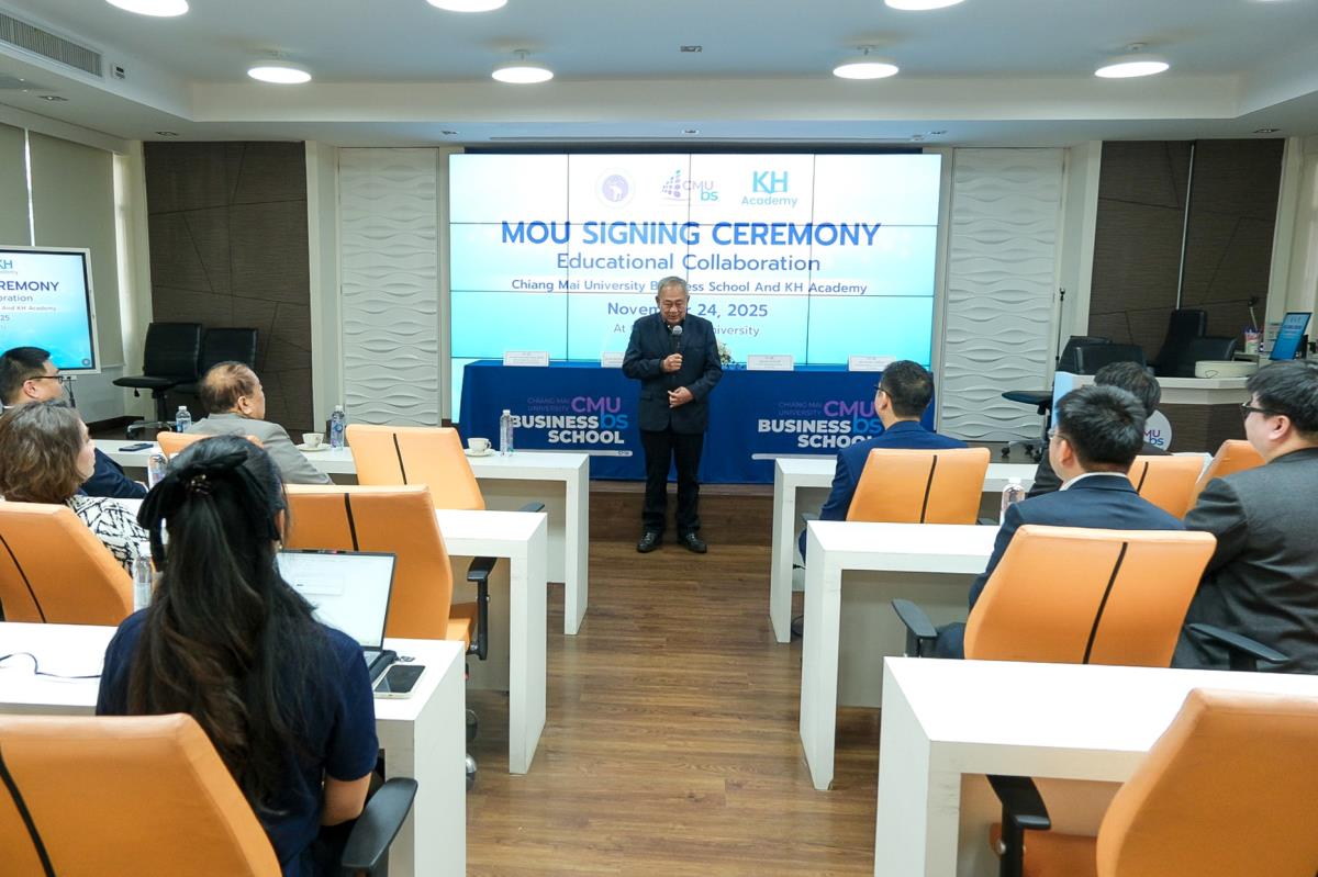 วันที่ 24 พฤศจิกายน 2568 คณะบริหารธุรกิจ มหาวิทยาลัยเชียงใหม่ (CMUBS) จัดพิธีลงนามบันทึกข้อตกลงความร่วมมือ (MOU) ระหว่างคณะบริหารธุรกิจ มหาวิทยาลัยเชียงใหม่ กับ KH Academy ณ ห้องประชุม 3 คณะบริหารธุรกิจ มหาวิทยาลัยเชียงใหม่ โดยมีคุณบูรพา สงวนวงศ์ ผู้ก่อตั้งและกรรมการผู้จัดการ KH Academy และ ผู้ช่วยศาสตราจารย์ ดร.ก้องภู นิมานันท์ คณบดีคณะบริหารธุรกิจ ให้เกียรติเป็นผู้ลงนาม โดยมีคณะผู้บริหารจากทั้ง 2 ฝ่าย พร้อมด้วย คณาจารย์และบุคลากรคณะฯ ร่วมเป็นสักขีพยานในการลงนามดังกล่าว เพื่อร่วมกันยกระดับคุณภาพการศึกษาและพัฒนาทรัพยากรมนุษย์ด้านการบัญชี การเงิน และการลงทุนอย่างเป็นระบบ