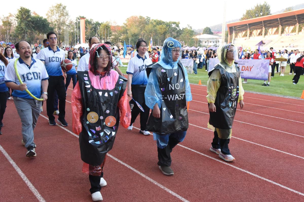 ในปีนี้ วิทยาลัยนานาชาตินวัตกรรมดิจิทัลนำเสนอขบวนพาเหรดภายใต้แนวคิด "Zero E-Waste Hero: พลิกฟื้นขยะดิจิทัล สู่พลังสร้างสรรค์ที่ยั่งยืน” ซึ่งนำเสนอแนวคิดการจัดการขยะอิเล็กทรอนิกส์ (E-Waste) ด้วยการนำเศษซากเทคโนโลยีมาสร้างสรรค์อุปกรณ์เชียร์ผ่านกระบวนการ Upcycling สะท้อนมุมมองว่านวัตกรรมคือการสร้างคุณค่าจากสิ่งเดิม สอดคล้องกับเป้าหมายการพัฒนาที่ยั่งยืน (SDG 12) และแสดงจุดยืนของ ICDI ในการขับเคลื่อนนวัตกรรมดิจิทัลควบคู่กับการใส่ใจสิ่งแวดล้อม ผ่านพลังแห่งกีฬาและความสามัคคี