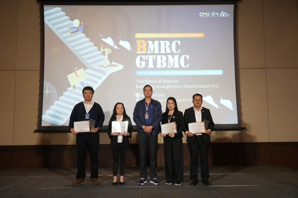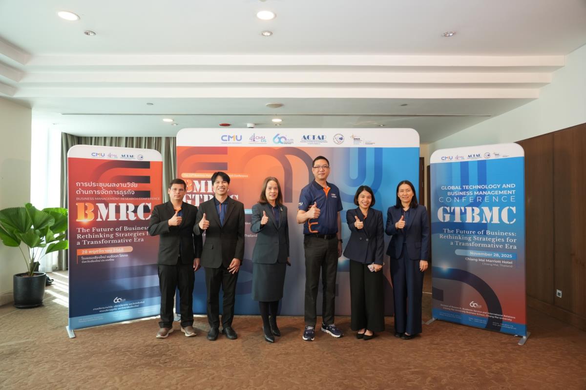 วันที่ 28 พฤศจิกายน 2568 คณะบริหารธุรกิจ มหาวิทยาลัยเชียงใหม่ จัดประชุมผลงานวิจัยด้านการจัดการธุรกิจระดับชาติและนานาชาติ (BMRC & GTBMC) ประจำปี 2568 ภายใต้ธีม “The Future of Business: Rethinking Strategies for a Transformative Era” เปิดเวทีให้นักวิจัยจากไทยและต่างประเทศนำเสนอผลงานแลกเปลี่ยนองค์ความรู้กว่า 40 บทความ จาก 6 ประเทศ มีผู้เข้าร่วมงานกว่า 160 คน โดยร่วมจัดกับสมาคมสำนักงานบัญชีคุณภาพ สมาคมสำนักงานสอบบัญชีไทย และ BINUS University Business School จัดงานขึ้น ณ โรงแรมเชียงใหม่ แมริออท
