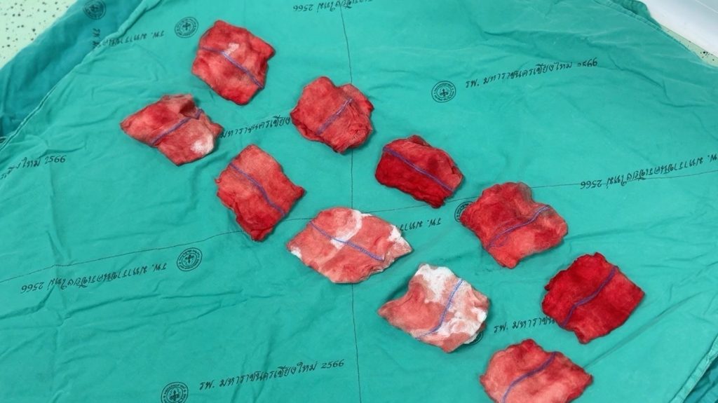 รศ.นพ.นเรนทร์ โชติรสนิรมิต คณบดีคณะแพทยศาสตร์ มช. เปิดเผยว่า “โรงพยาบาลมหาราชนครเชียงใหม่ เป็นโรงพยาบาลมหาวิทยาลัย ระดับตติยภูมิ รับผู้ป่วยที่มีความยุ่งยากซับซ้อนจาก 8 จังหวัดภาคเหนือตอนบน มีจำนวนการผ่าตัดมากถึง 16,000-17,000 รายต่อปี ต้องเผชิญกับความท้าทายสำคัญในการดูแลผู้ป่วยที่มีความซับซ้อนของโรคและความเสี่ยงสูงต่อการเสียเลือดจำนวนมาก ปัญหาการประเมินการเสียเลือดระหว่างผ่าตัดที่ไม่แม่นยำส่งผลกระทบโดยตรงต่อผู้ป่วยผ่าตัดทุกราย โดยเฉพาะผู้ป่วยผ่าตัดใหญ่เปลี่ยนถ่ายอวัยวะ (ตับ ไต) ผ่าตัดอุบัติเหตุ-ฉุกเฉิน ผ่าตัดนรีเวช-สูติกรรม ผ่าตัดมะเร็ง และผ่าตัดหลอดเลือด เป็นต้น การสูญเสียเลือดระหว่างผ่าตัดเฉลี่ยอยู่ที่ 300–500 มิลลิลิตรต่อราย และในบางรายอาจสูงกว่า 1,500 มิลลิลิตร ตัวเลขเหล่านี้ไม่ได้เป็นเพียงข้อมูลทางสถิติ แต่สะท้อนความจริงทางคลินิกที่การประเมินปริมาณเลือดอย่างแม่นยำสามารถเป็นเส้นแบ่งระหว่างความปลอดภัยกับภาวะวิกฤต ปัจจุบันการประเมินส่วนใหญ่ยังอาศัยการคาดคะเนด้วยสายตา ซึ่งมีความคลาดเคลื่อนสูงถึง 20–40 เปอร์เซ็นต์ หากประเมินการเสียเลือดต่ำกว่าความเป็นจริง (Under- Estimation) ทำให้มีการตัดสินใจทดแทนสารน้ำหรือให้เลือดล่าช้าและให้น้อยเกินไป (Under-transfusion) ทำให้สูญเสีย Golden Hour ในการรักษา ผู้ป่วยอาจเสี่ยงต่อความดันโลหิตตก ช็อกหรืออวัยวะสำคัญ เช่น หัวใจ ตับ ไตขาดเลือดและออกซิเจนไปเลี้ยง ขณะที่การประเมินการเสียเลือดมากกว่าความเป็นจริง (Over- Estimation) มีการให้สารน้ำและเลือดทดแทนเกินความจำเป็น (Over-transfusion) ผู้ป่วยอาจเสี่ยงภาวะแทรกซ้อนแพ้เลือด (Transfusion reaction) ปอดและหัวใจทำงานมากผิดปกติ การประเมินที่คลาดเคลื่อนไม่แม่นยำ อาจมีผลให้ผู้ป่วยมีภาวะแทรกซ้อน ต้องนอนโรงพยาบาล เพื่อรักษาตัวนานขึ้นและมีค่าใช้จ่ายการรักษาเพิ่มขึ้น สำหรับการลืมวัสดุซับเลือดตกค้างไว้ในร่างกายผู้ป่วย (Retained Surgical Item) ผู้ป่วยต้องผ่าตัดซ้ำ เพื่อเอาวัสดุซับเลือดออก เสี่ยงต่อการติดเชื้อ มีภาวะแทรกซ้อนรุนแรง เสี่ยงทางกฎหมาย และค่าชดเชยรักษาโรงพยาบาลอาจถูกฟ้องร้องเกิดภาพลักษณ์ของโรงพยาบาลที่เสียหายได้