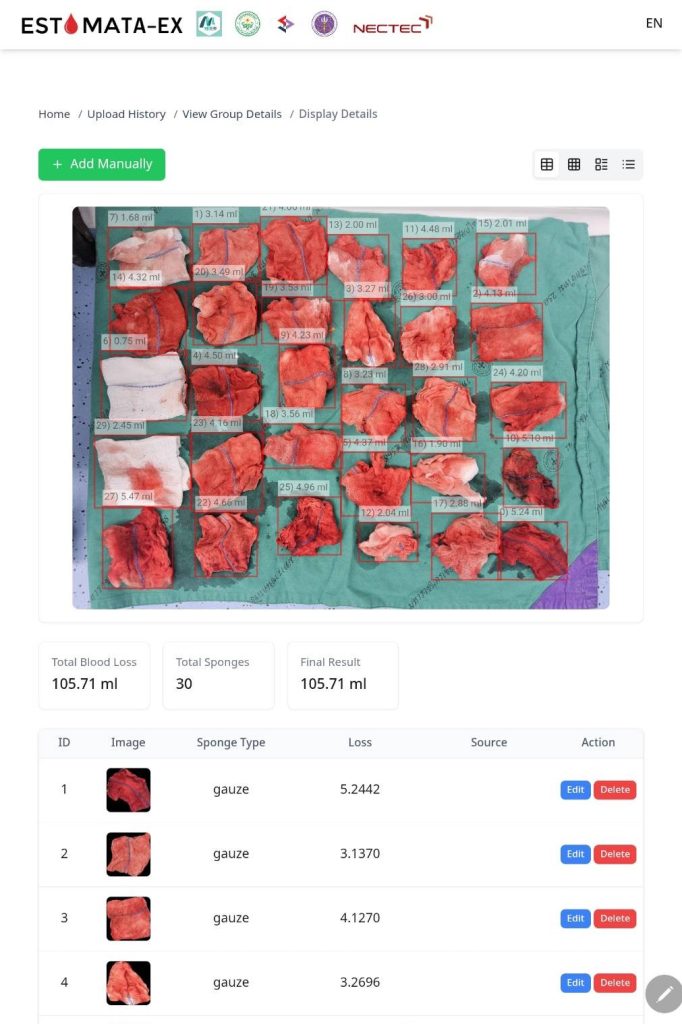 ESTIMATA-EX เป็นระบบประเมินปริมาณการเสียเลือดและนับจำนวนวัสดุซับเลือดในห้องผ่าตัดด้วย AI-Driven จากภาพถ่ายวัสดุซับเลือดผ่านสมาร์ทโฟนหรือแท็บเล็ตได้เป็นแห่งแรกในประเทศไทย (Technology Readiness Level: TRL 7-8) ที่เชื่อมโยงการทำงานผ่านเทคโนโลยีปัญญาประดิษฐ์ เป็น Digital Service Innovation ที่เปลี่ยนวิธีคิด วิธีกระบวนการทำงาน และวิธีดูแลผู้ป่วยแบบใหม่ เปลี่ยนการคาดคะเนด้วยสายตาและการรับรู้แต่ละบุคคลให้กลายเป็นข้อมูล AI ที่แม่นยำสูง รวดเร็วในระดับวินาที ใช้หลักการพัฒนาคุณภาพแบบบูรณาการ CQI, PDSA Cycles, LEAN และ Design Thinking