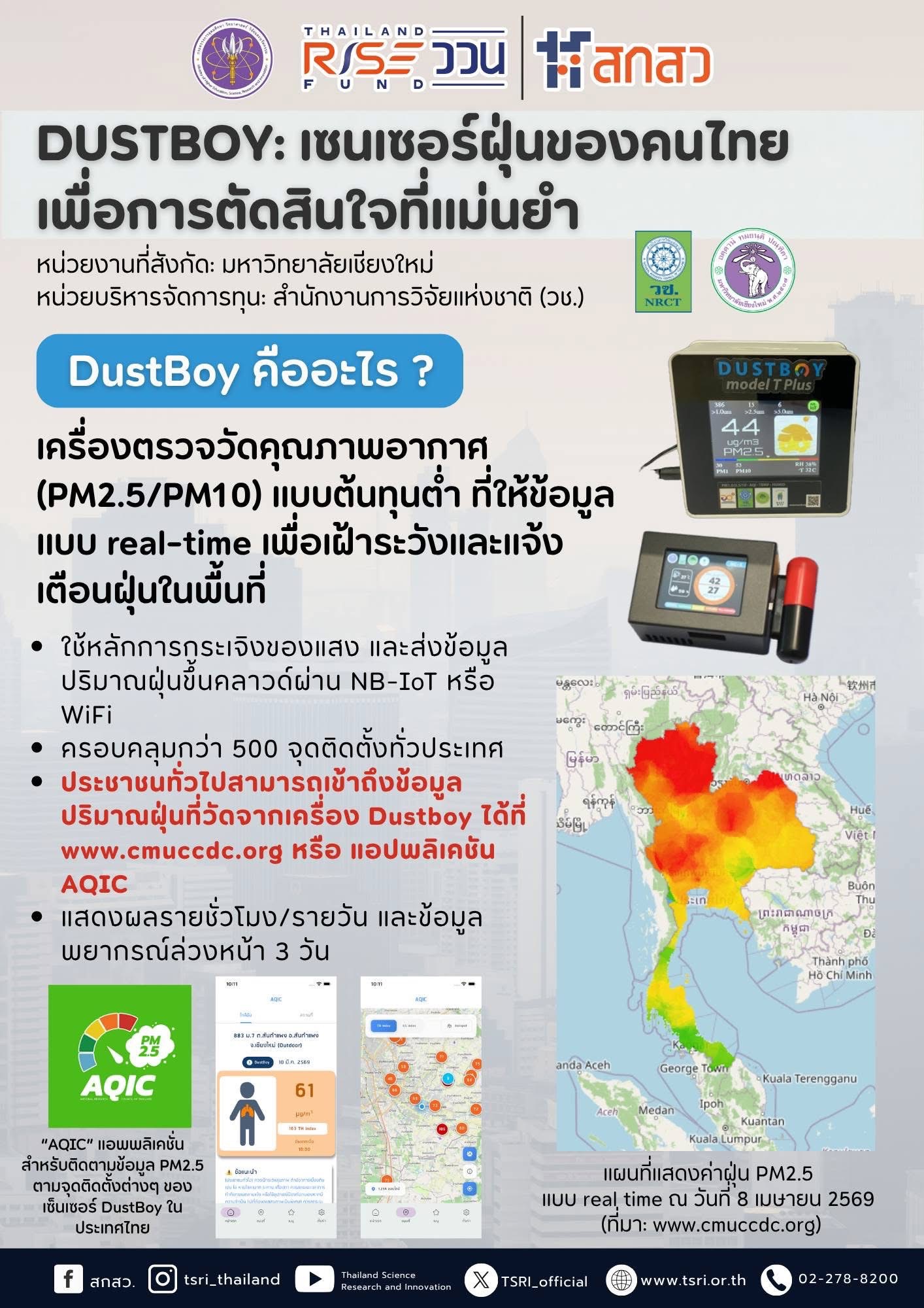 - DustBoy — เซนเซอร์ฝุ่นต้นทุนต่ำ ครอบคลุมกว่า 500 จุดทั่วประเทศ แสดงผล PM2.5 แบบ Real-time พร้อมพยากรณ์ล่วงหน้า 3 วัน ผ่านแอปฯ AQIC และเว็บไซต์ www.cmuccdc.org