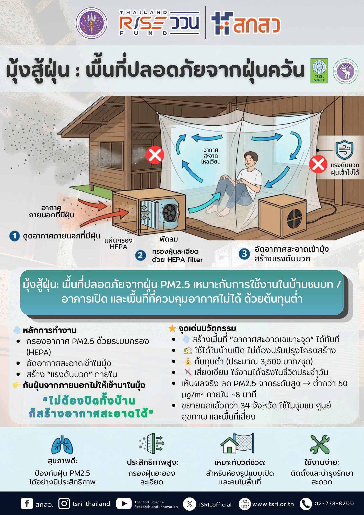 - มุ้งสู้ฝุ่น — พื้นที่ปลอดภัยจากฝุ่น PM2.5 ต้นทุนต่ำเพียง ~3,500 บาท/ชุด ใช้ระบบกรอง HEPA สร้างแรงดันบวกภายในมุ้ง ลด PM2.5 จากระดับสูงสู่ต่ำกว่า 50 ?g/m? ภายใน ~8 นาที เหมาะสำหรับบ้านชนบทและอาคารเปิด ขยายผลแล้วกว่า 34 จังหวัด