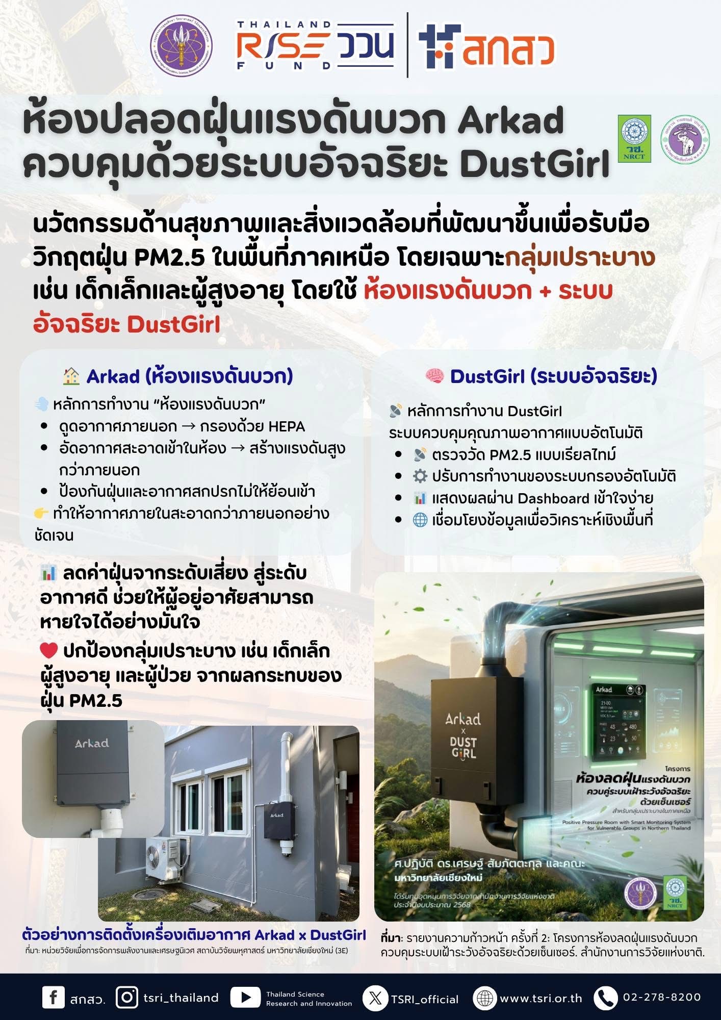 - Arkad x DustGirl — ห้องปลอดฝุ่นแรงดันบวก ควบคุมด้วยระบบอัจฉริยะแบบ Real-time เหมาะสำหรับกลุ่มเปราะบาง เช่น เด็กเล็ก ผู้สูงอายุ และผู้ป่วยในพื้นที่ภาคเหนือ